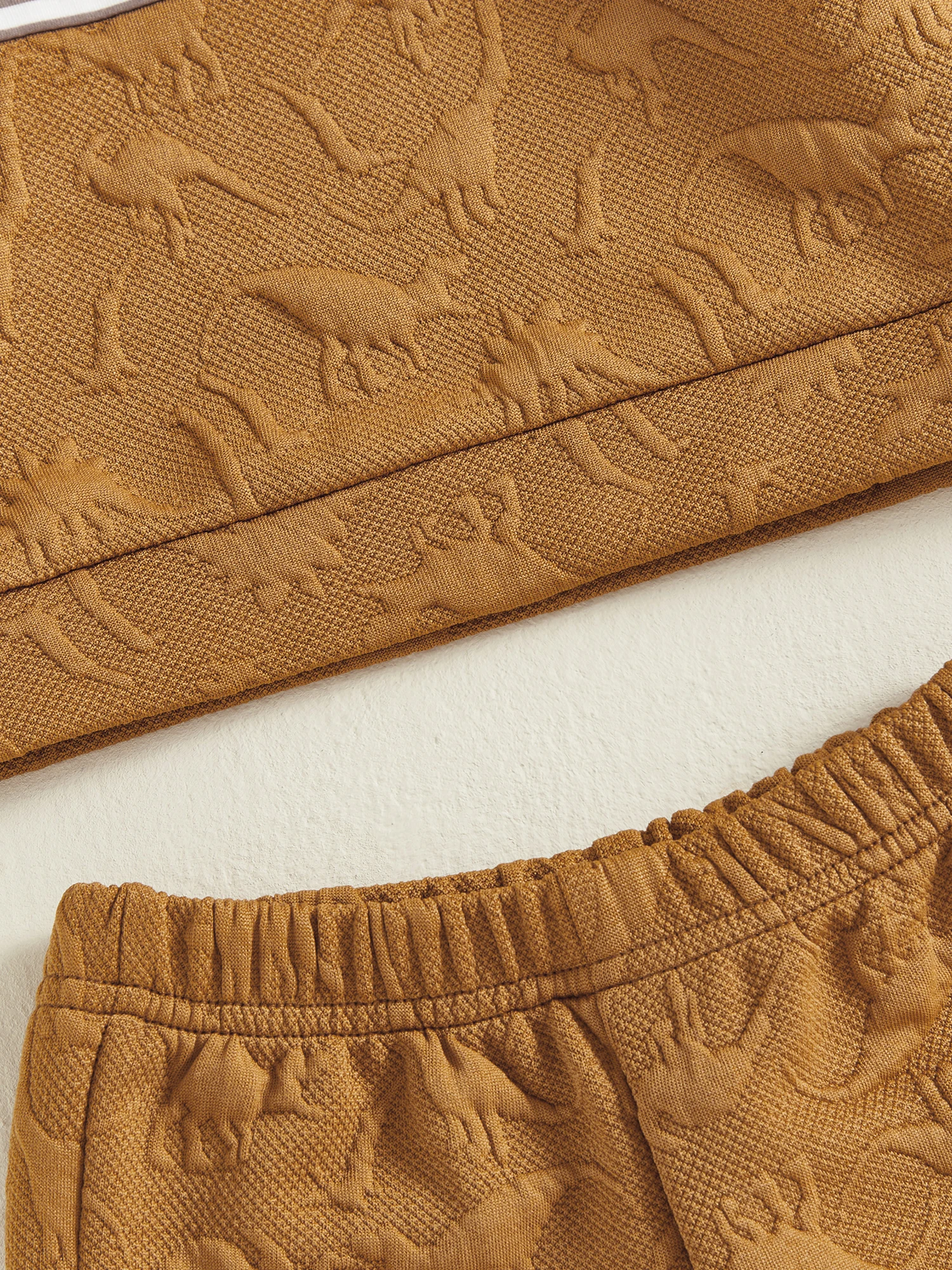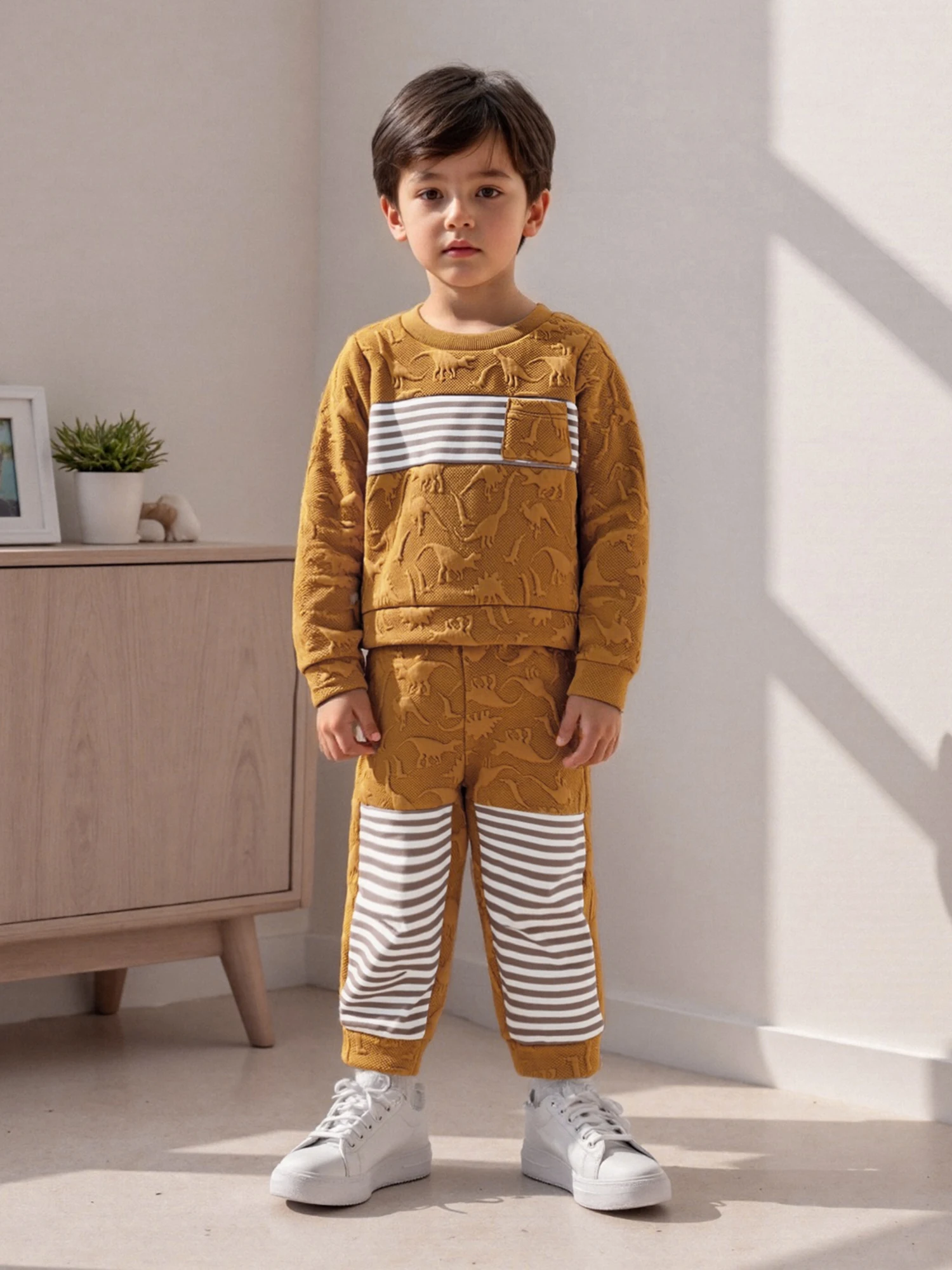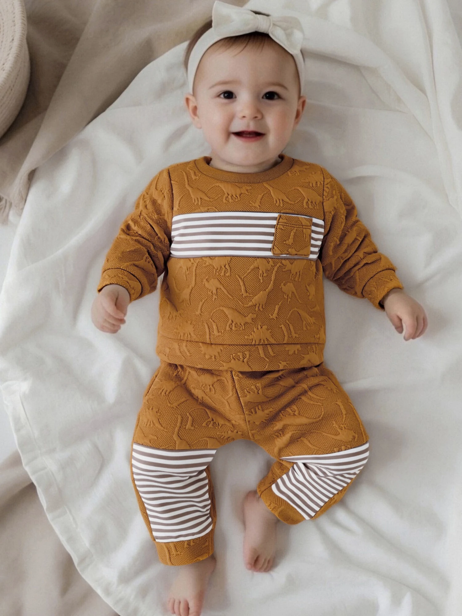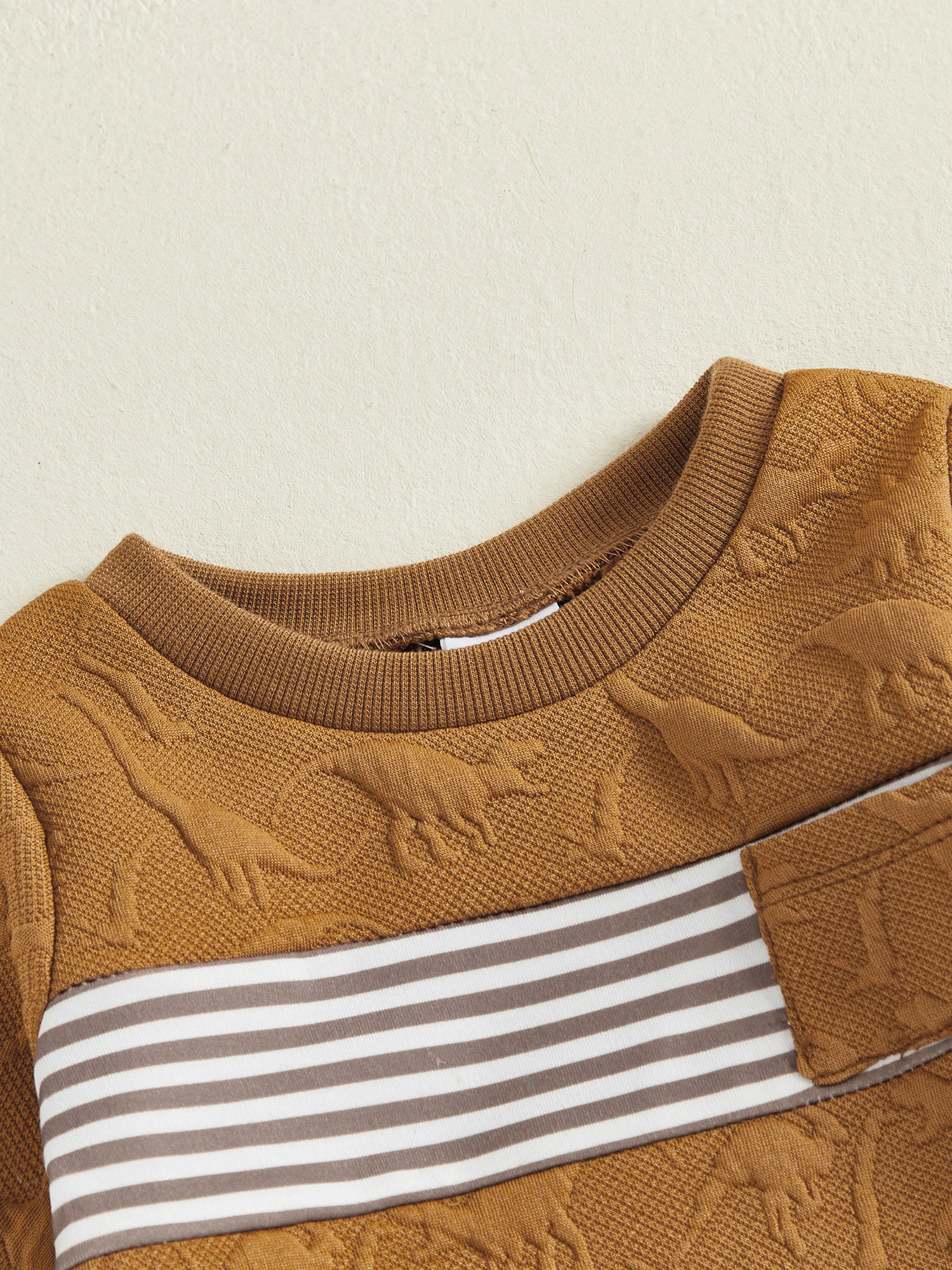 Conjunto de 2 piezas de trajes a rayas de otoño para niño pequeño de 0 a 3 años, jersey de cuello redondo de manga larga de Jacquard de dinosaurio + pantalones de cintura elástica