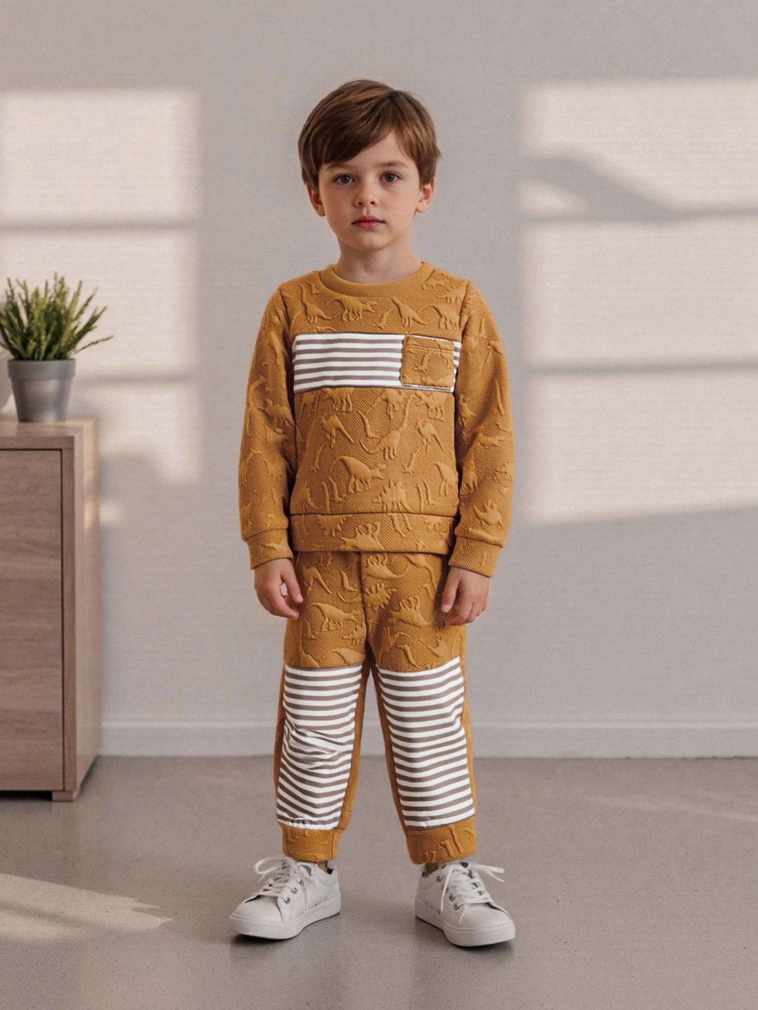 Especificaciones: Material: 95% poliéster y 5% elastano Género aplicable: niño Rango de edad aplicable: niños Estilo: Estilo casual Color caqui Patrón: rayas y jacquard de dinosaurio.
