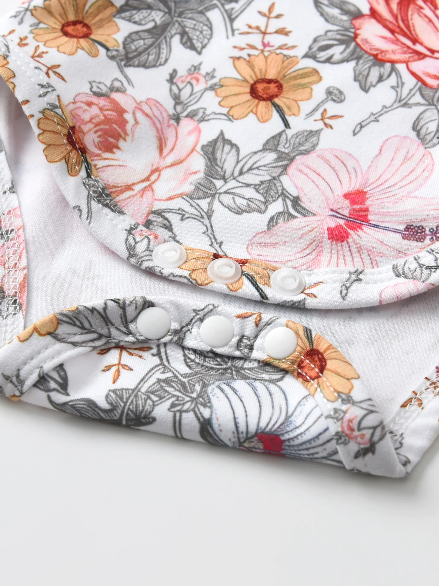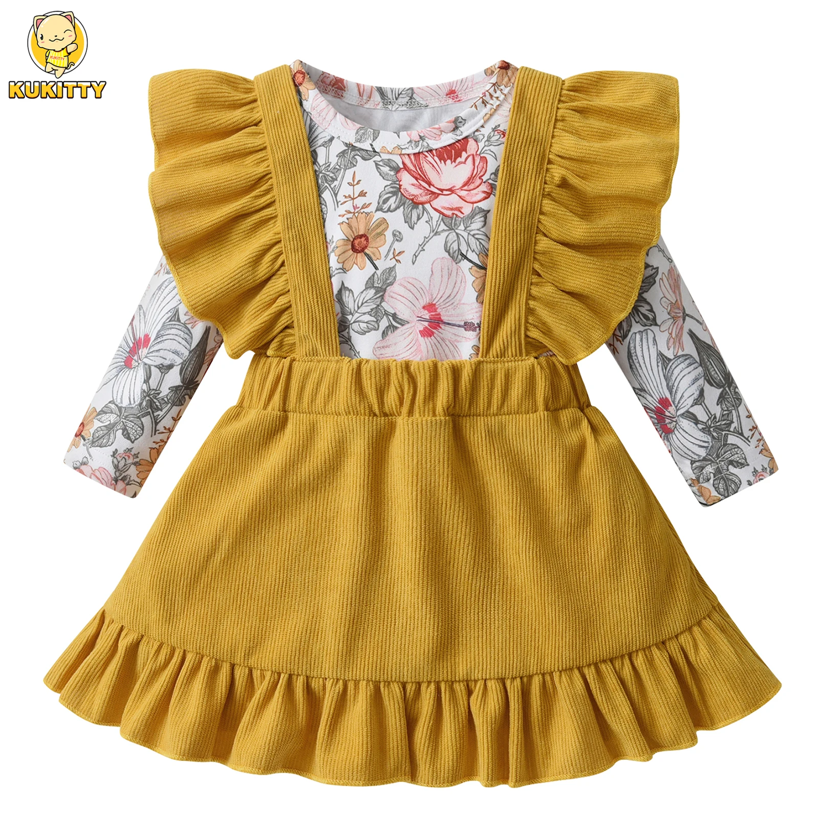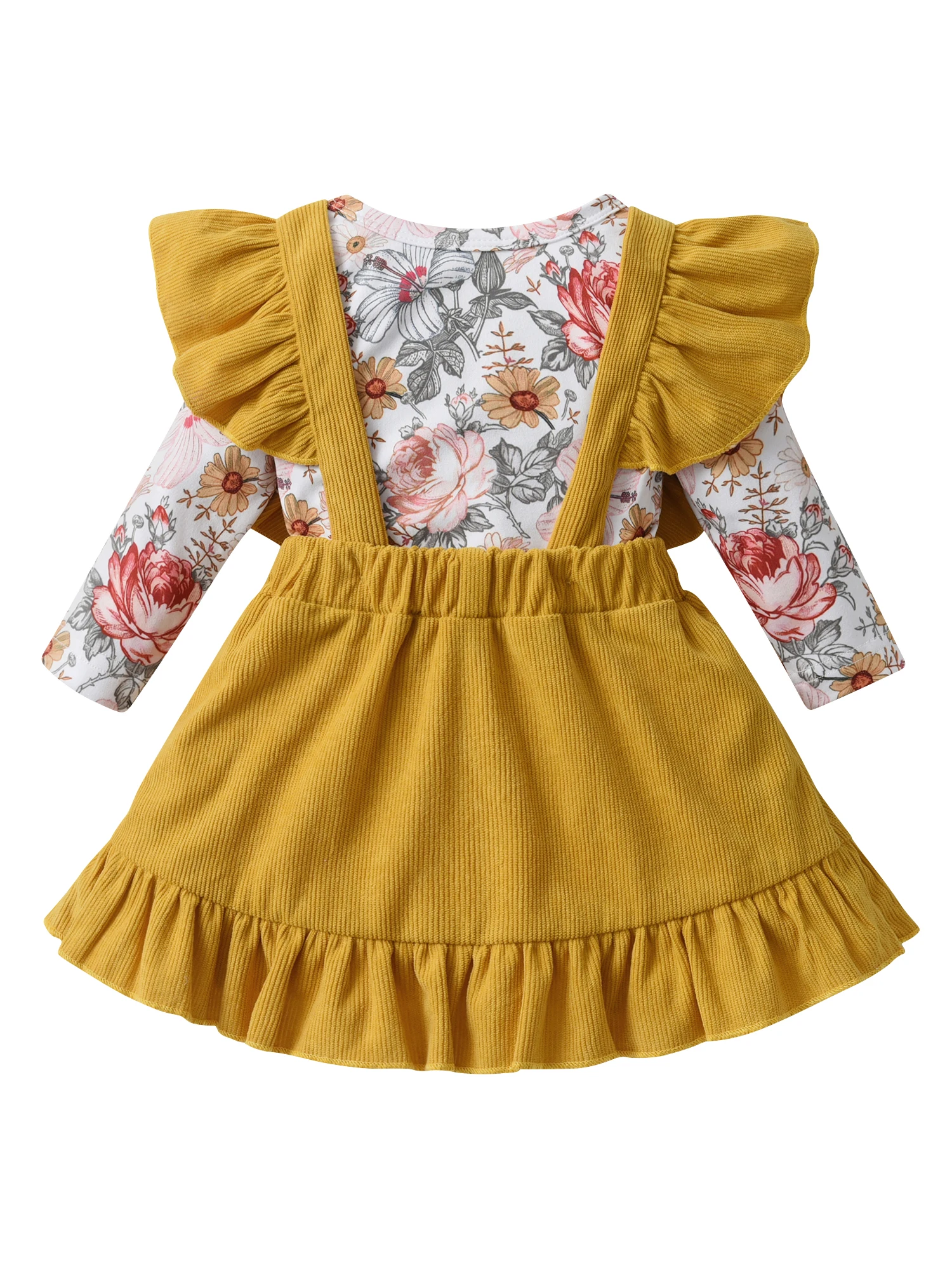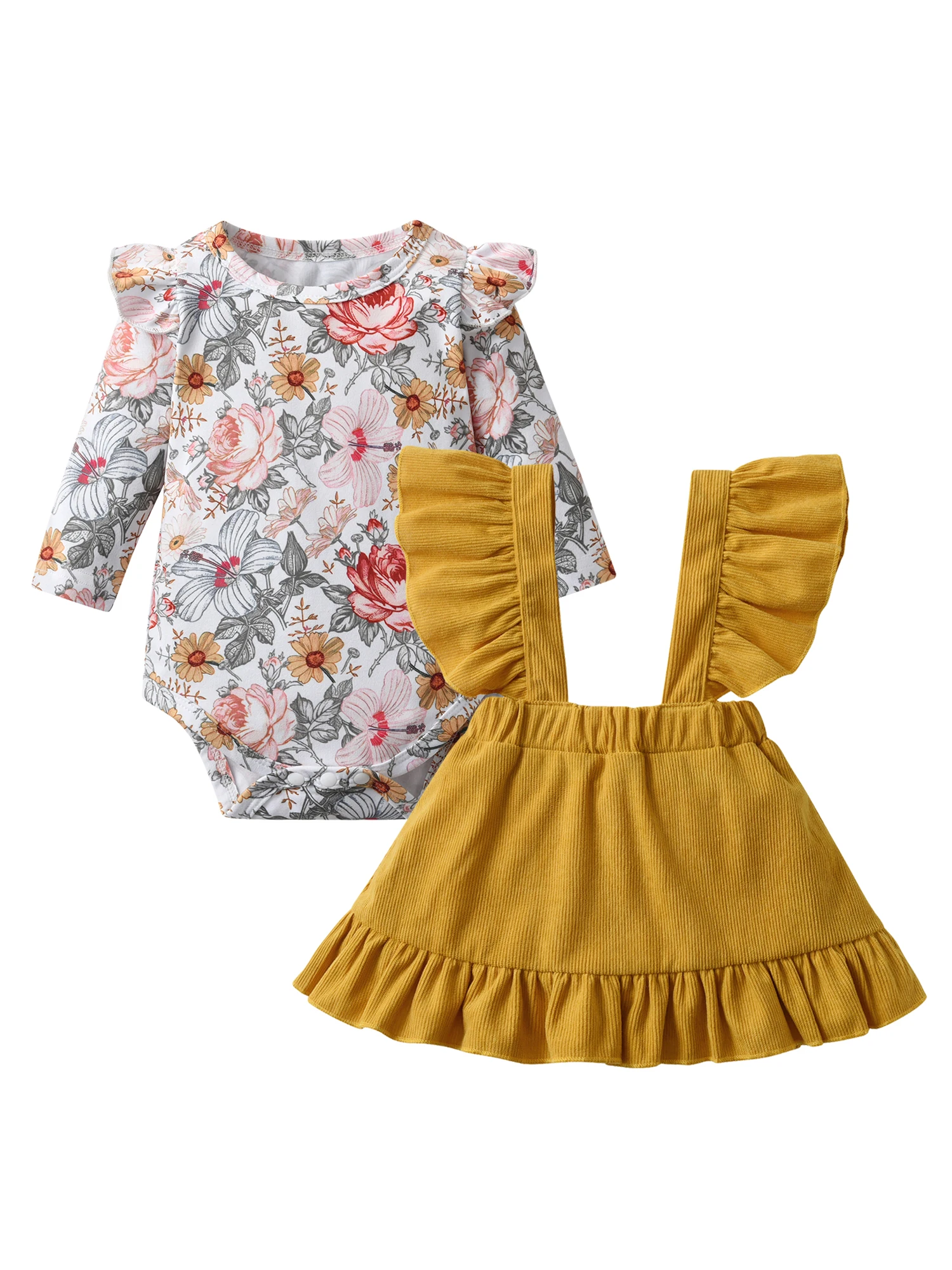 Comprar Conjunto de 2 uds de mono Floral de manga larga para niña recién nacida y vestido frontal con ribete de volantes, conjunto de ropa bonita