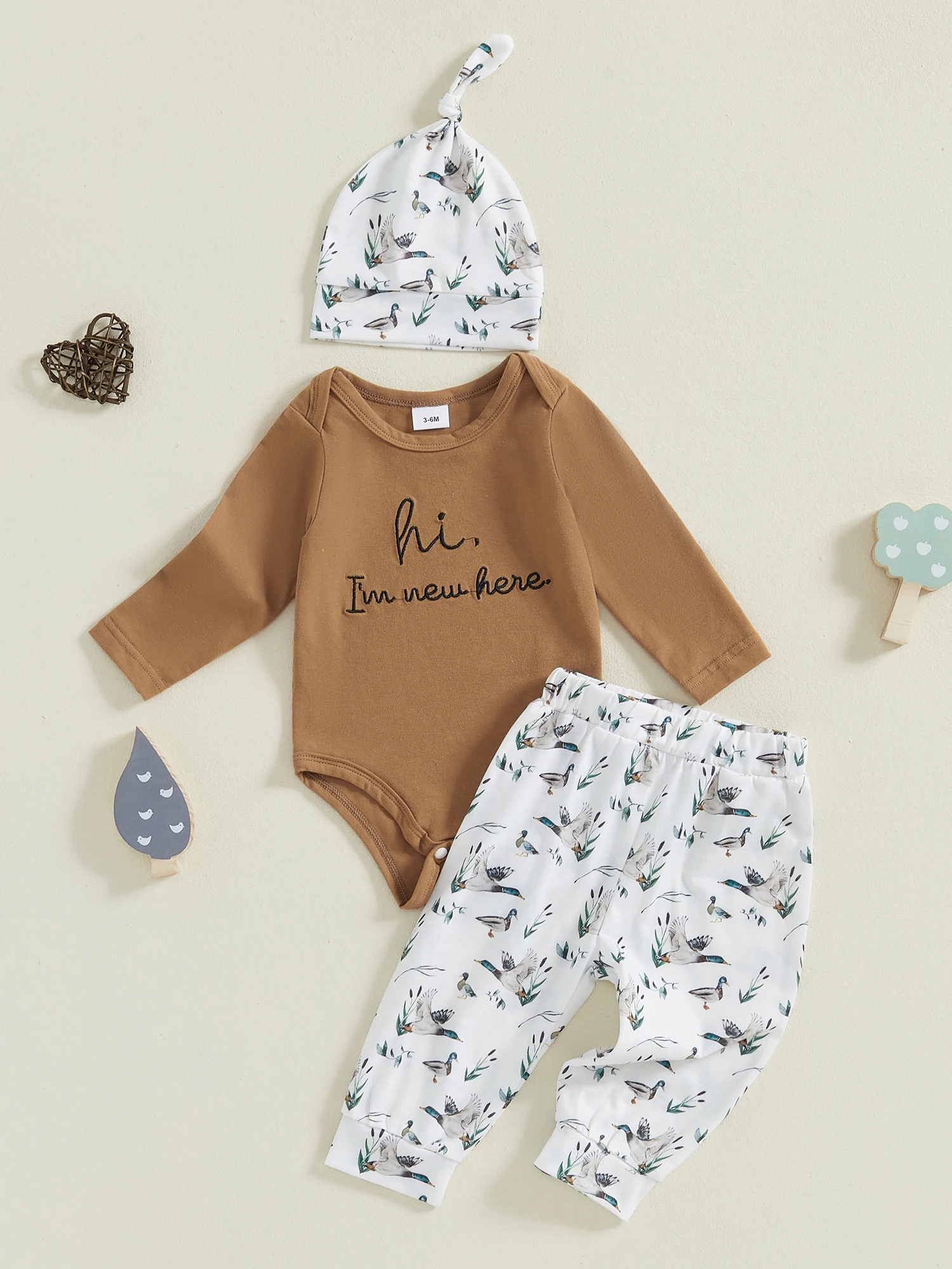 Conjuntos de ropa para bebés de 3, mameluco de manga larga con cuello redondo y bordado de letras, pantalones con estampado de pato, conjuntos de sombreros