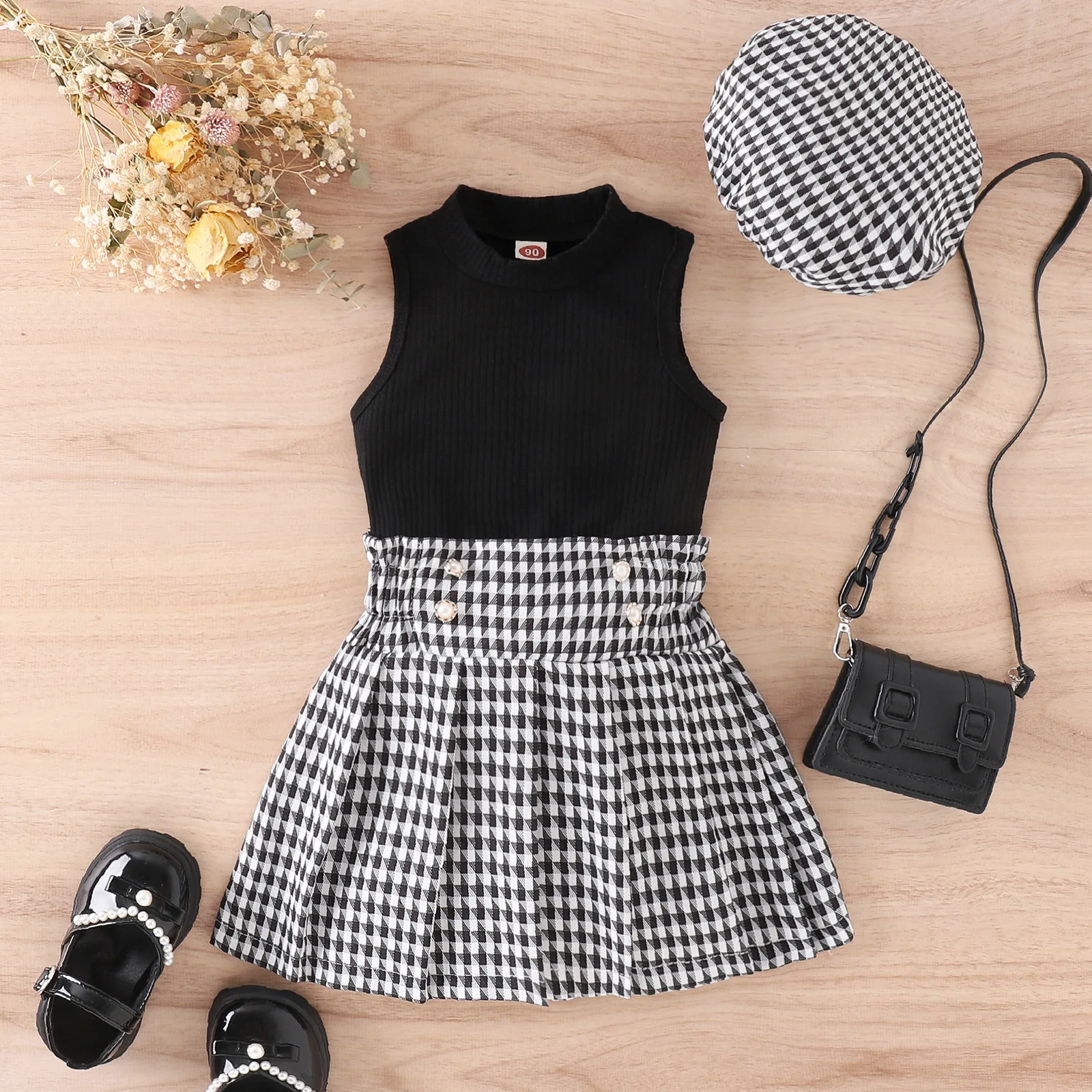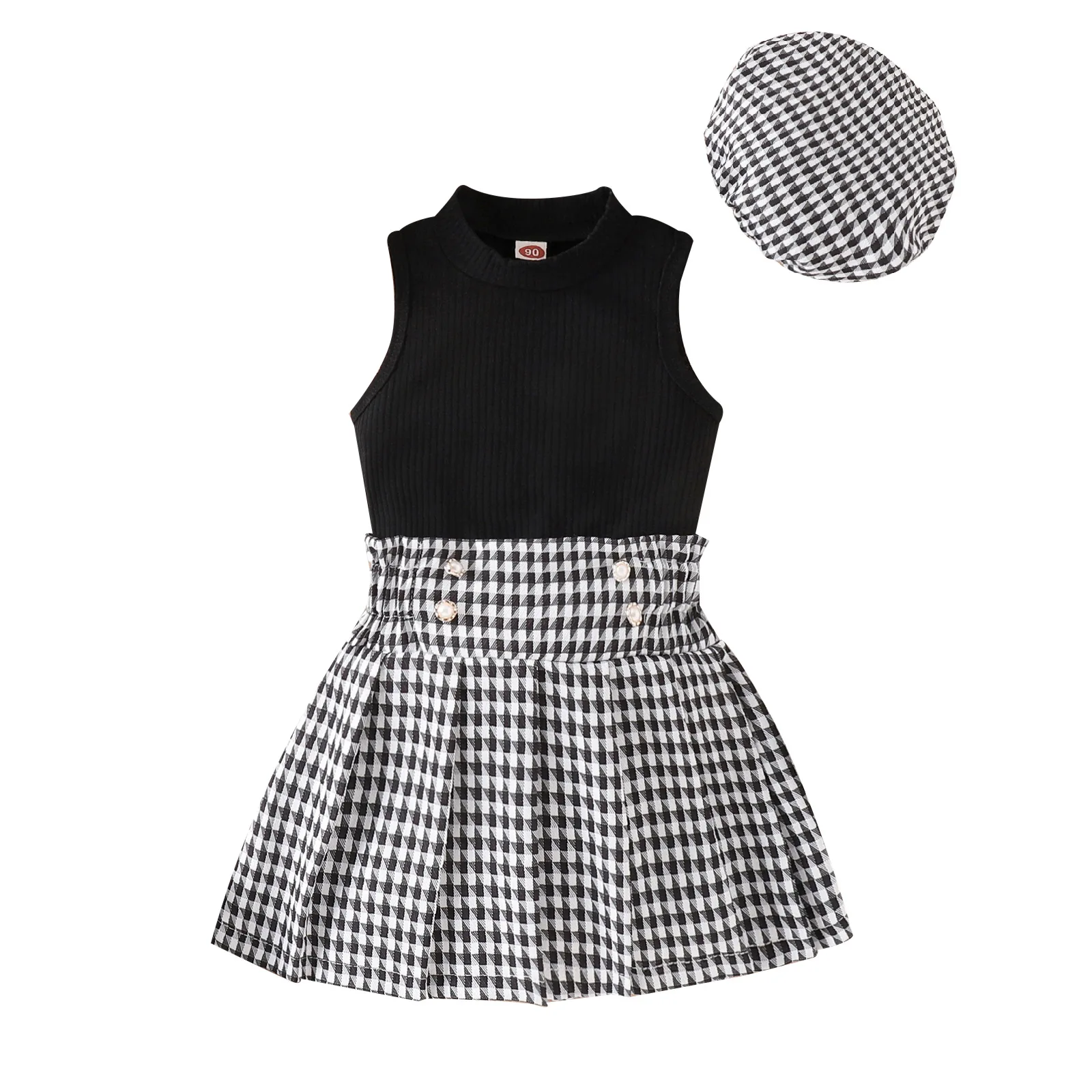 Conjunto de 3 piezas para niña, ropa coreana, Tops sin mangas sólidos, pantalones cortos a cuadros y sombrero, ropa de Boutique para bebé, BC296