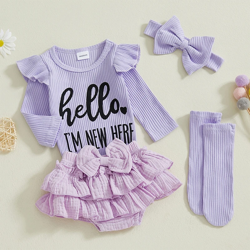 Comprar Conjunto de 4 piezas para niñas, pelele de manga larga con volantes y estampado de letras y faldas pantalón en capas, diadema, calcetines, ropa