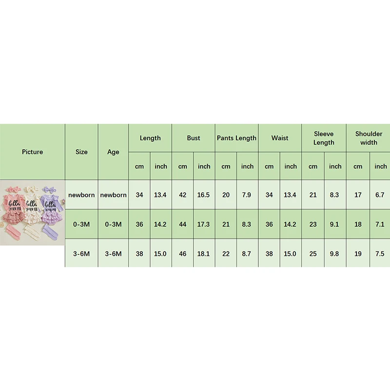 Conjunto lindo para niñas con estampado de letras y volantes, mameluco de manga larga y pantalones cortos en capas, calcetines con diadema, ropa de 4 piezasCaracterísticasMameluco para niña con estampado de letras, volantes, manga larga, diseño de cuello redondo; Falda de bebé con pantalones cortos, dobladillo en capas, lindo lazo, cintura elástica; Y lindo conjunto de diadema y calcetines; Simple pero a la moda, haz que tu bebé sea tan lindoAdecuado para uso diario casual, juegos al aire libre, bodas, vacaciones, fiestas de cumpleaños, reuniones familiares, fotografía.Recién nacido Longitud del mameluco: 34 Busto: 42 Manga: 21 Hombro: 17 Longitud de los pantalones cortos: 20 Cintura: 34 Edad recomendada: Recién nacido0-3M Longitud del mameluco: 36 Busto: 44 Manga: 23 Hombro: 18 Longitud de los pantalones cortos: 21 Cintura: 36 Edad recomendada: 0-3 meses3-6M Longitud del mameluco: 38 Busto: 46 Manga: 25 Hombro: 19 Longitud de los pantalones cortos: 1 Cintura: 38 Edad recomendada: 3-6 mesesTamaño (pulgadas)Recién nacido Longitud del mameluco: 13.39 Busto: 16.54 Manga: 8.27 Hombro: 6.69 Longitud de los pantalones cortos: 7.87 Cintura: 13.39 Edad recomendada: Recién nacido0-3M Longitud del mameluco: 14.17 Busto: 17.32 Manga: 9.06 Hombro: 7.09 Longitud de los pantalones cortos: 8.27 Cintura: 14.17 Edad recomendada: 0-3 meses3-6M Longitud del mameluco: 14.96 Busto: 18.11 Manga: 9.84 Hombro: 7.48 Longitud de los pantalones cortos: 0.39 Cintura: 14.96 Edad recomendada: 3-6 mesesEspecificaciónCondición: 100% nuevoMaterial: 65% algodón 35% poliésterEstilo: ModaGénero: niñaTemporada: OtoñoPatrón: estampado de letrasManga: manga largaOcasiones: Interior, ExteriorEl paquete incluye:1 * mameluco de bebé1 * falda1 * diadema1 par de calcetinesNota:Puede haber una desviación de 1 a 2 cm en diferentes tamaños, ubicaciones y estiramiento de las telas.La tabla de tallas es solo como referencia; Puede haber una pequeña diferencia con lo que obtienes.El color puede ser más claro o más oscuro debido a las diferentes pantallas de PC.
