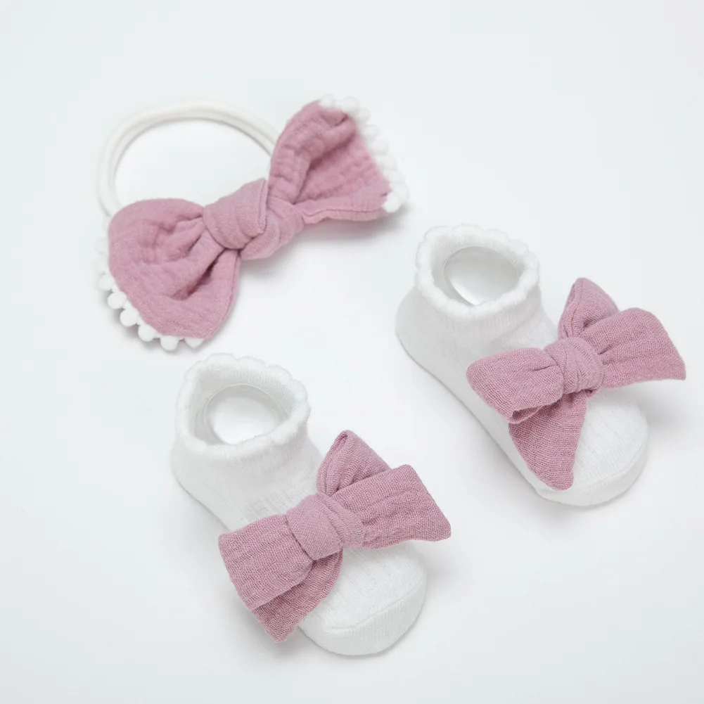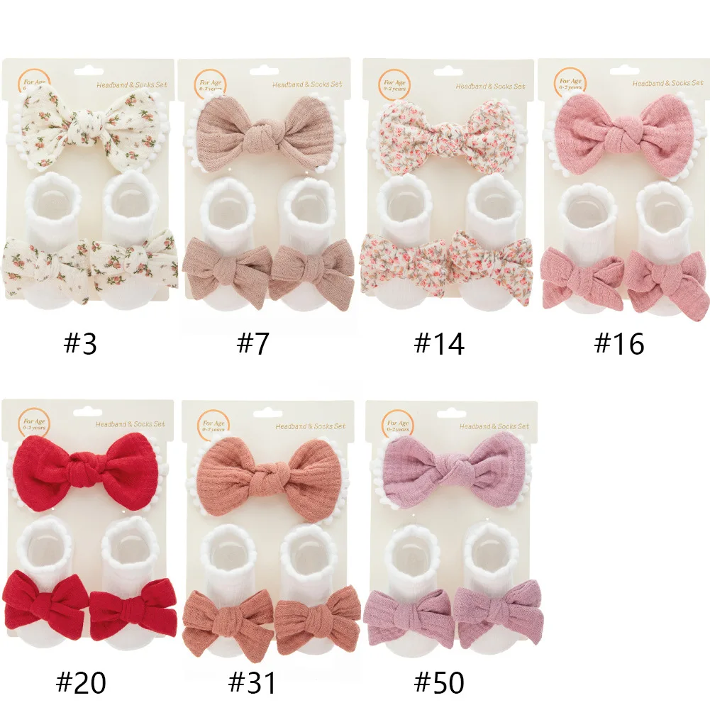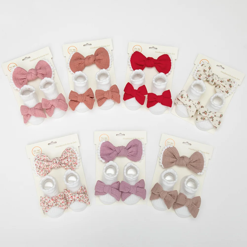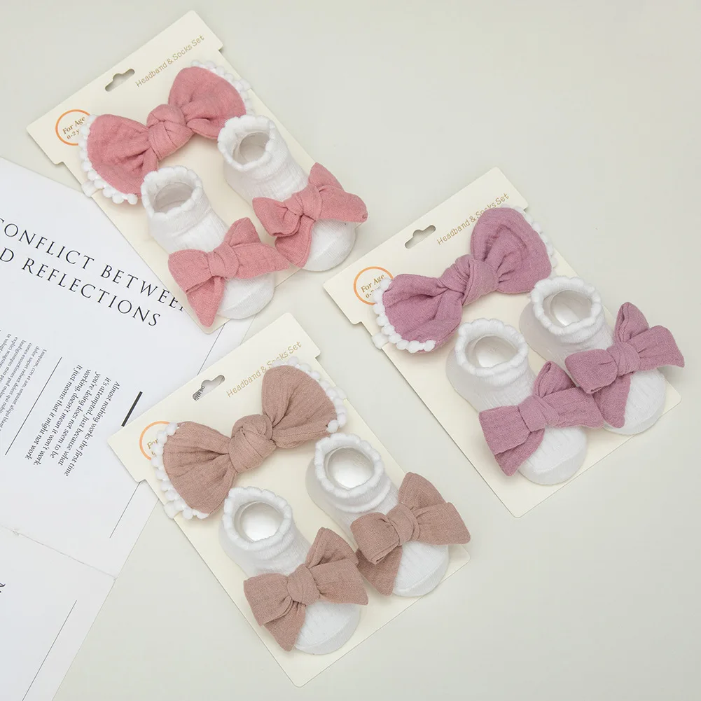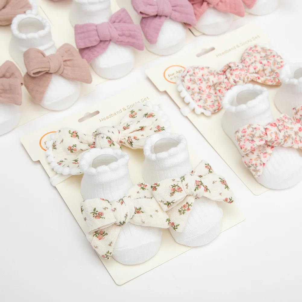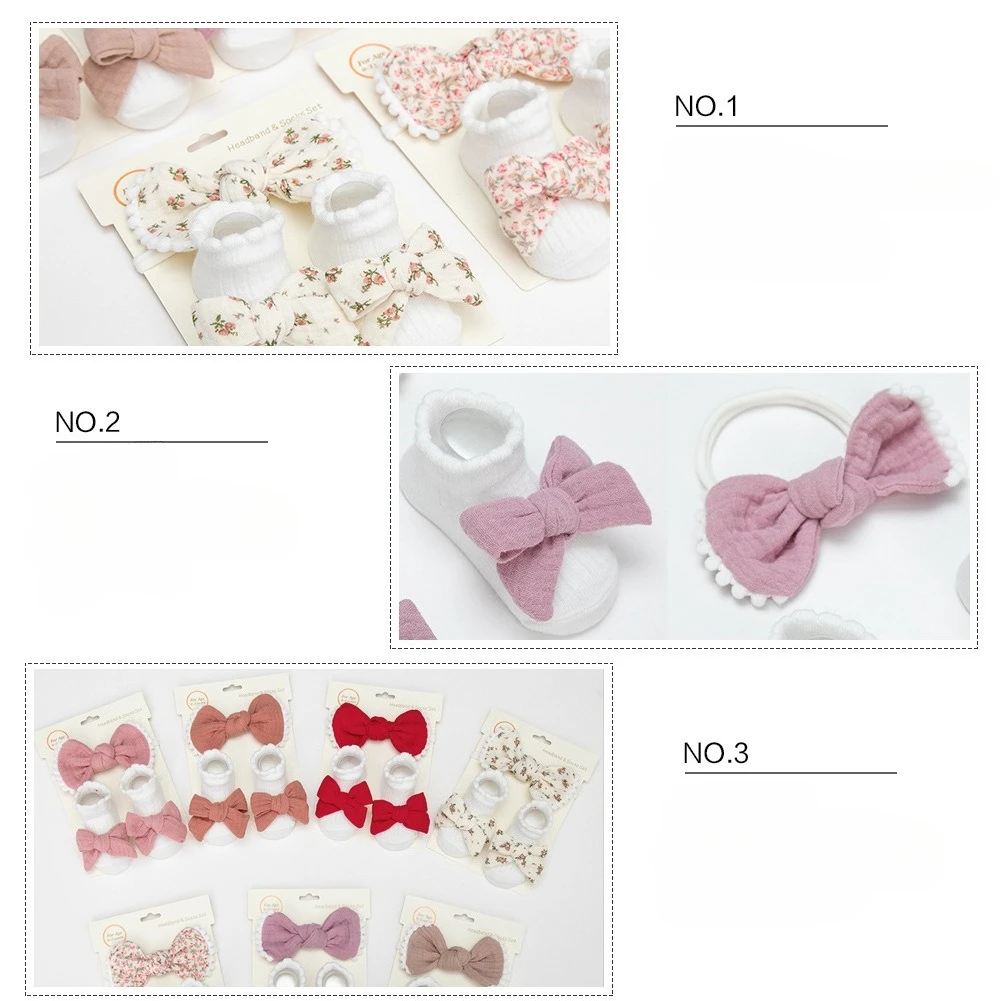 Comprar Conjunto de calcetines de agarre con diadema para bebé europeo, calcetines de barco antideslizantes con adorno de encaje y lazo arrugado atado a mano para niñas de 0 a 24 meses, fotografía para recién nacidos