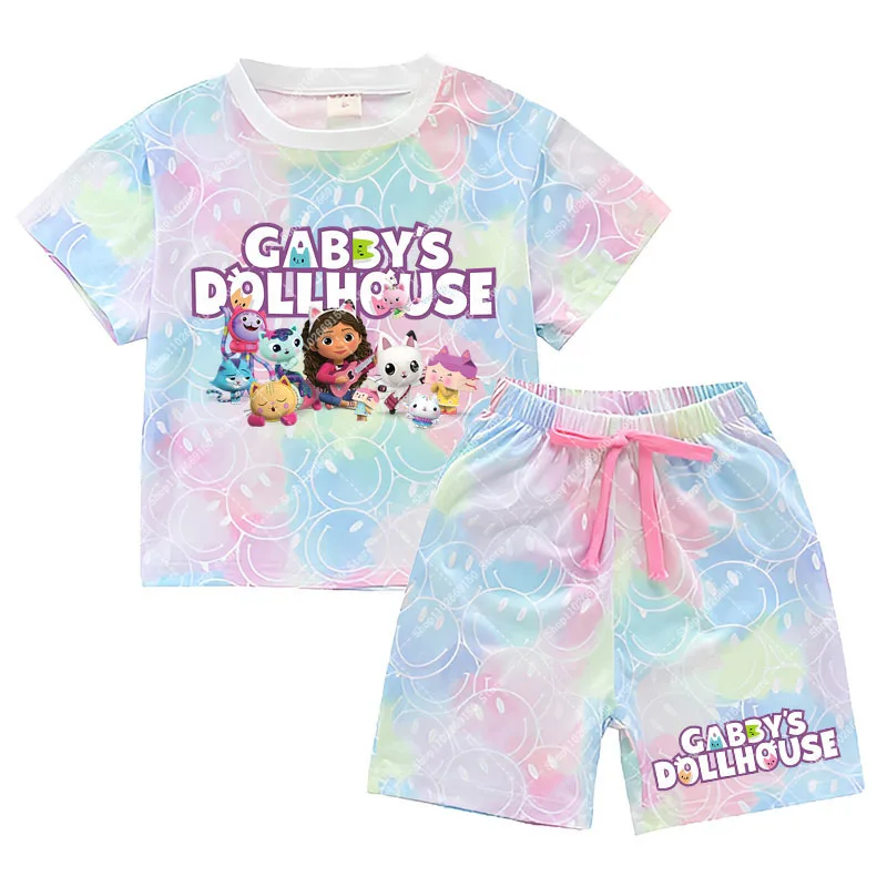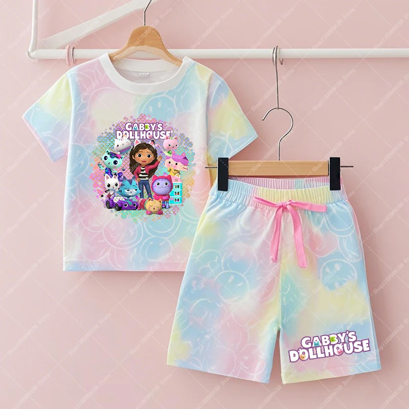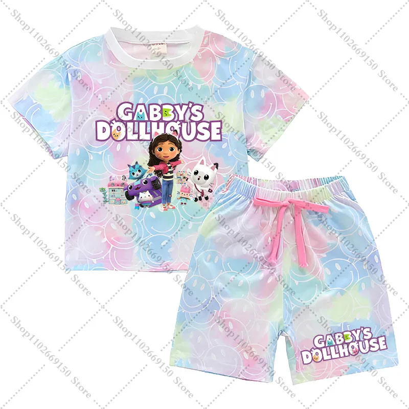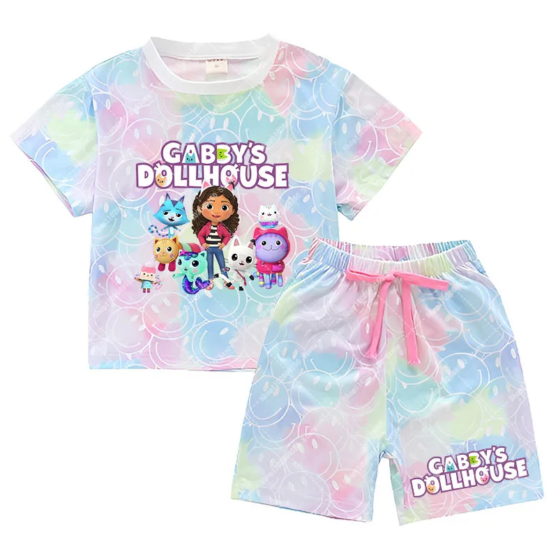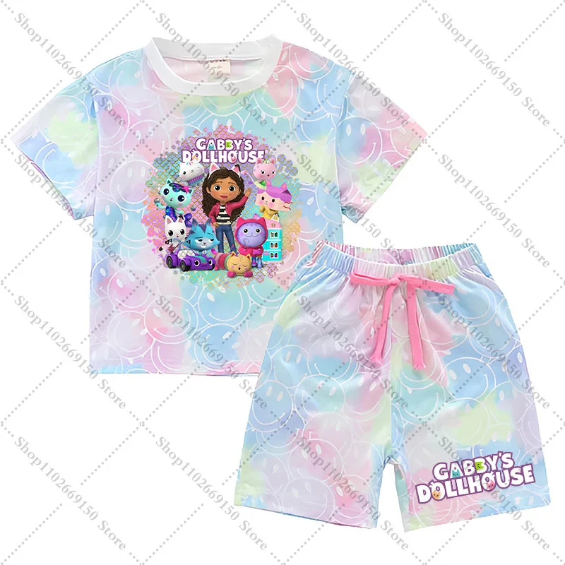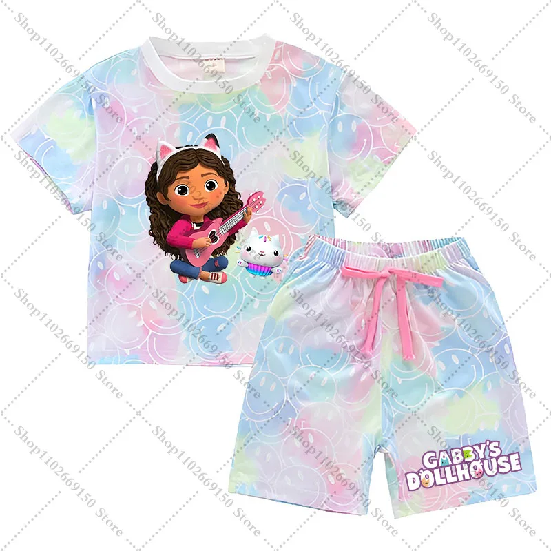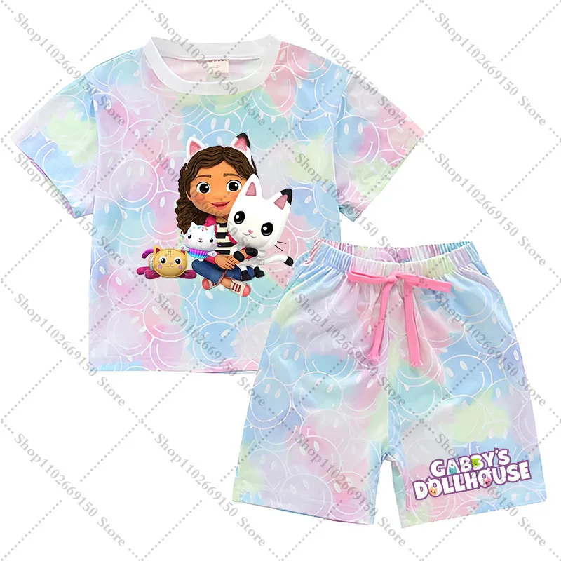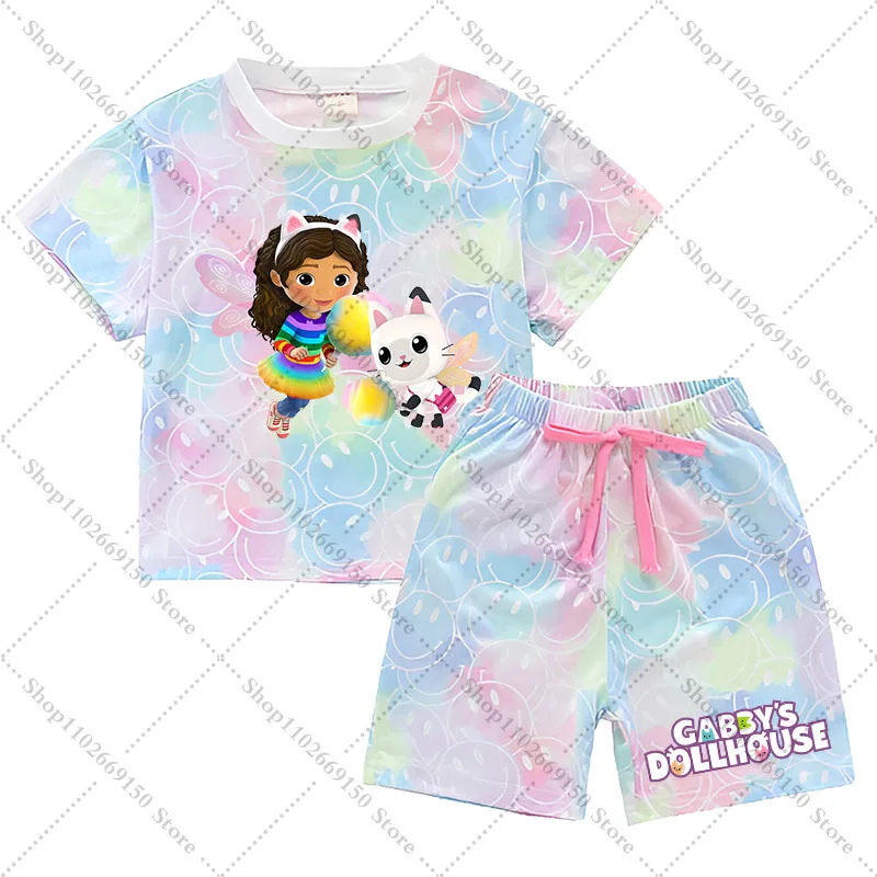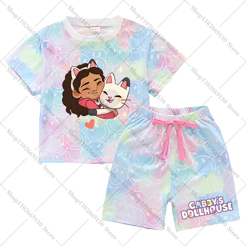 Conjunto de camiseta y pantalones cortos Kawaii Gabby Dollhouses para niña, ropa de verano para niños, camiseta bonita de Anime, pantalones, ropa de descanso de manga corta para niños, regalos