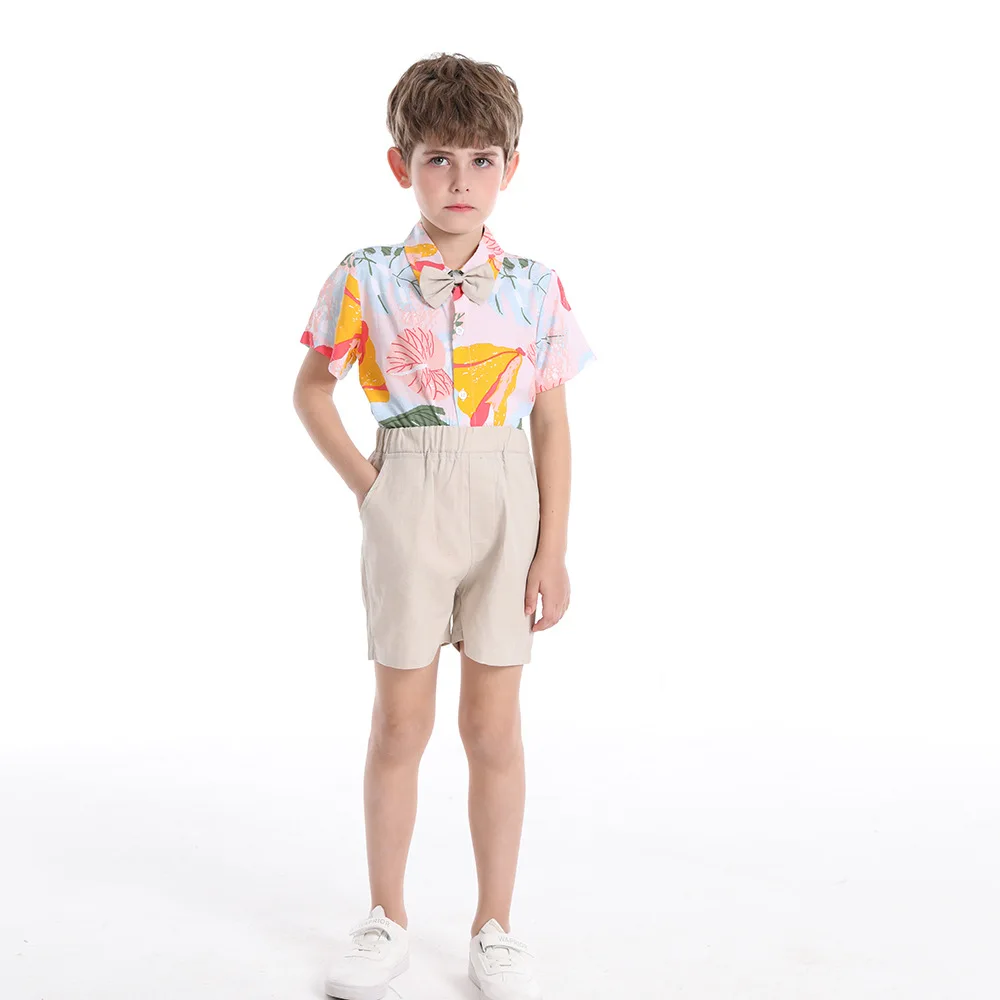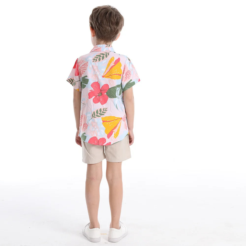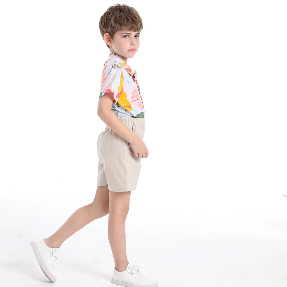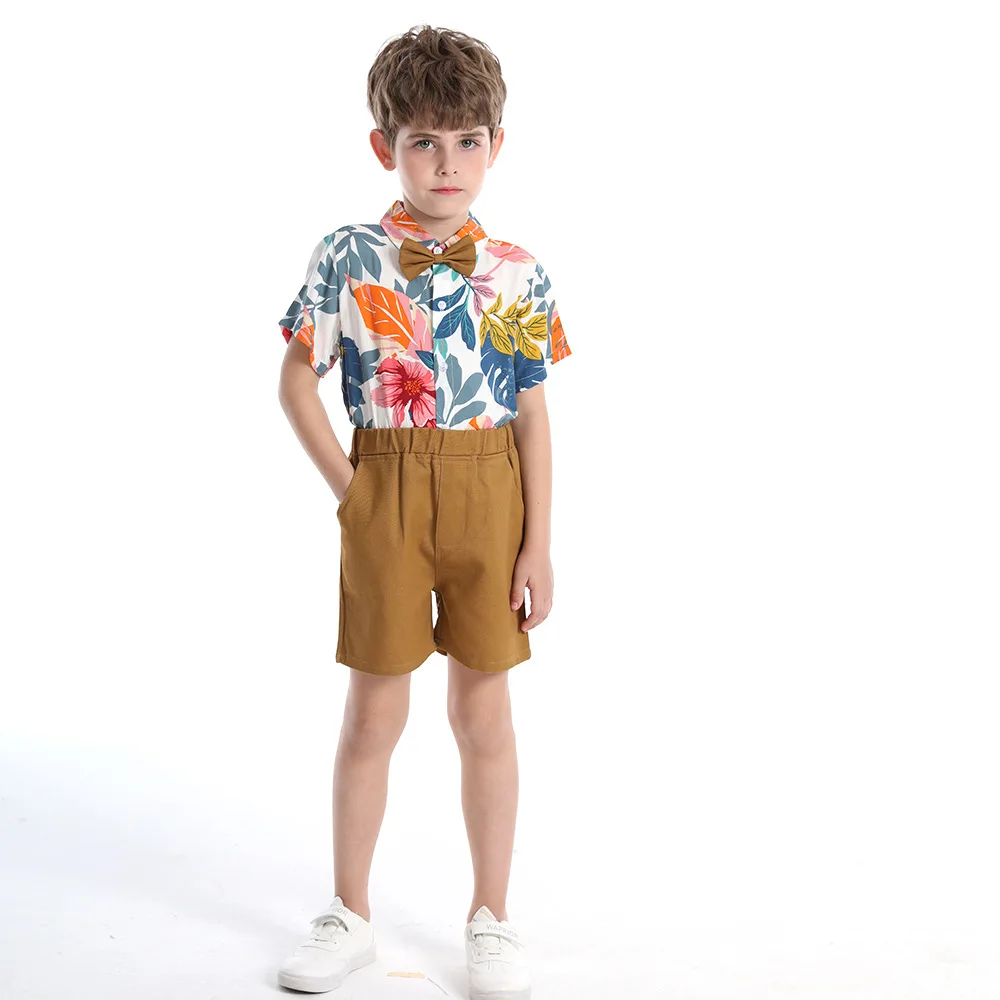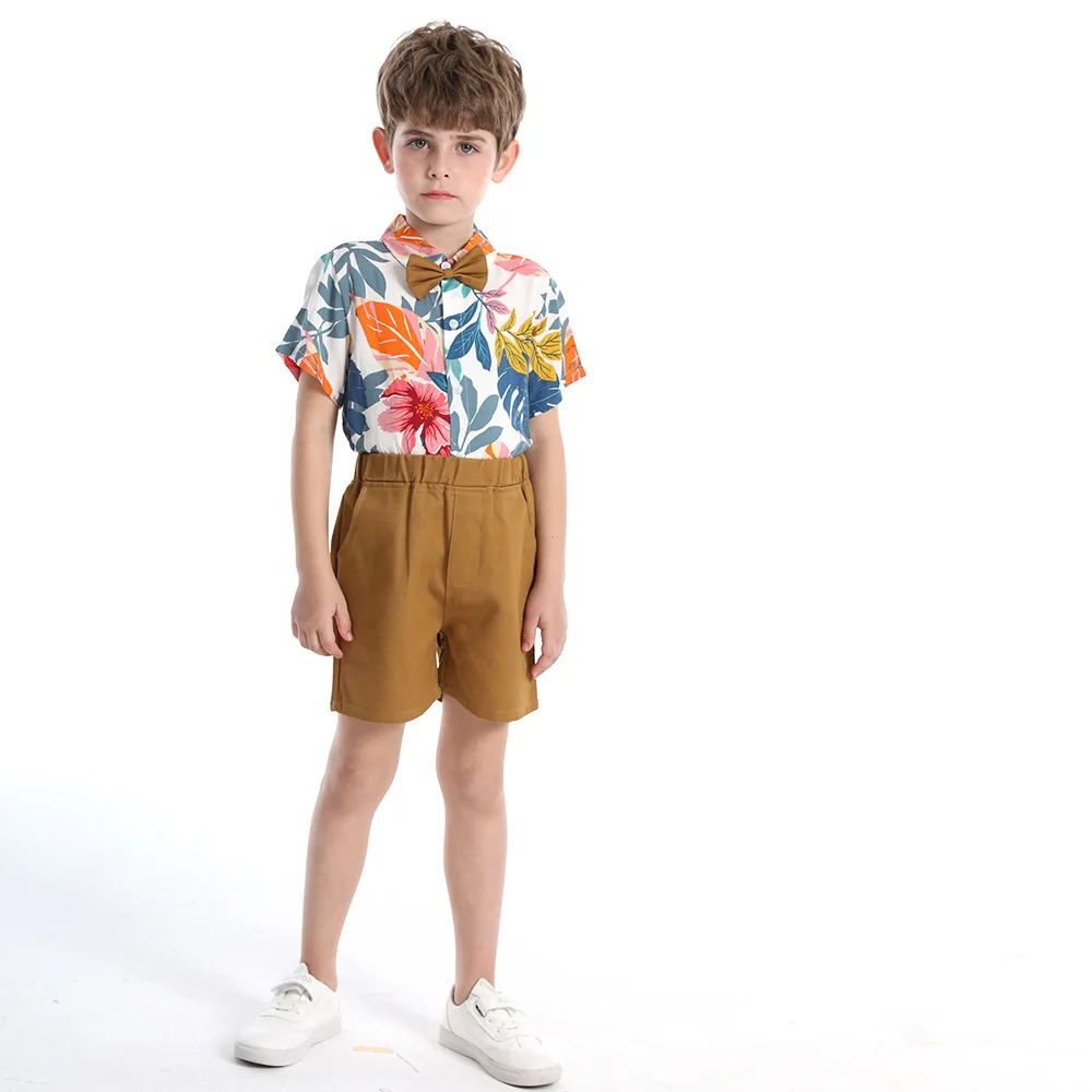 Conjunto de camisetas y pantalones cortos de flores para niño, ropa de verano de algodón para vacaciones, estilo de playa, camisas y pantalones cortos de flores de manga corta