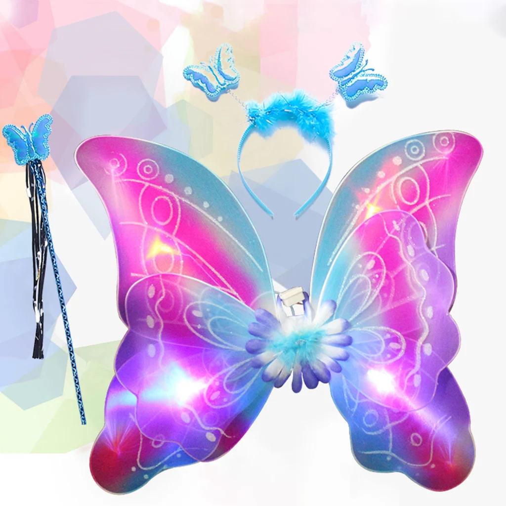 Contiene alas de mariposa luminosas LED de arcoíris degradado + varita de Hada de cinta + aro de pelo de mariposa de primavera + falda tutú plisada.