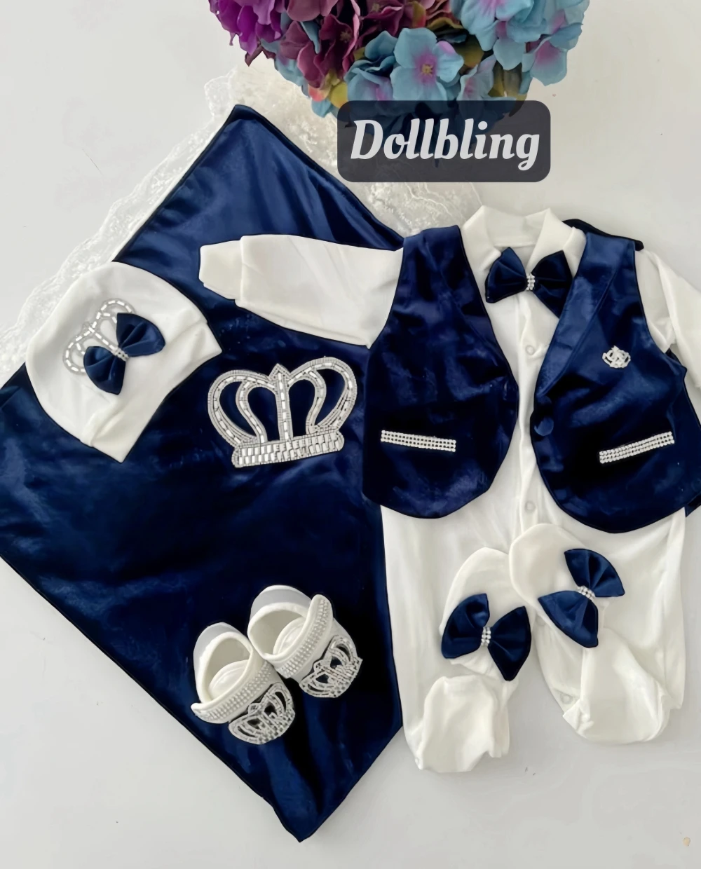 Nuestro juego de 4 piezas está hecho de algodón suave y grueso.Están adornados con botones de diamantes de imitación, joyas de corona y lazos.