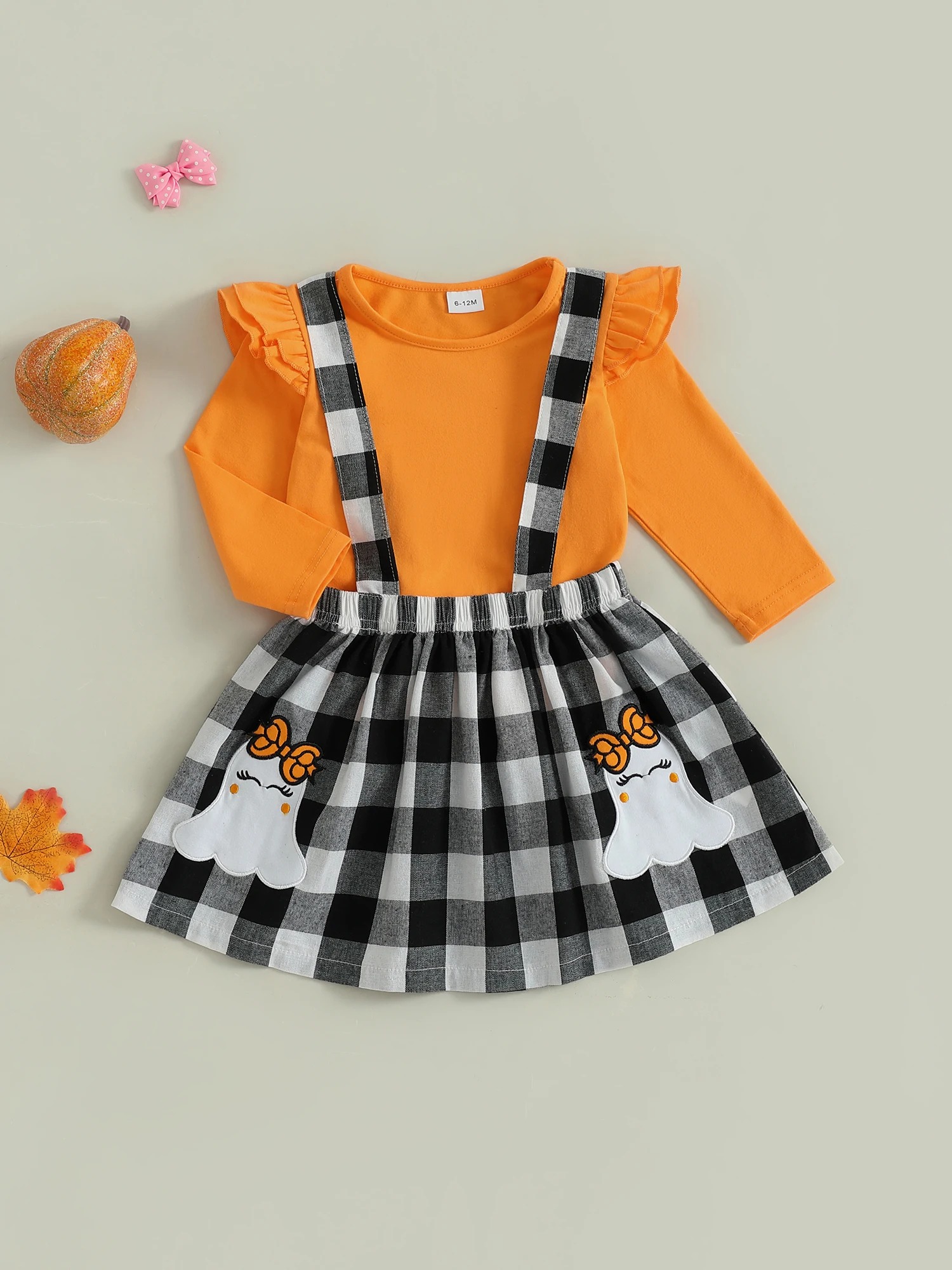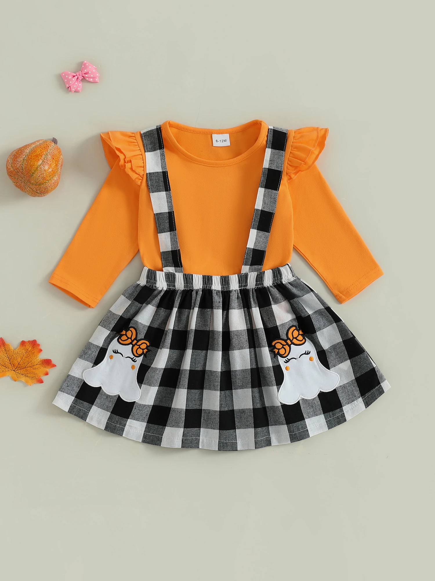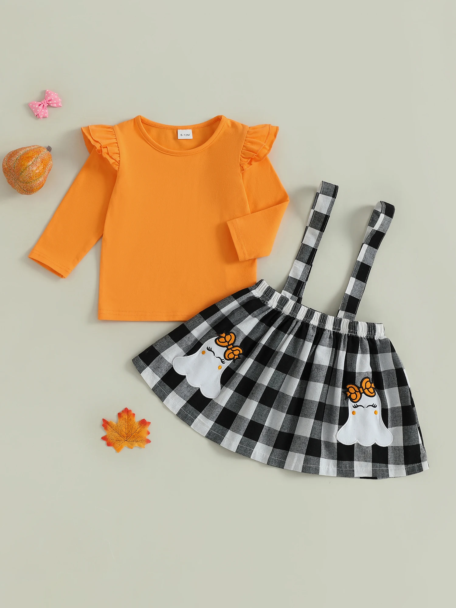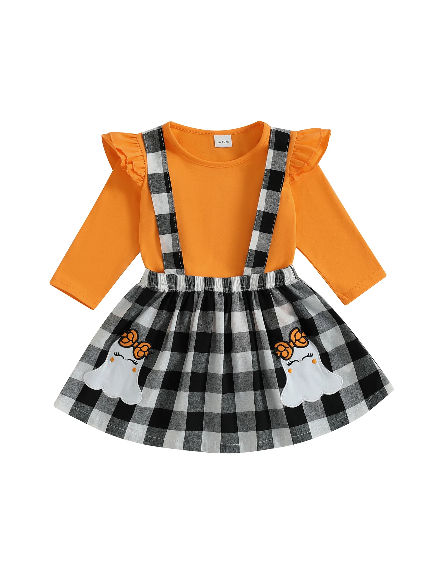 Conjunto de falda para niñas pequeñas, Tops de manga larga de Color sólido y falda general con tirantes a cuadros con patrón de fantasma, traje de Halloween de 2 uds.