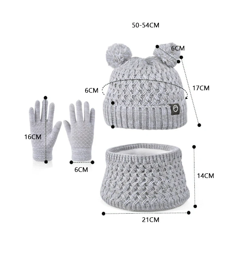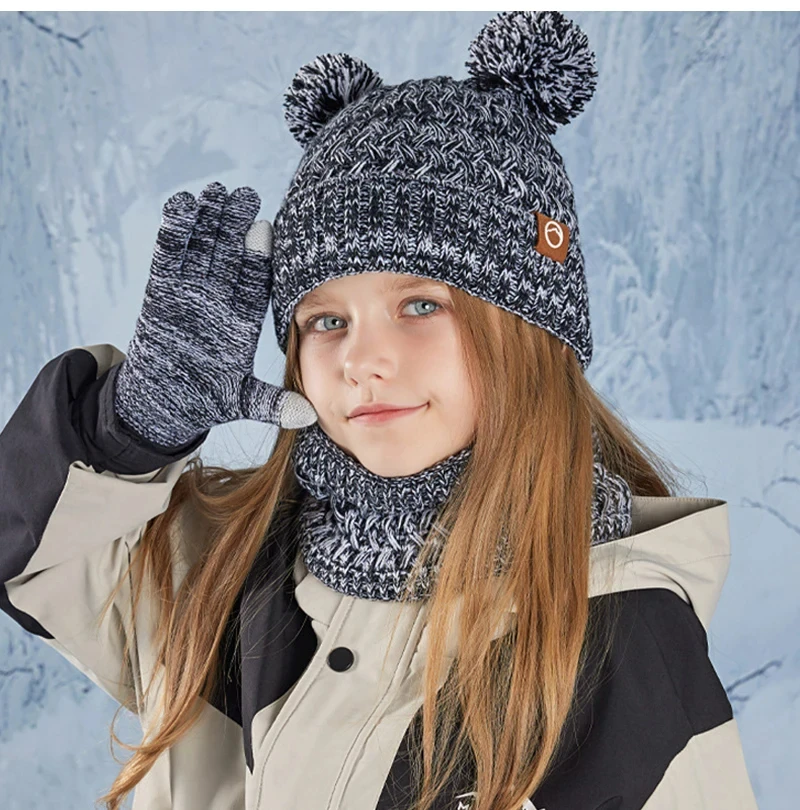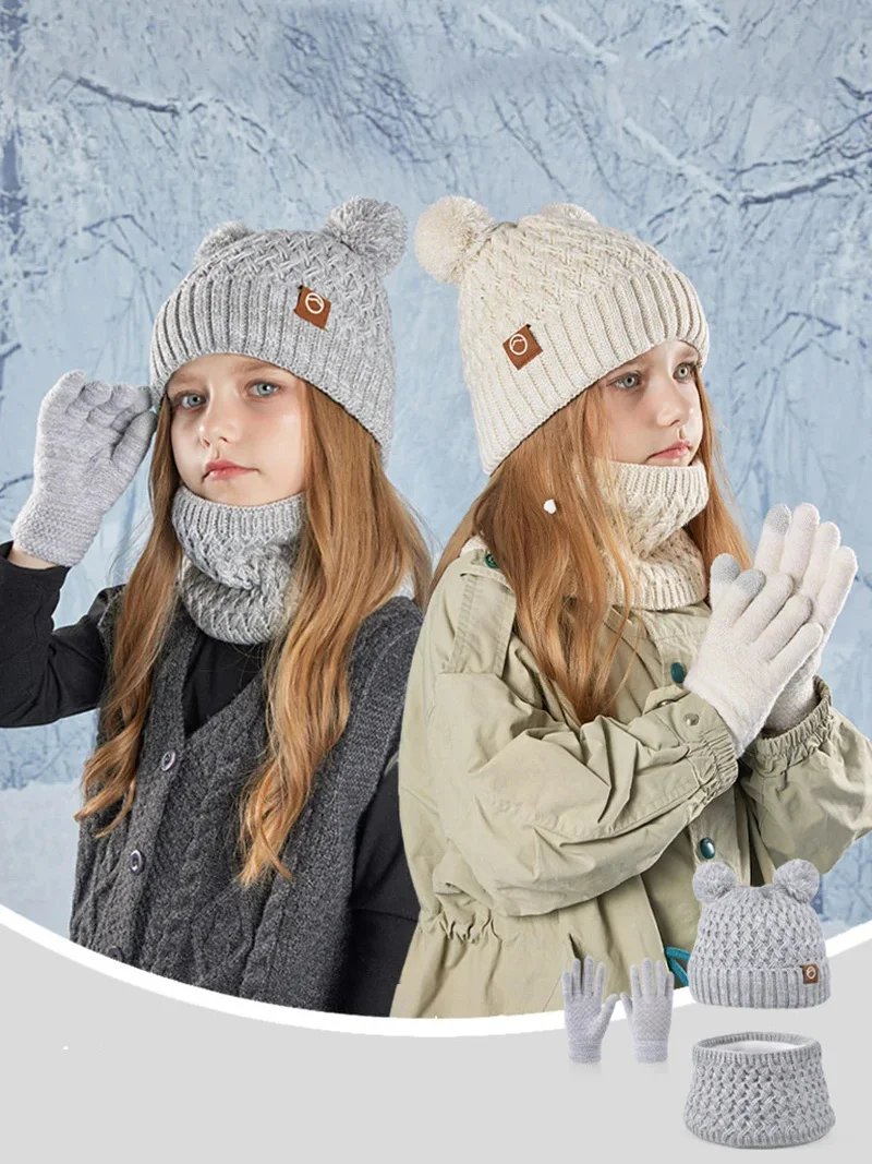 Comprar Conjunto de gorro de invierno para niños, bufanda de punto cálida para exteriores, guantes, además de gorros con protección para los oídos de terciopelo para niños y niñas, bonito gorro de doble bola