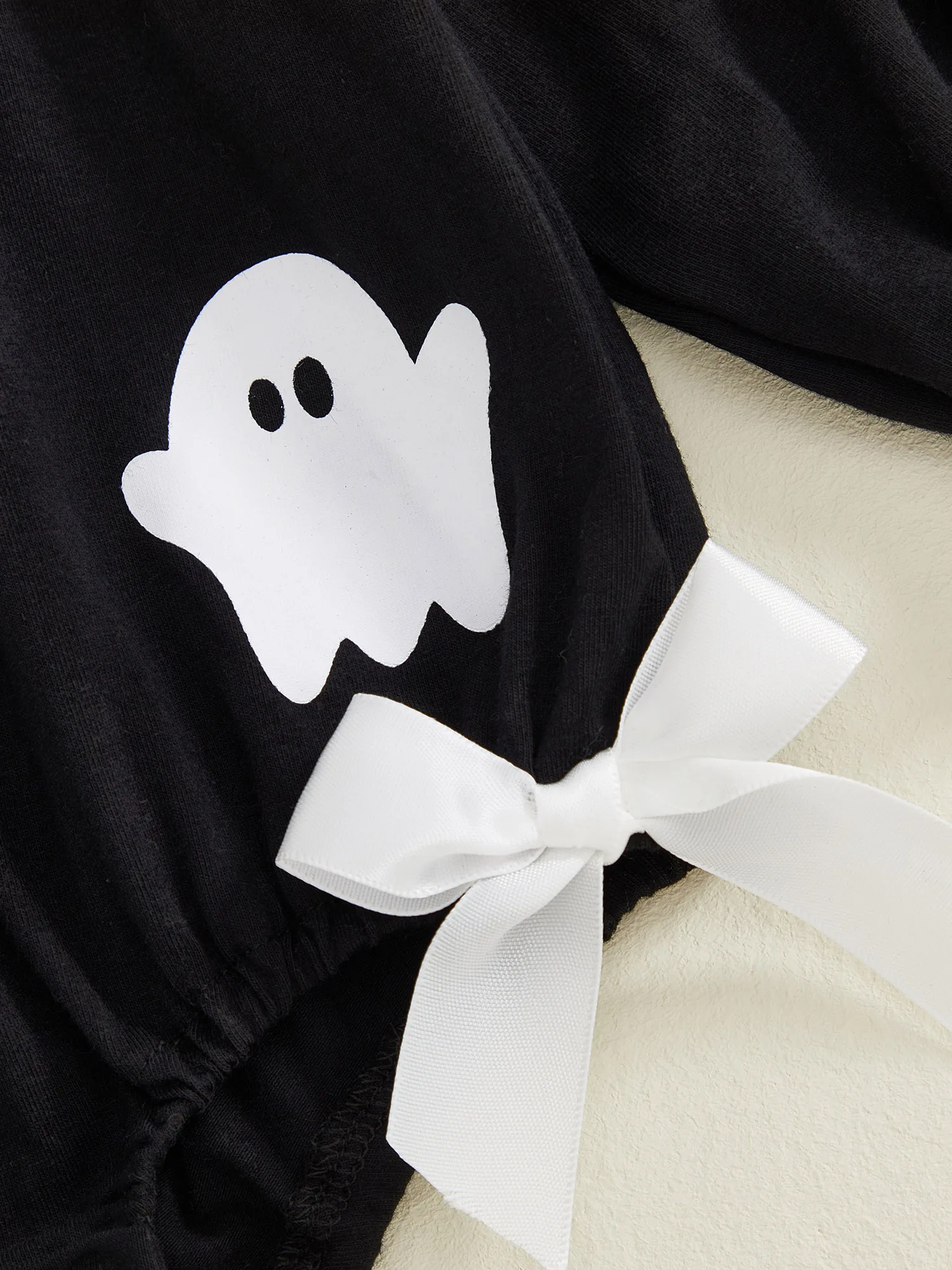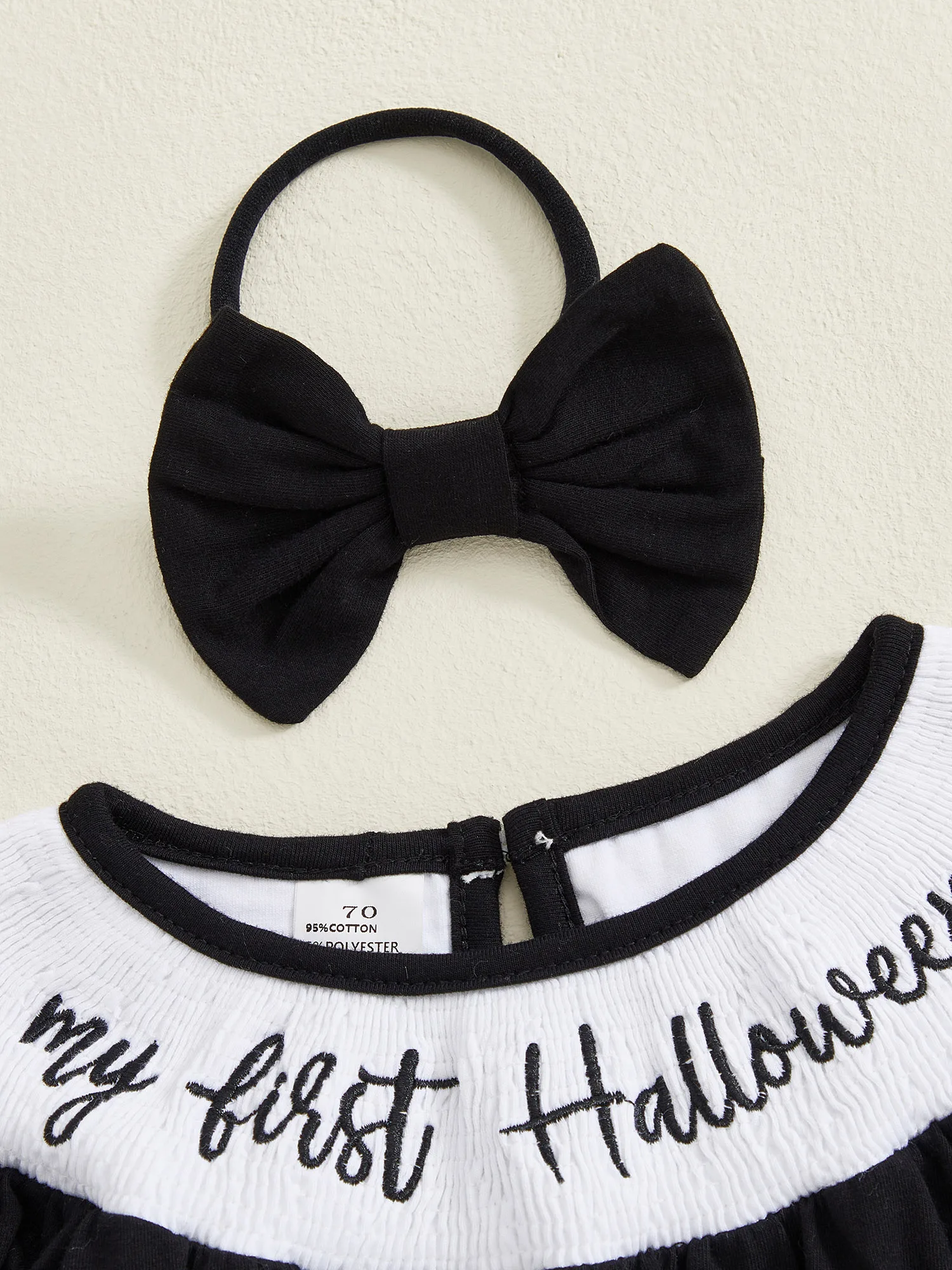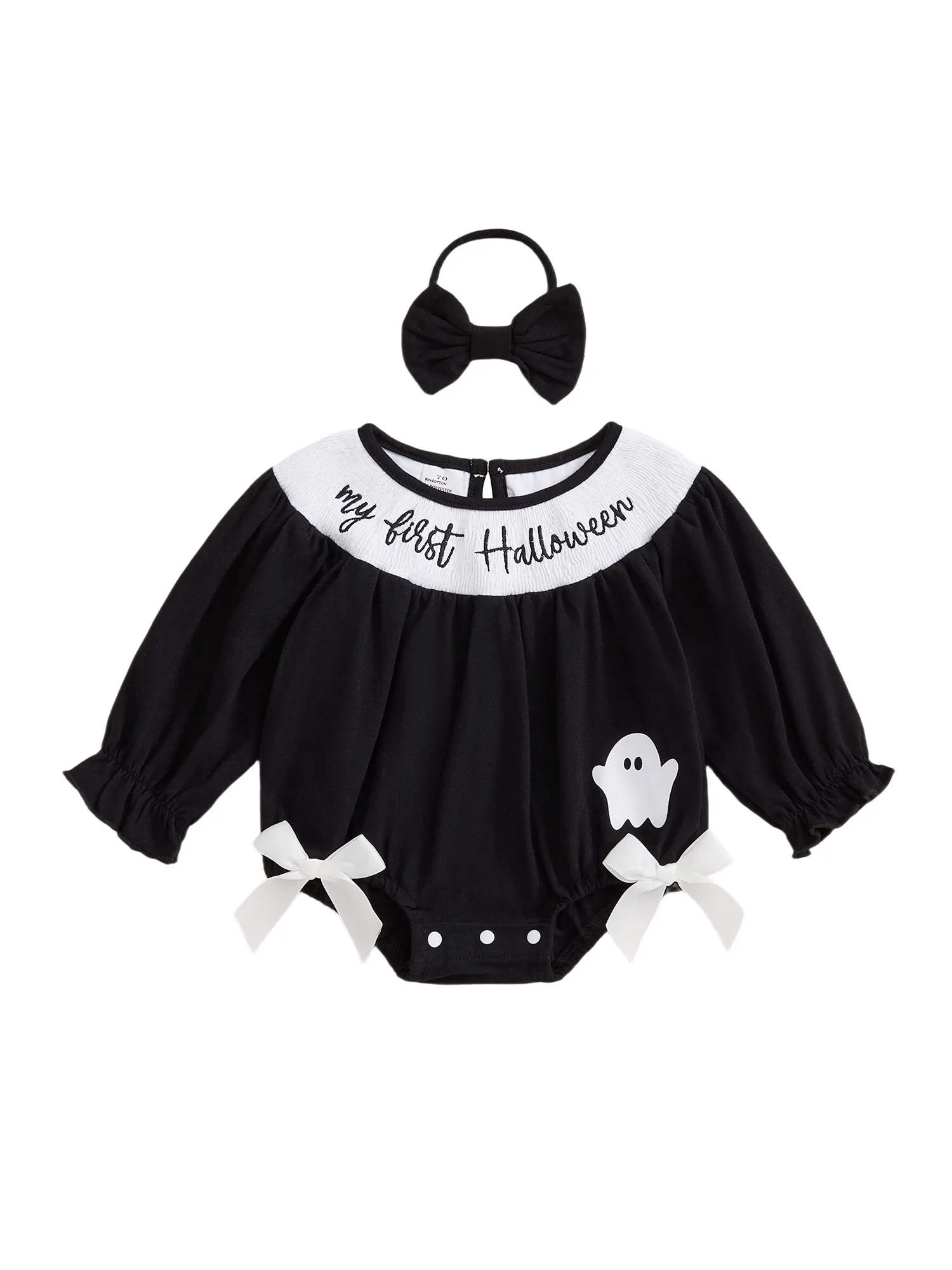 Especificación: Edad recomendada: 0-3 meses, 3-6 meses, 6-12 meses, 12-18 meses Materiales: 95% Algodón y 5% Poliéster Patrón: bordado de letras y estampado fantasma. Color negro Género: niña