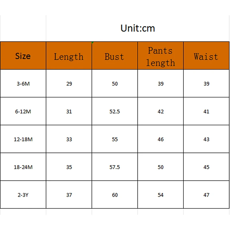 Conjunto de otoño para bebé, sudadera con capucha de manga larga acanalada y pantalones elásticos, ropa de correr de 2 piezas para niño pequeñoCaracterísticasConjunto de otoño para bebé niño, tejido acanalado de color liso, cálido y acogedor; Sudadera para niño con bolsillos delanteros, capucha y diseño de manga larga; Pantalón bebé niño con diseño de cintura elástica para asegurar un ajuste cómodo, perfecto para el otoño.Adecuado para el uso diario de niños pequeños, escuela, deportes, reuniones familiares, vacaciones, dormir, informal, cumpleaños, viajes, etc.Tamaño (cm)3-6M Longitud de la camiseta: 29 Busto: 50 Longitud de pantalones: 39 Cintura: 39 Edad recomendada: 3-6 meses6-12M Longitud de la camiseta: 31 Busto: 52.5 Longitud de pantalones: 42 Cintura: 41 Edad recomendada: 6-12 meses12-18M Longitud de la camiseta: 33 Busto: 55 Longitud de pantalones: 46 Cintura: 43 Edad recomendada: 12-18 meses18-24M Longitud de la camiseta: 35 Busto: 57,5 Longitud de los pantalones: 50 Cintura: 45 Edad recomendada: 18-24 meses2-3 años Longitud de la camiseta: 37 Busto: 60 Longitud de los pantalones: 54 Cintura: 47 Edad recomendada: 2-3 añosTamaño (pulgadas)3-6M Longitud de la camiseta: 11,42 Busto: 19,68 Largo de pantalones: 15,35 Cintura: 15,35 Edad recomendada: 3-6 meses6-12M Longitud de la camiseta: 12,2 Busto: 20.67 Largo de pantalones: 16,54 Cintura: 16,14 Edad recomendada: 6-12 meses12-18M Longitud de la camiseta: 12,99 Busto: 21,65 Largo de pantalones: 18.11 Cintura: 16,93 Edad recomendada: 12-18 meses18-24M Longitud de la camiseta: 13,78 Busto: 22,64 Largo de pantalones: 19,68 Cintura: 17,72 Edad recomendada: 18-24 meses2-3 años Longitud de la camiseta: 14,57 Busto: 23,62 Largo de pantalones: 21,26 Cintura: 18,5 Edad recomendada: 2-3 añosEspecificaciónCondición: 100% nuevoMaterial: 95% Poliéster 5% ElastanoEstilo: ModaGénero: niñosTemporada: Primavera Otoño e InviernoCantidad: 2 piezasPatrón: Color sólidoManga: manga largaEl paquete incluye:1 * Tops1 * pantalonesNota:Puede haber una desviación de 1 a 2 cm en diferentes tamaños, ubicaciones y estiramiento de las telas.La tabla de tallas es solo como referencia; Puede haber una pequeña diferencia con lo que obtienes.El color puede ser más claro o más oscuro debido a las diferentes pantallas de PC.