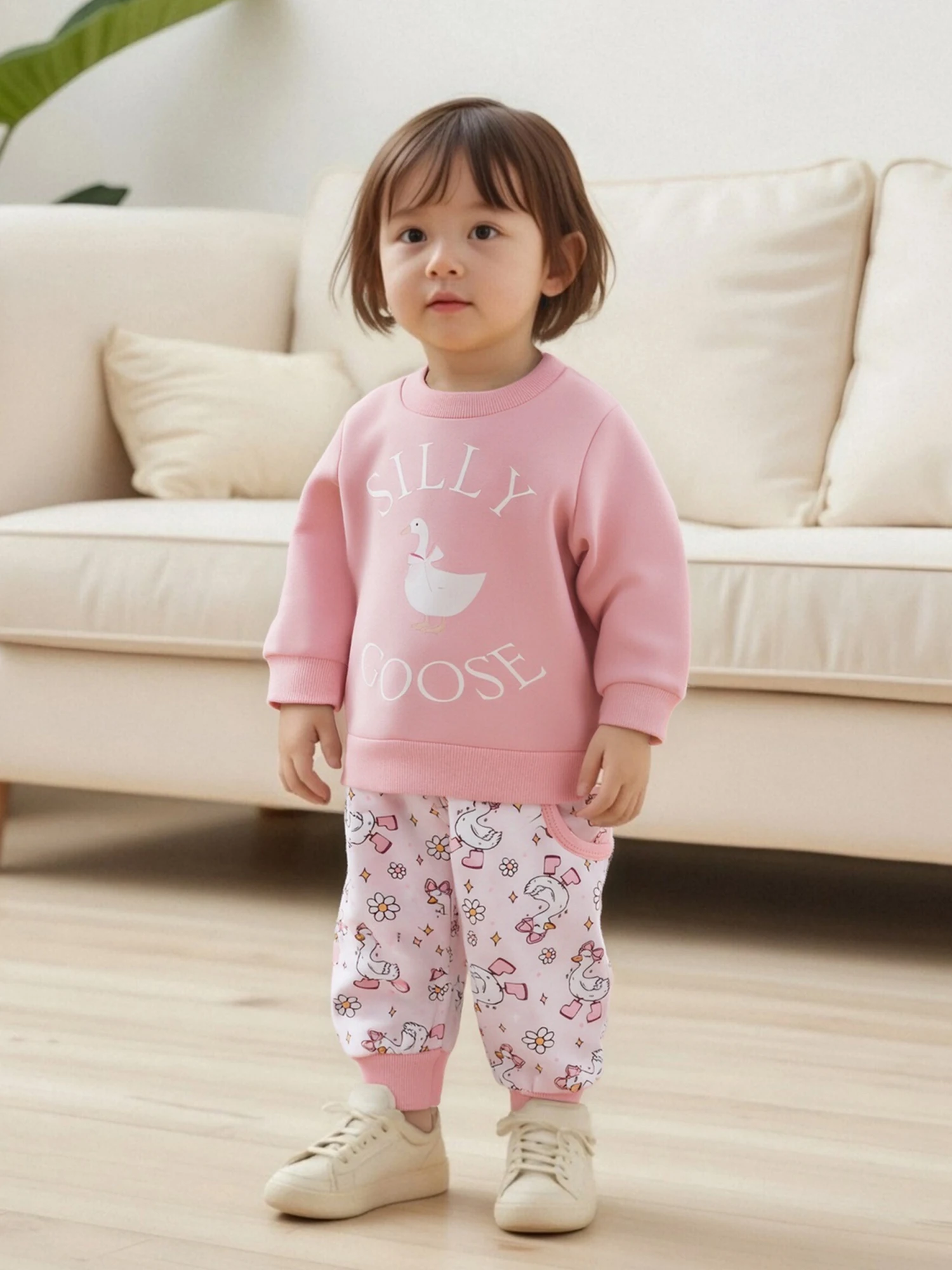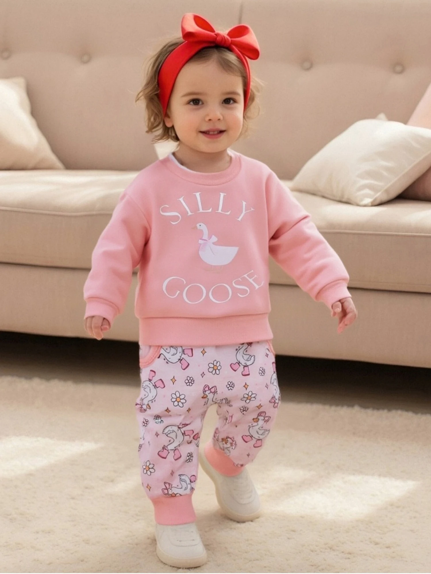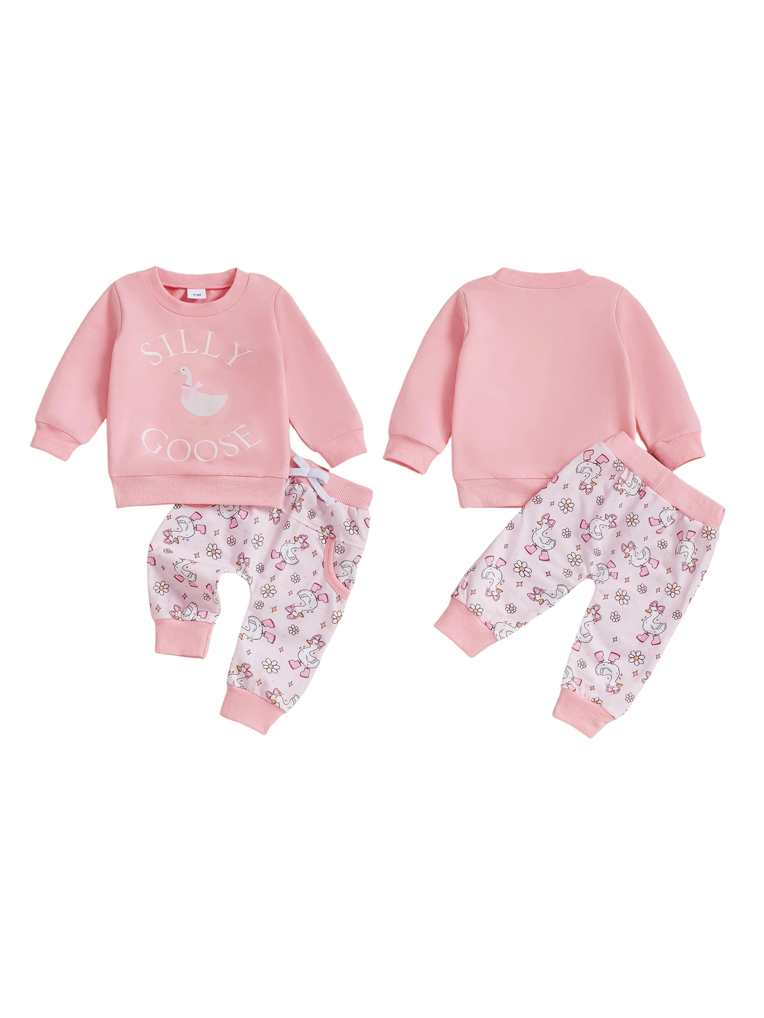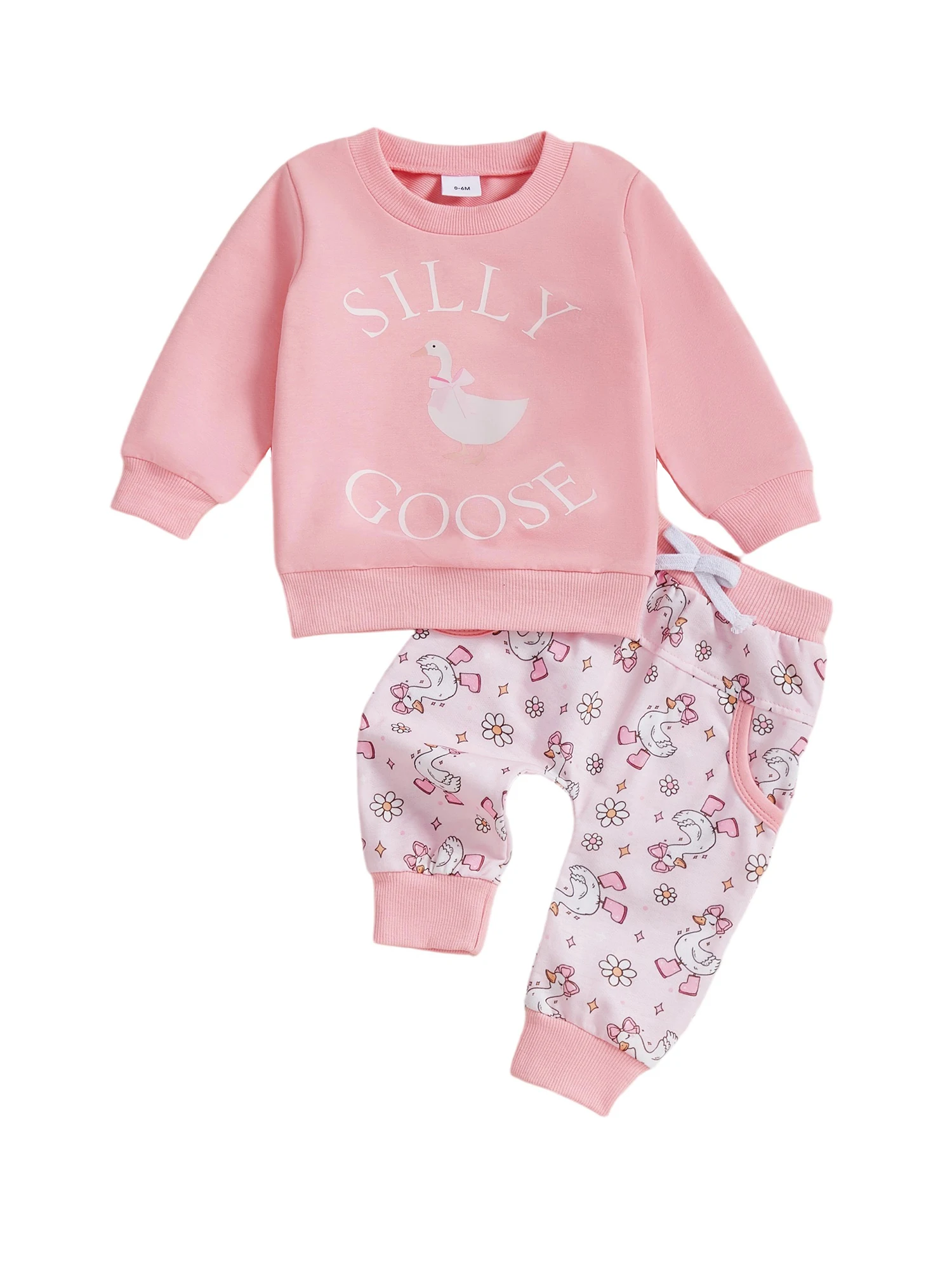 Conjunto de otoño para niñas pequeñas, jersey de manga larga con estampado de ganso a la moda, pantalones con lazo y bolsillo, traje de 2 uds.