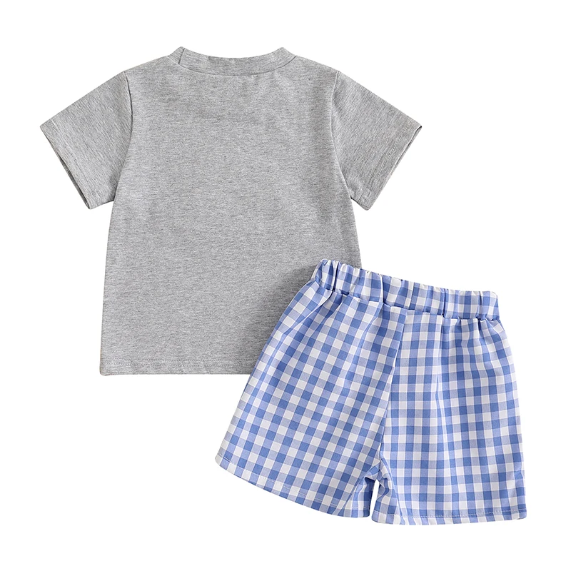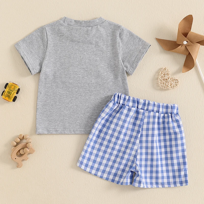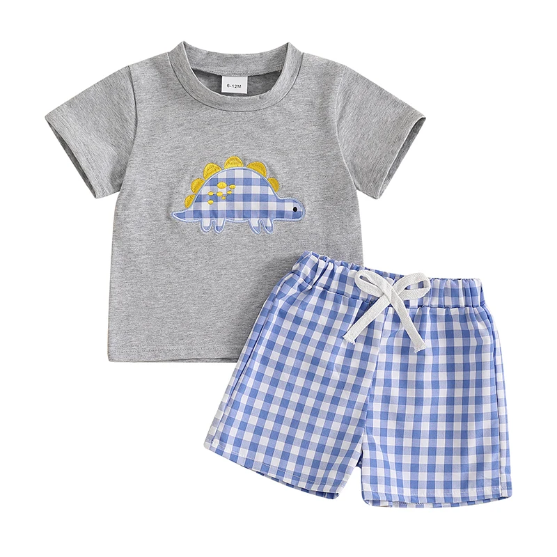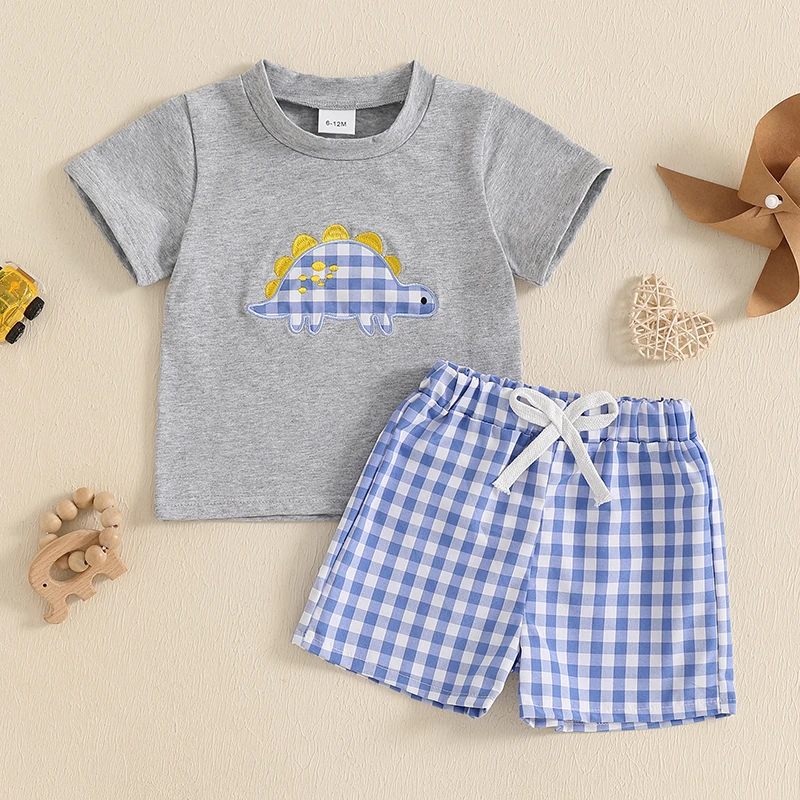 Conjunto de pantalones cortos para niños, camiseta de dinosaurio bordada de manga corta con pantalones cortos a cuadros, conjunto de verano para niños pequeños