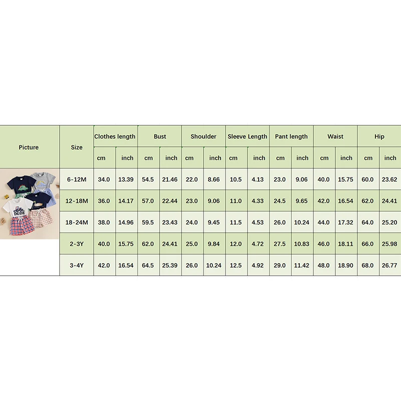 Tamaño (pulgadas) 6-12M Longitud de la camiseta: 13,39 Busto: 21.46 Manga: 4.13 Hombro: 8,66 Cintura: 15,75 Cadera: 23,62 Longitud de los pantalones cortos: 9,06 Edad sugerida: 6-12 meses 12-18M Longitud de la camiseta: 14,17 Busto: 22,44 Manga: 4,33 Hombro: 9,06 Cintura: 16,54 Cadera: 24,41 Longitud de los pantalones cortos: 9,65 Edad sugerida: 12-18 meses 18-24M Longitud de la camiseta: 14,96 Busto: 23.43 Manga: 4,53 Hombro: 9,45 Cintura: 17.32 Cadera: 25,2 Longitud de los pantalones cortos: 10,24 Edad sugerida: 18-24 meses 2-3Y Longitud de la camiseta: 15,75 Busto: 24,41 Manga: 4,72 Hombro: 9,84 Cintura: 18,11 Cadera: 25,98 Longitud de los pantalones cortos: 10,83 Edad sugerida: 2-3 años 3-4Y Longitud de la camiseta: 16,54 Busto: 25,39 Manga: 4,92 Hombro: 10,24 Cintura: 18,9 Cadera: 26,77 Longitud de los pantalones cortos: 11.42 Edad sugerida: 3-4 años