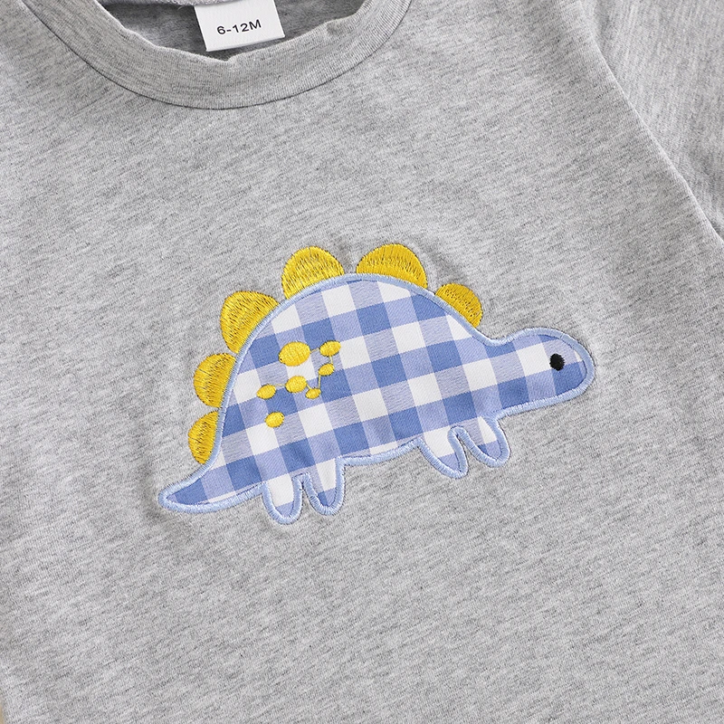 Conjunto de pantalones cortos para niños de 0 a 4 años, camiseta de dinosaurio bordada de manga corta con pantalones cortos a cuadros, conjunto para niños pequeños, traje de verano