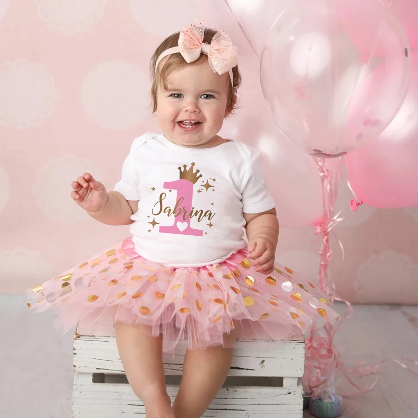Traje de 1er cumpleaños personalizado para niña, vestido de fiesta de cumpleaños, nombre personalizado, tutú, pastel, vestidos + conjunto de mameluco, ropa de 2 piezas para niña