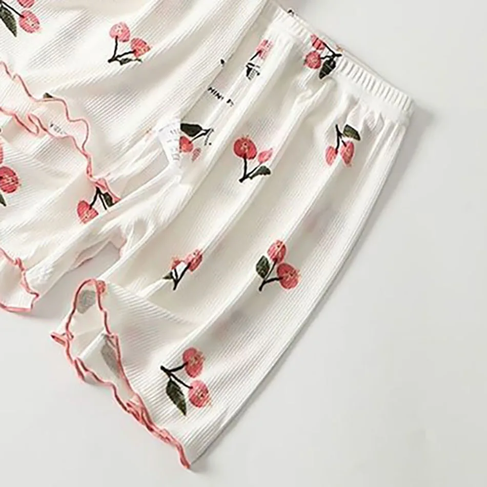 Nombre: Conjunto de pijama de verano para niñas con estampado de flores de cerezo, pantalones cortos elásticos en 4 direcciones y camiseta de mezcla modal transpirable para dormir y jugar durante 1 a 8 años.
