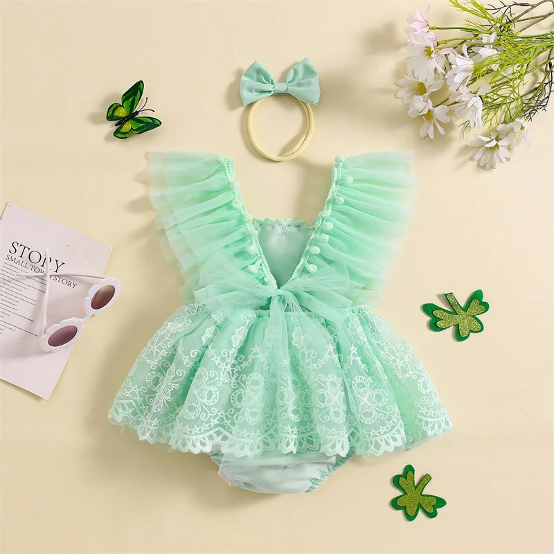 Ropa para bebés pequeños, niña, 2, trajes de verano, volantes, sin mangas, de encaje, mameluco para niños, vestido con diadema, conjunto de ropa para niños
