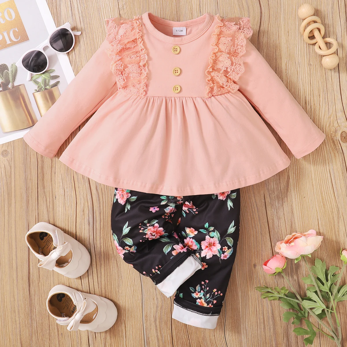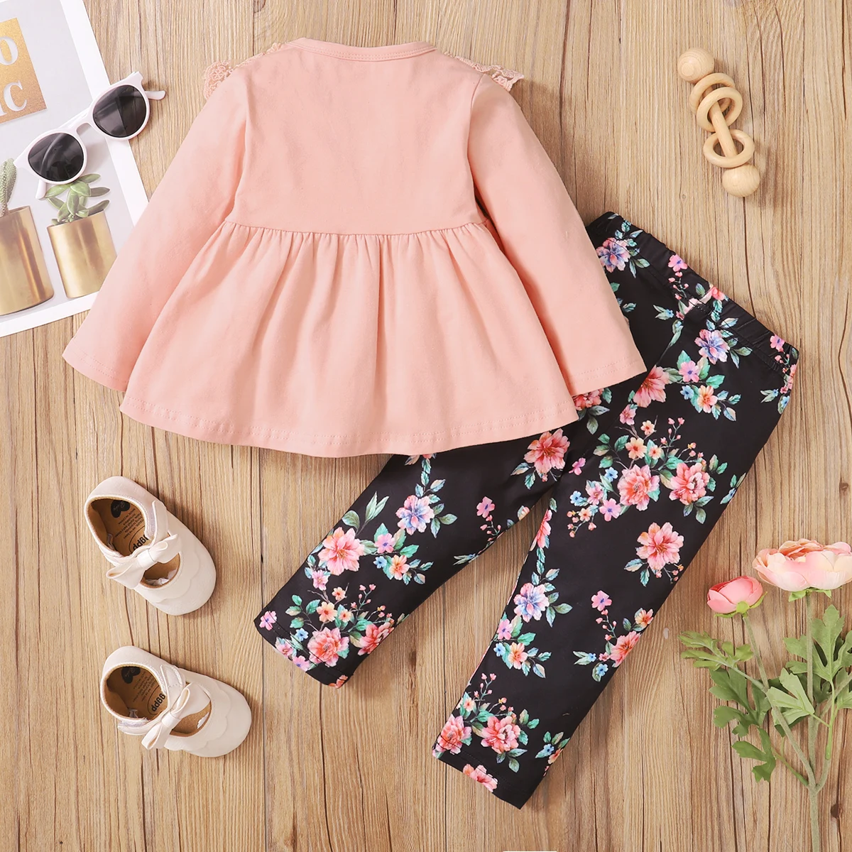 Conjunto de ropa de 2 piezas para niña pequeña, Top de encaje de manga larga y pantalones de flores, Moda de Primavera y otoño, Atuendo para niña pequeña de 3 a 24 meses