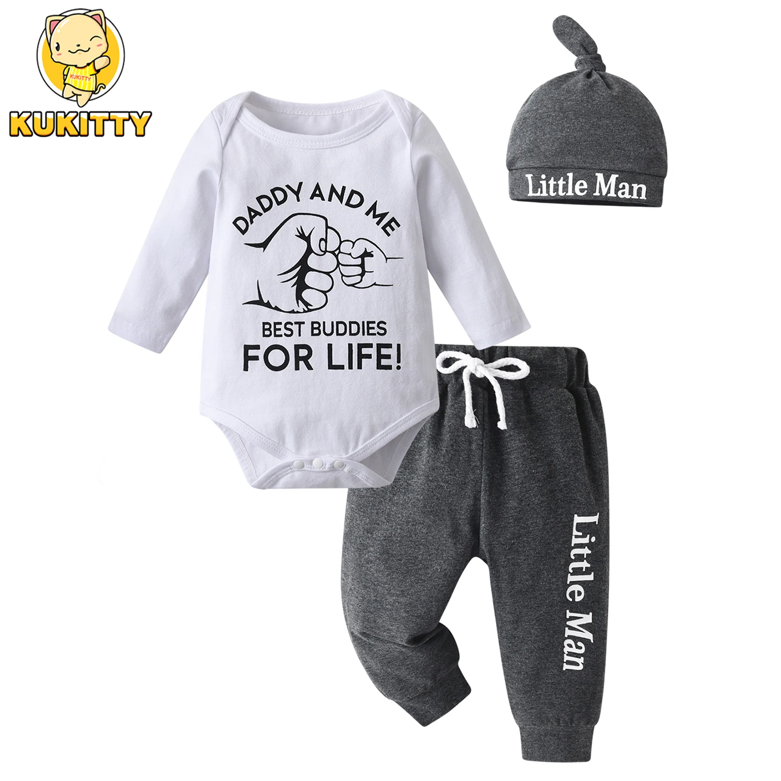 Comprar Conjunto de ropa de 3 piezas para bebé recién nacido con estampado de letras, mameluco de manga larga, pantalones, sombrero, primavera y otoño