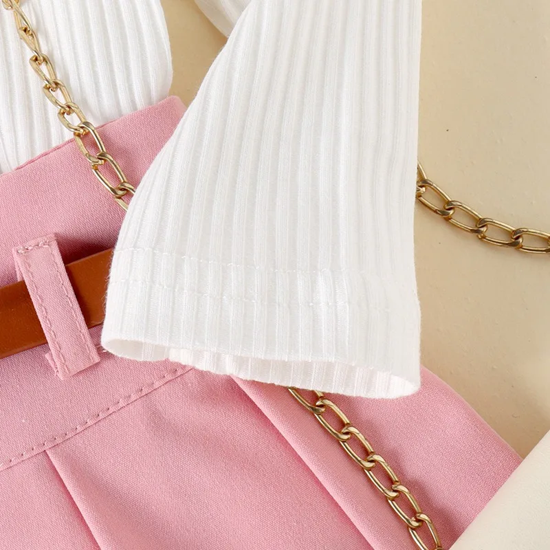 Comprar Conjunto de ropa de 3 piezas para niña, Top de manga larga con cuello de solapa, Falda plisada y cinturón, informal, a la moda, color blanco sólido, primavera y otoño