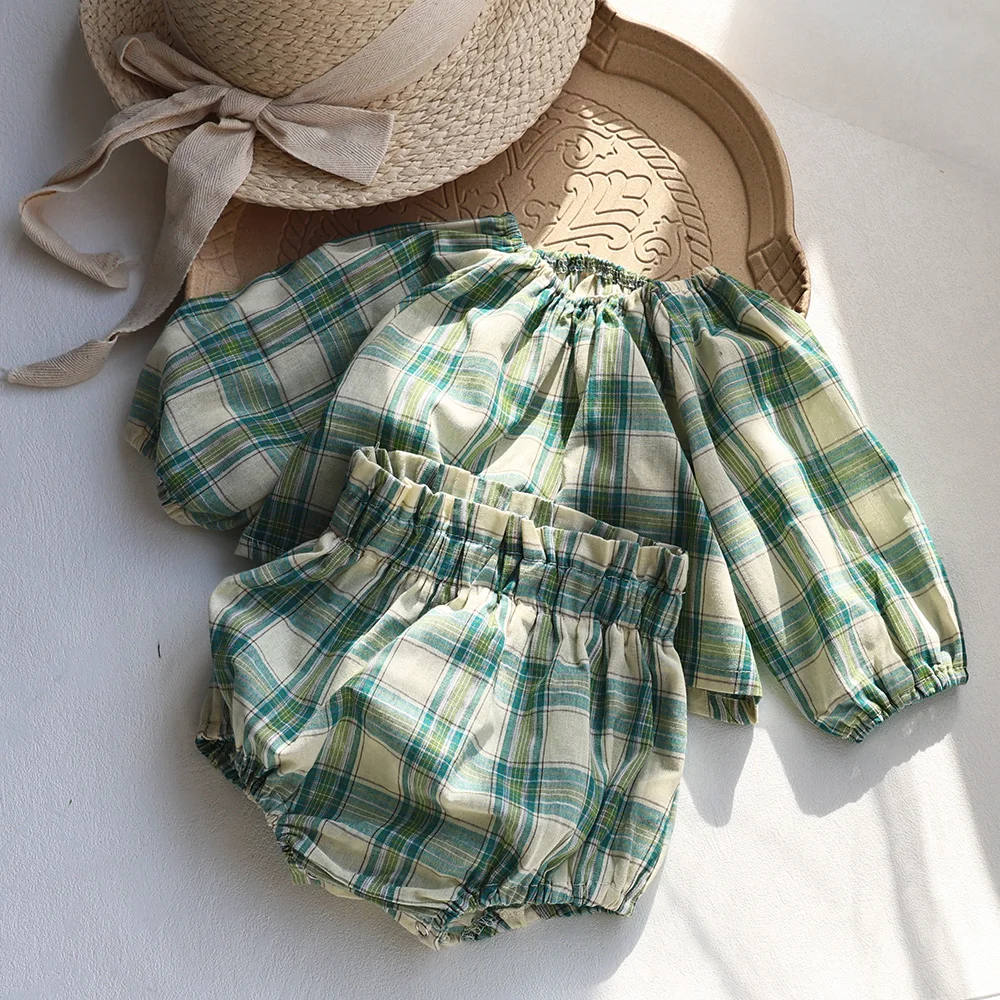 Comprar Conjunto de ropa a cuadros verdes para niña, blusa de algodón suelta informal y pantalones cortos con volantes, trajes para 0-3 años, Verano