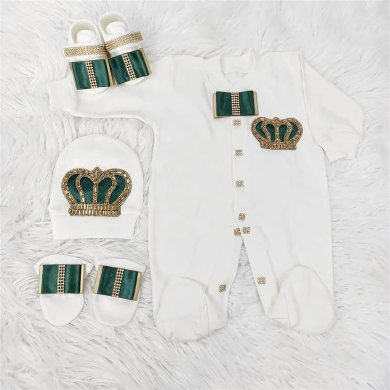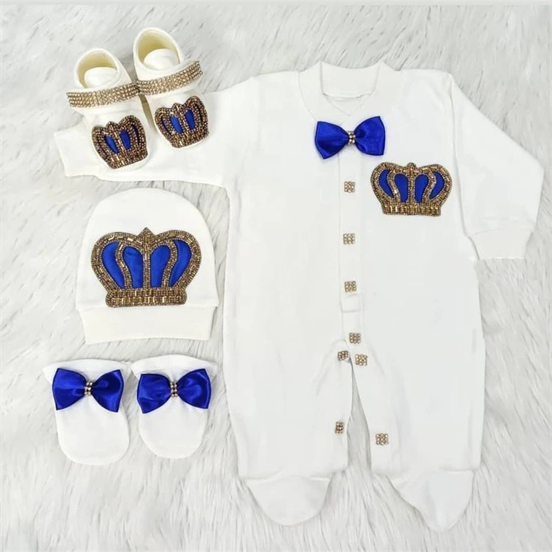 Nuestro Juego de 4 piezas está hecho de algodón suave y grueso. Están adornados con botones de diamantes de imitación, joyas de la Corona y lazos.
