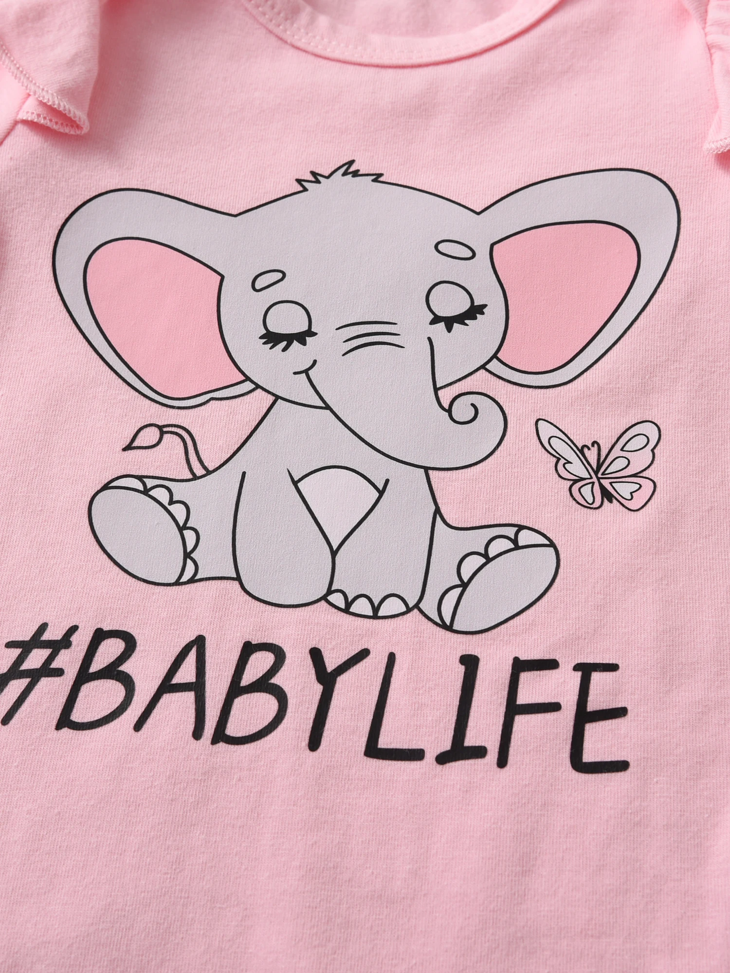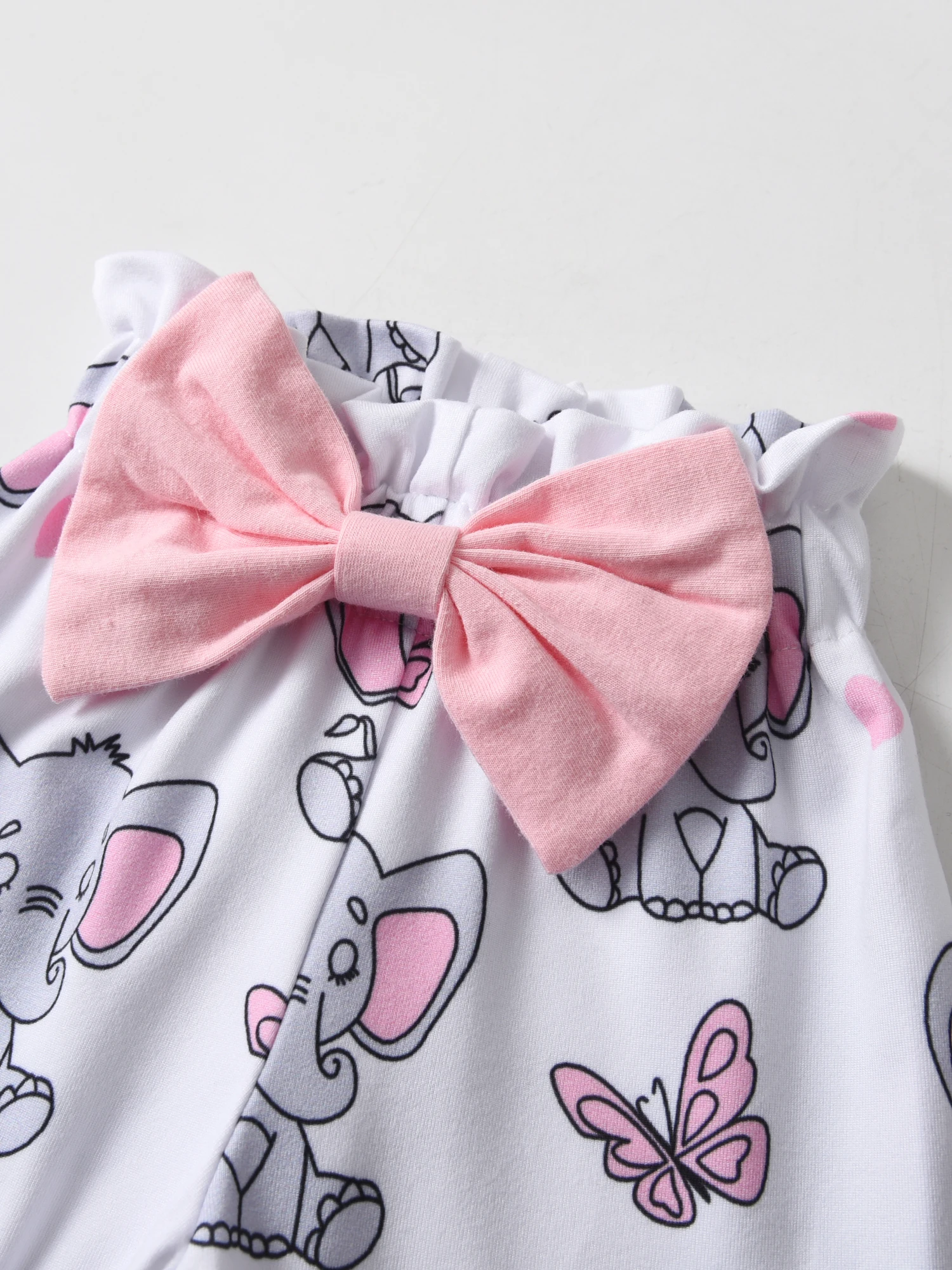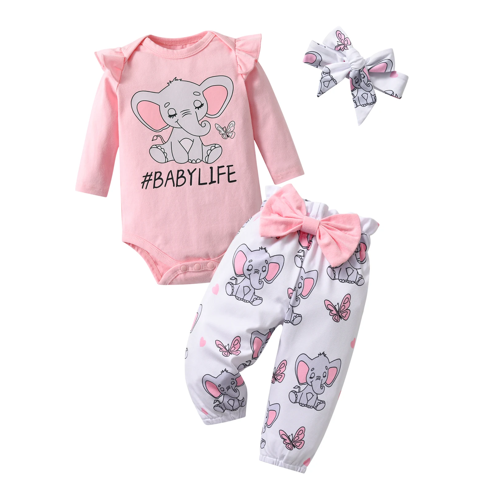 Conjunto de ropa bonita para bebé recién nacido, pelele de manga larga con estampado de elefante, Top con pantalones con lazo, conjunto con diadema, 3 uds.