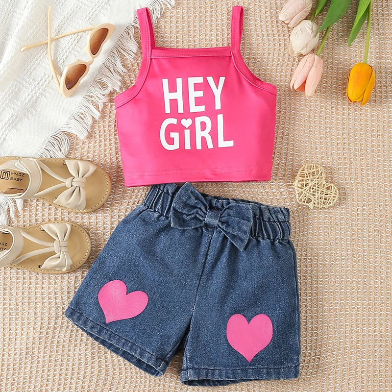 Conjunto de ropa de Boutique para niña pequeña, Tops de algodón sin mangas con letras, pantalones cortos Vaqueros, moda coreana, BC519, verano, 2 piezas