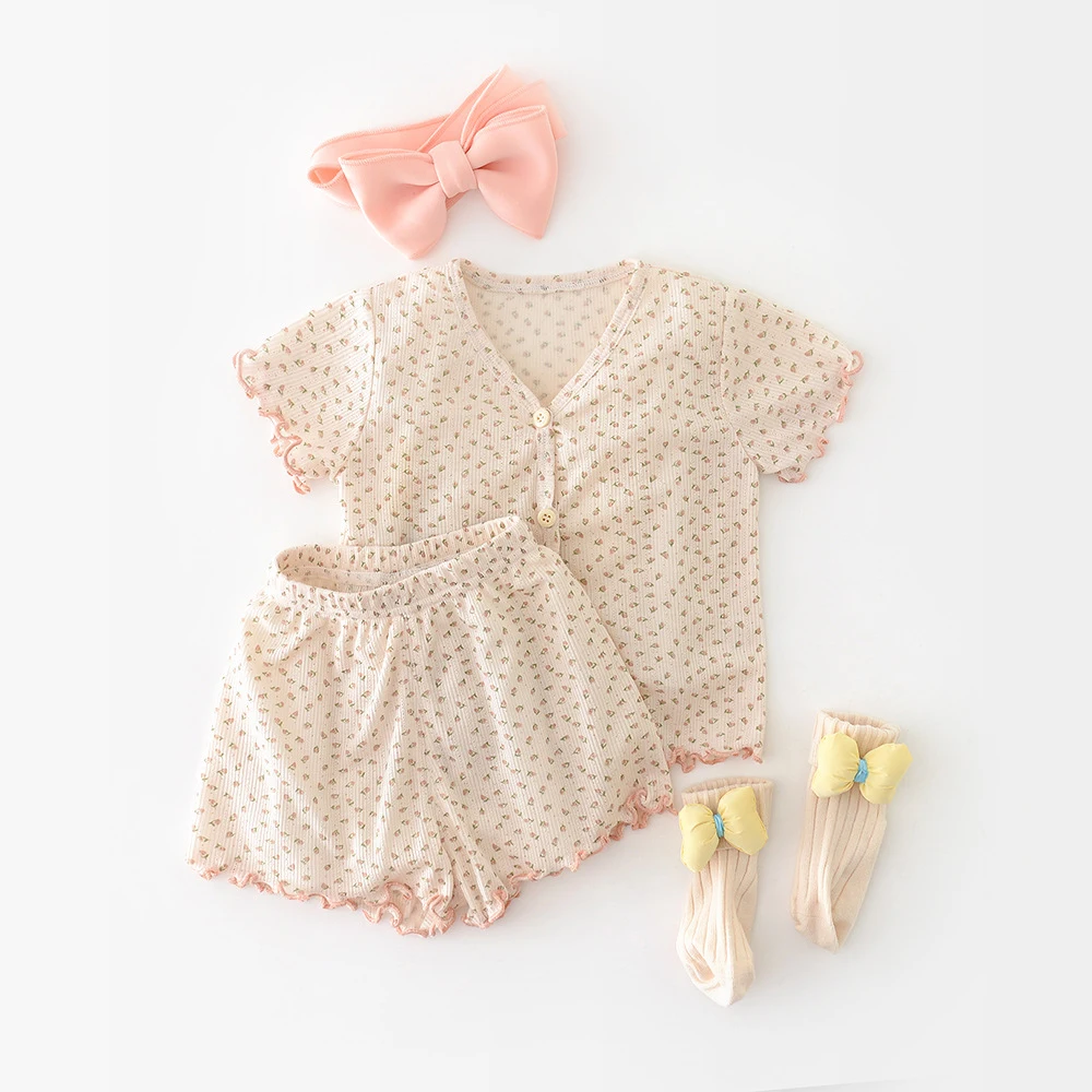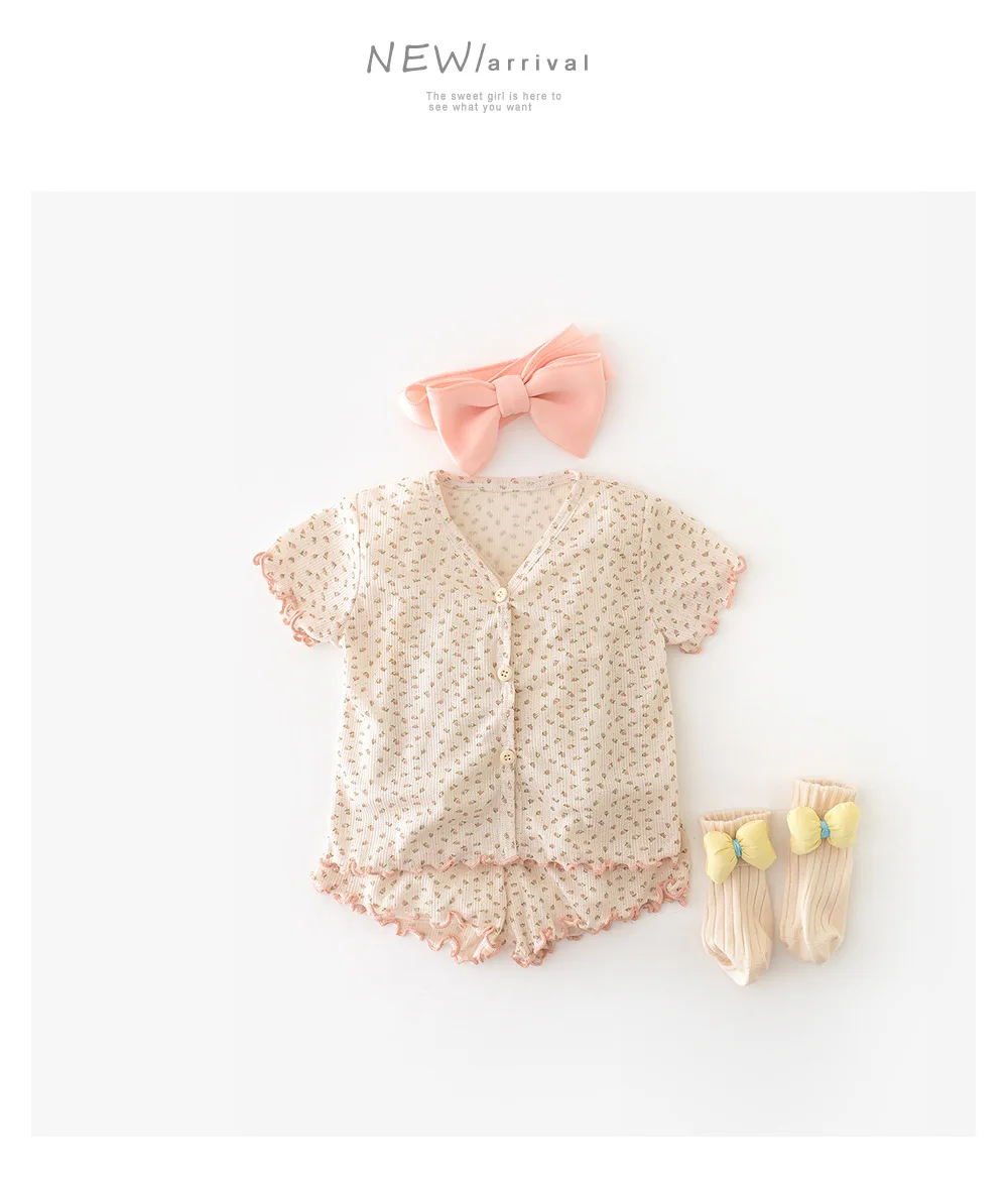 1.**Encantador patrón floral**: Los delicados estampados de flores pequeñas en el set le dan un aspecto dulce y encantador, atractivo para los padres que prefieren estilos lindos para sus bebés.