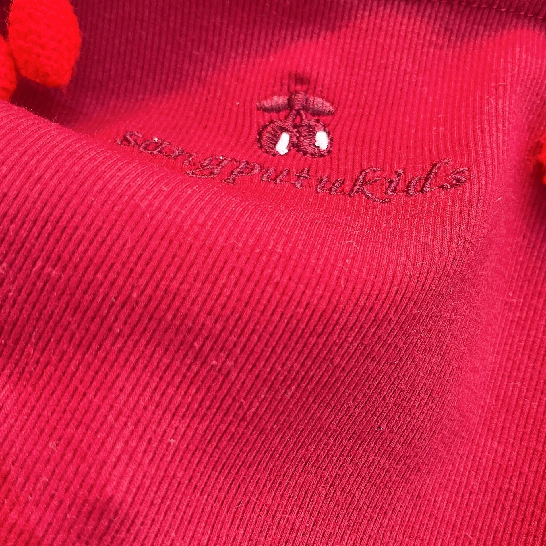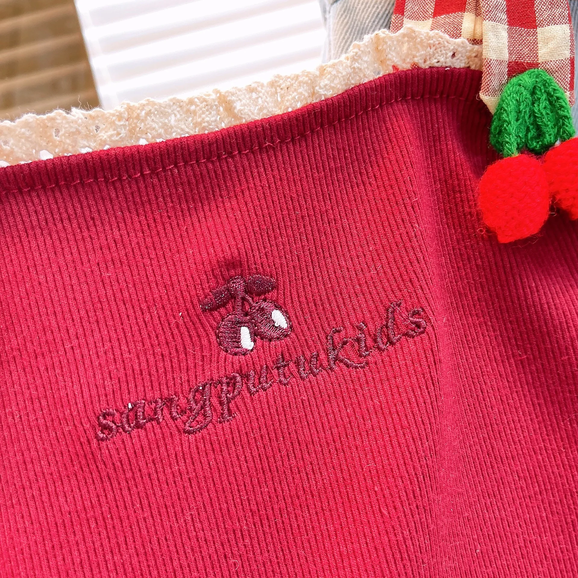 - **Diseño elegante**: la blusa roja con cuello halter presenta una dulce decoración de cereza y correas con lazo de gamuza, mientras que los jeans azul claro muestran detalles rasgados modernos.Una mezcla de ternura y moda.