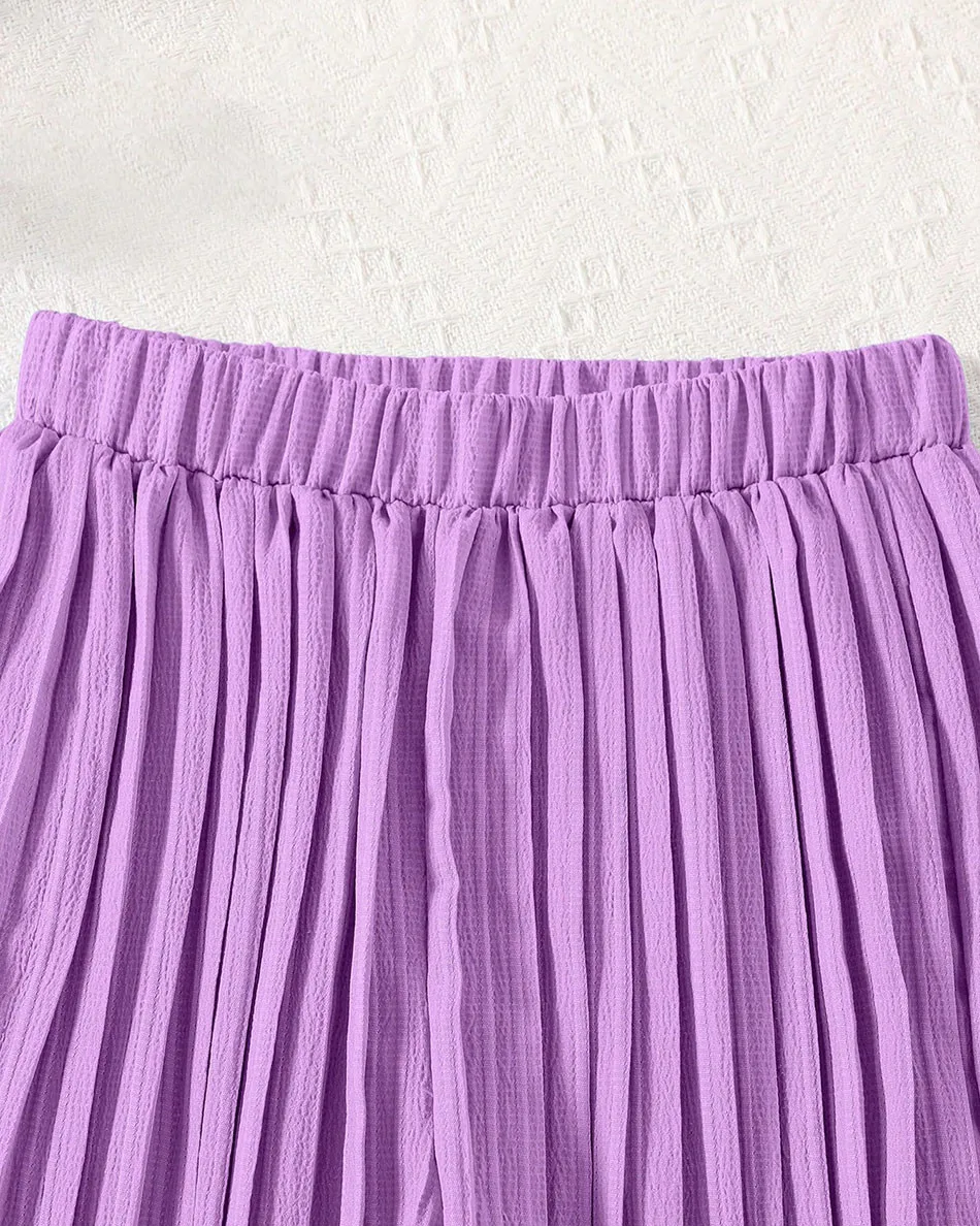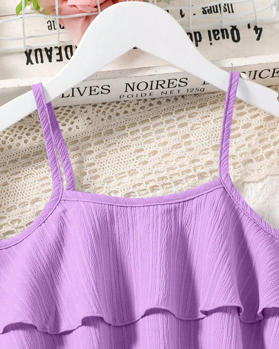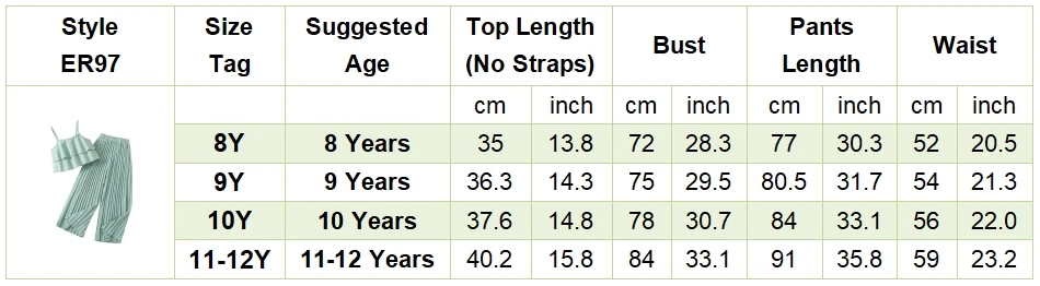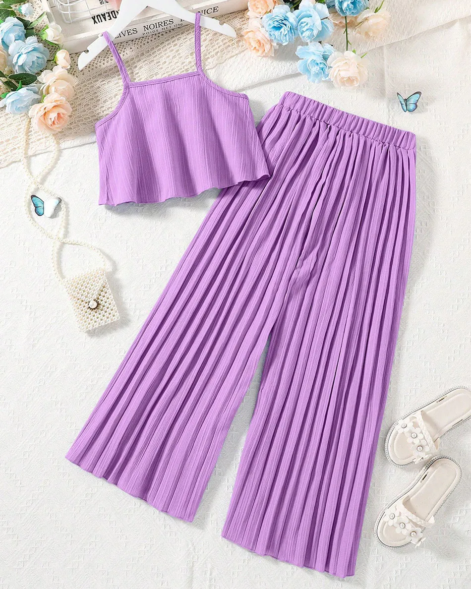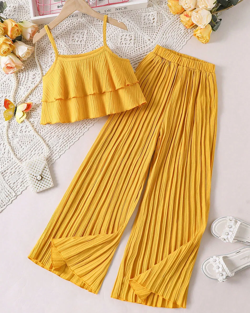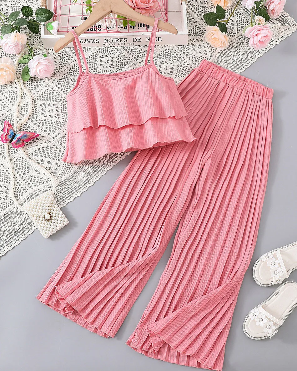 Nombre: Moda de verano para chicas adolescentes. Top de tirantes elegante con dobladillo con volantes y pantalones plisados. Conjunto de ropa elegante de 2 piezas para niños.