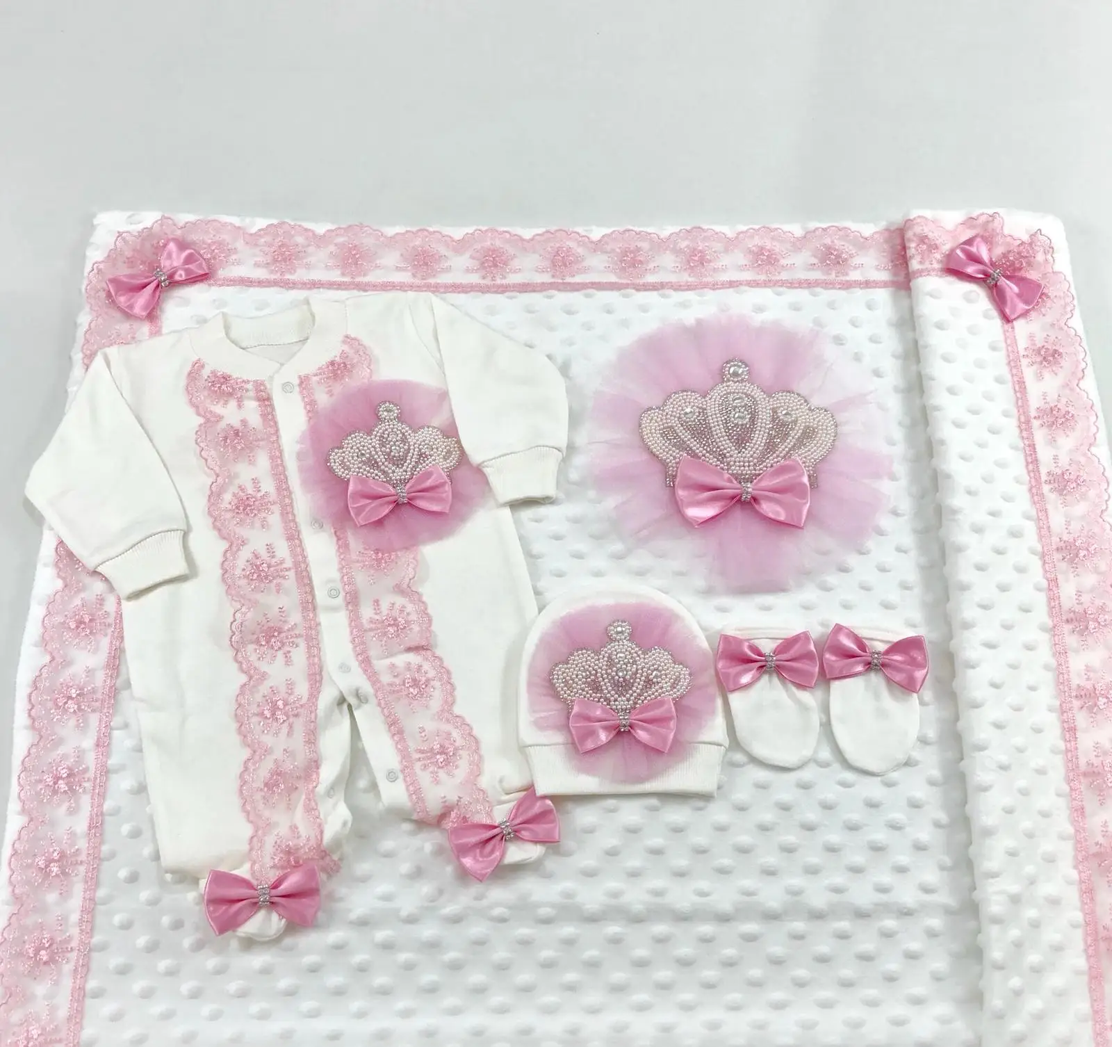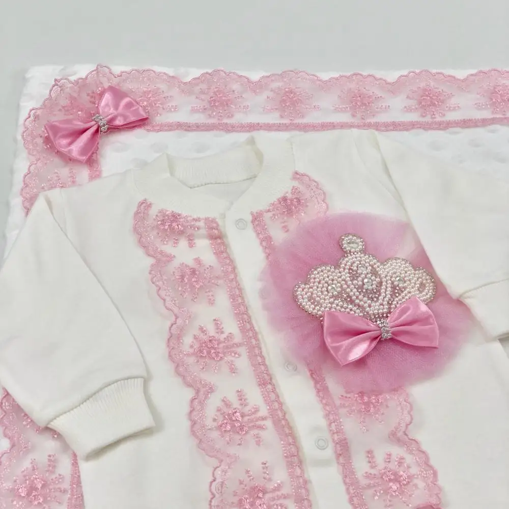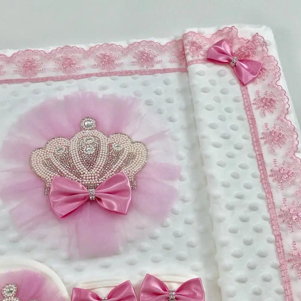 Nuestro juego de 5 piezas está hecho de algodón suave y grueso.Están adornados con botones de diamantes de imitación, joyas de corona y lazos.