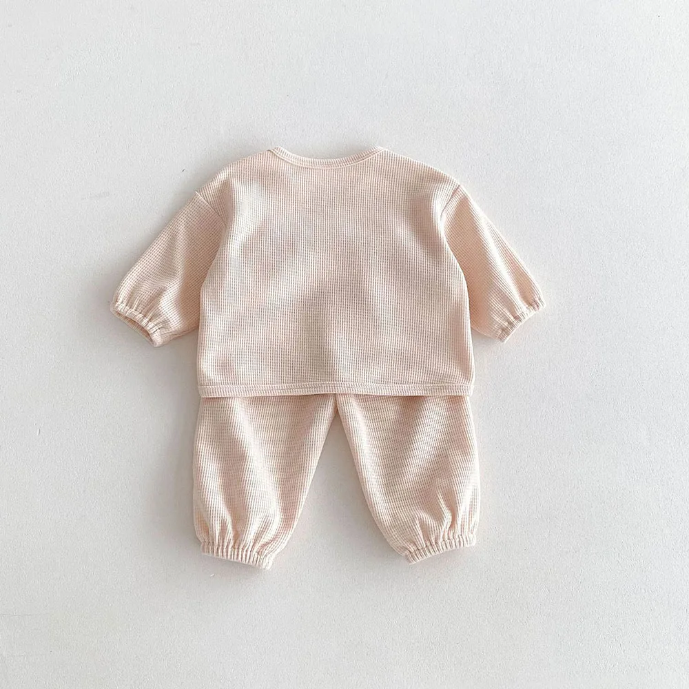 Comprar Conjunto de ropa de gofres para niños y niñas, jersey de Color sólido y pantalones de chándal de 9M a 4T, atuendo holgado sencillo de 2 piezas, novedad de otoño