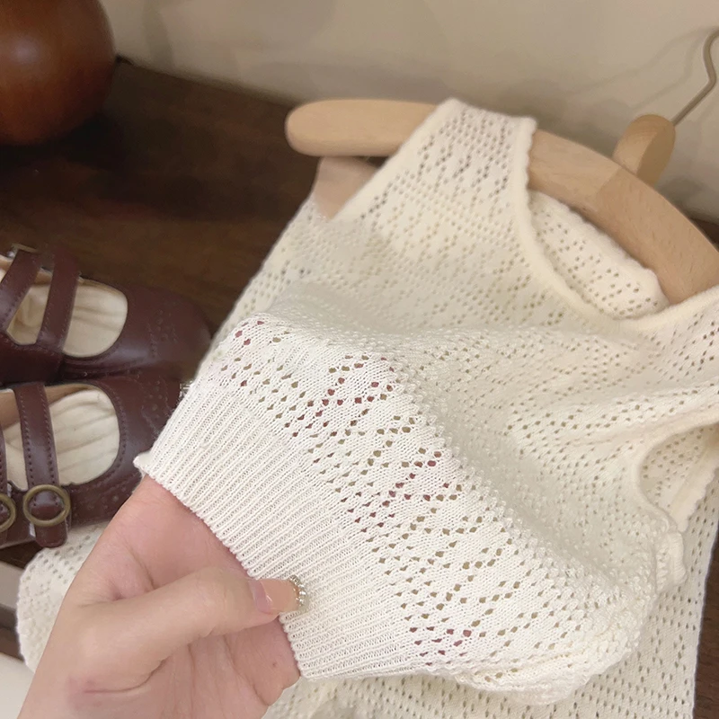 Conjuntos de ropa para niñas, verano 2023, conjunto coreano de punto fino para niñas, chaleco transpirable hueco para niños + Pantalones de pierna ancha, traje de dos piezas