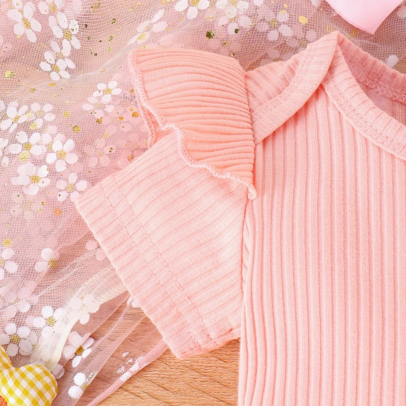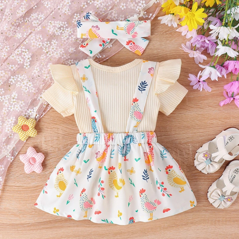 Conjunto de ropa para niñas pequeñas, camiseta de manga corta con volantes sólidos + monos con estampado infantil + diadema, trajes informales para bebés, regalo para bebés D2L