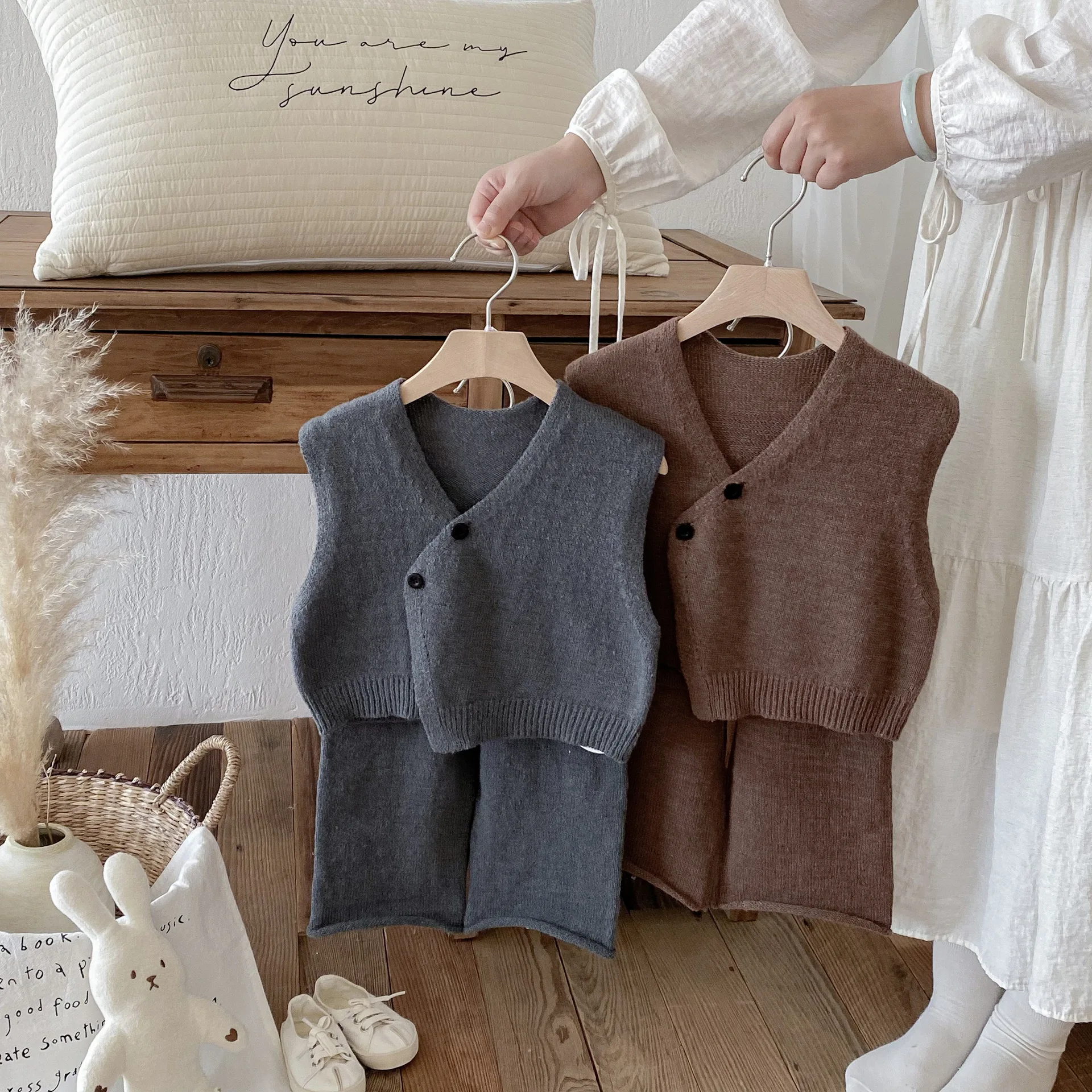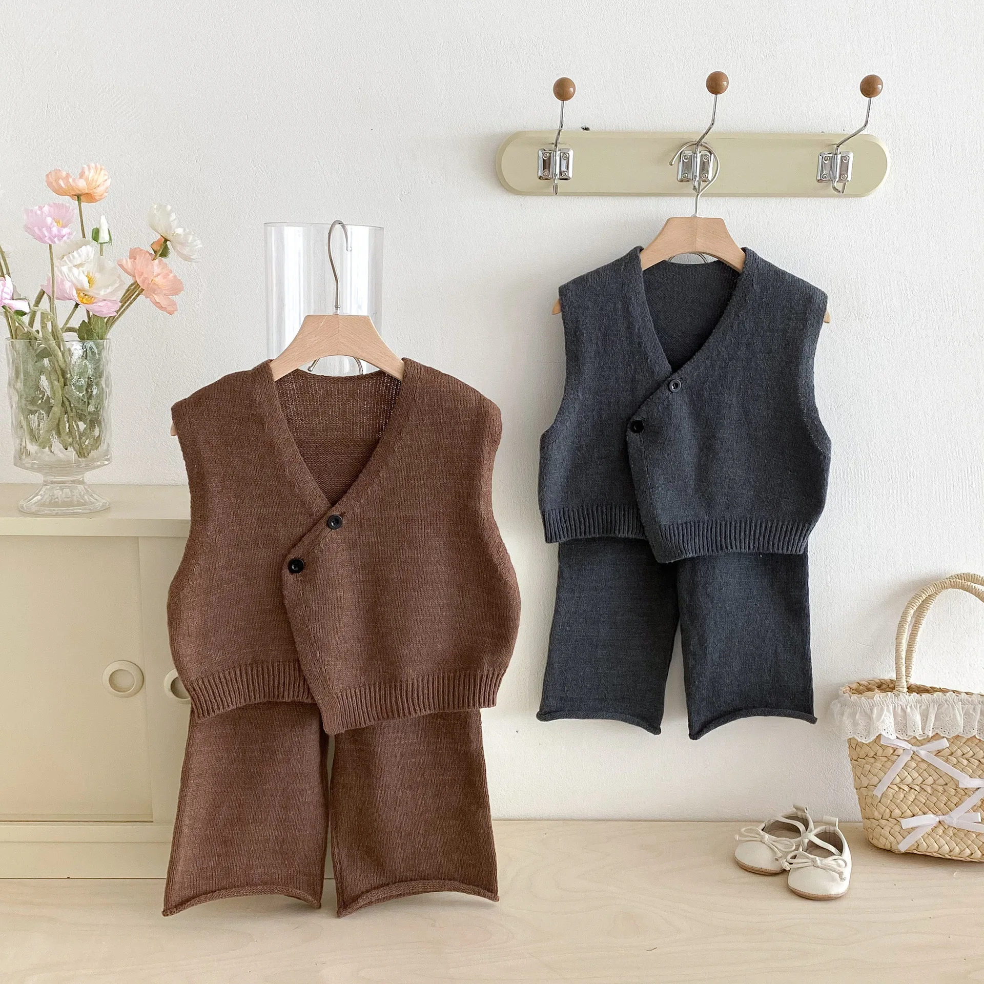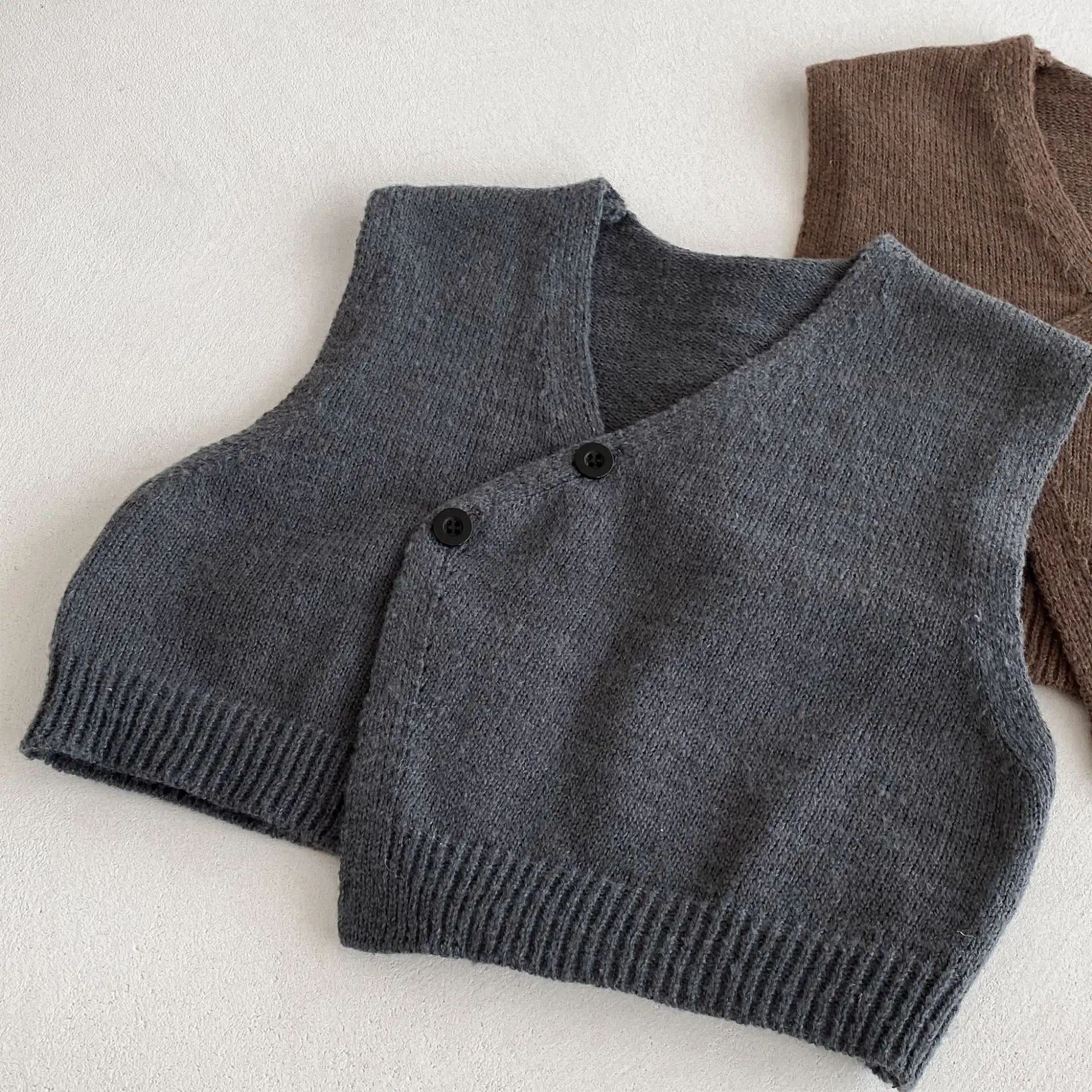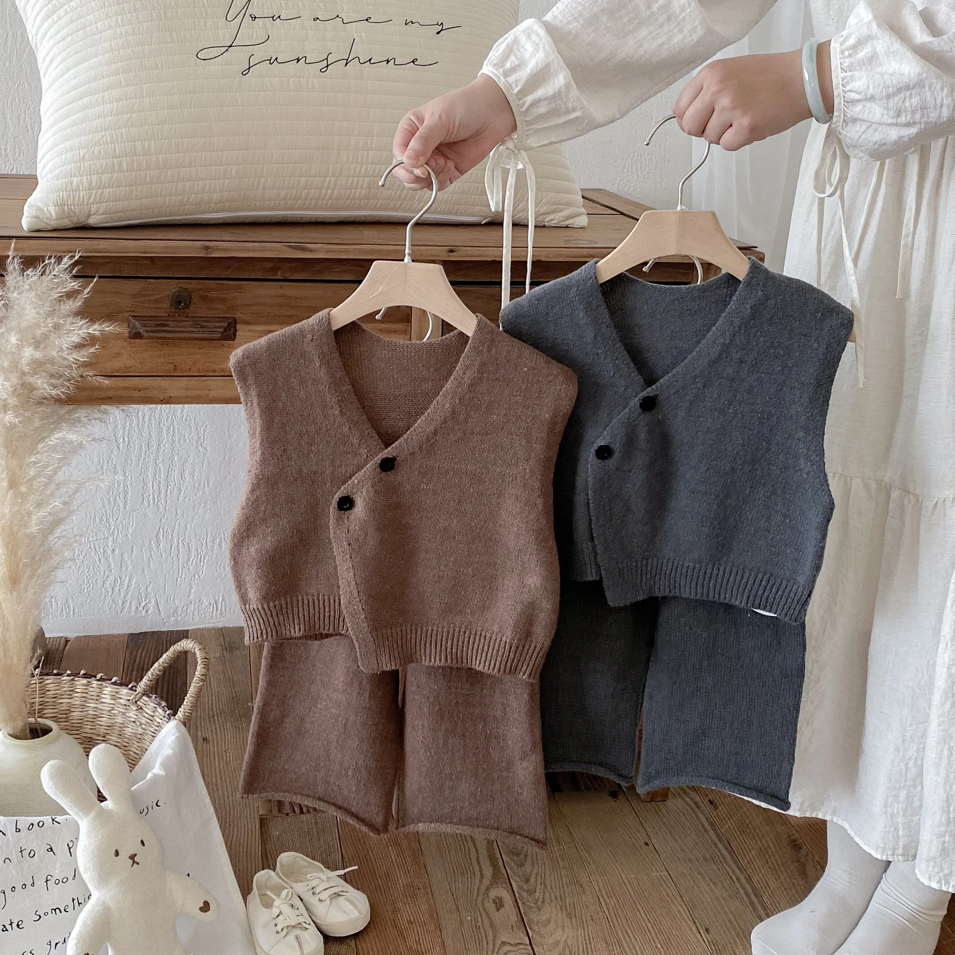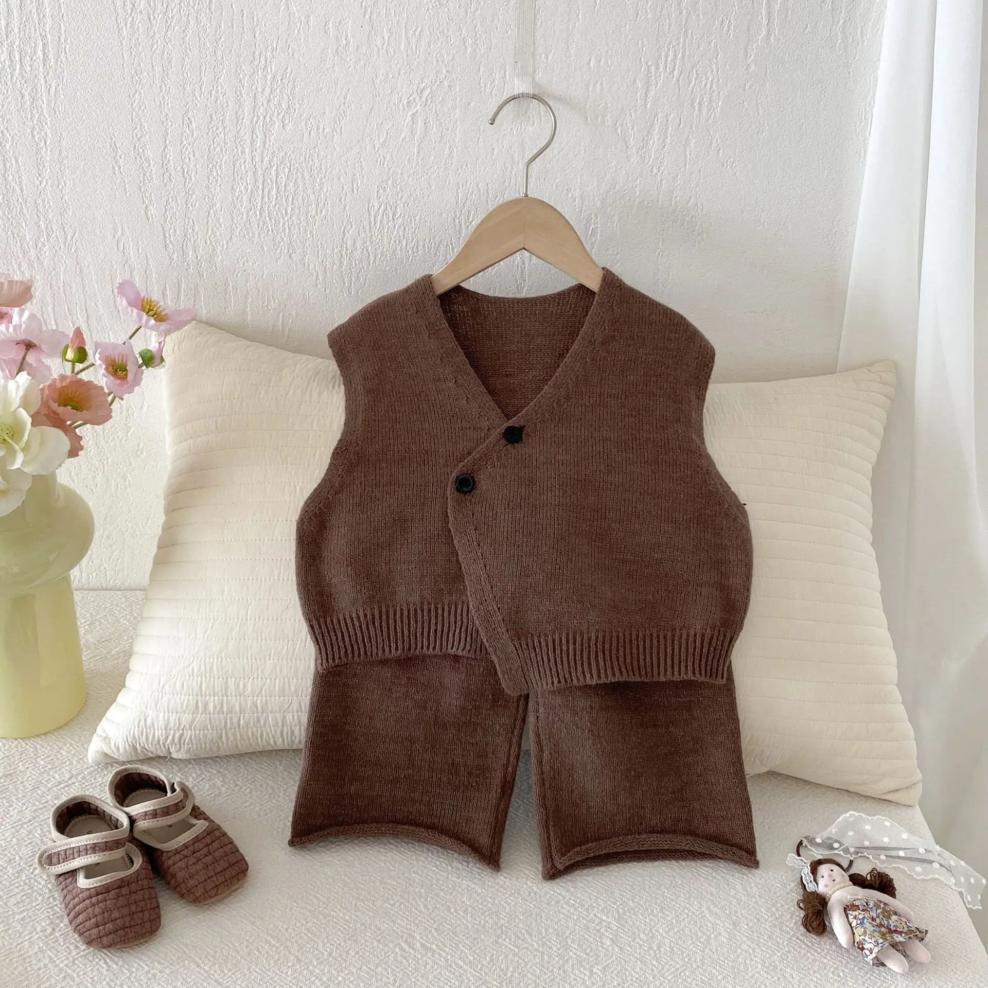 Este conjunto de punto para niños presenta un diseño holgado de estilo japonés y coreano.El chaleco tiene un botón asimétrico en la parte delantera, añadiendo un toque de moda.Disponible en colores clásicos como el gris y el marrón, aporta una sensación de sencillez y elegancia.Perfecto para crear un look lindo y moderno para niños y niñas en otoño.