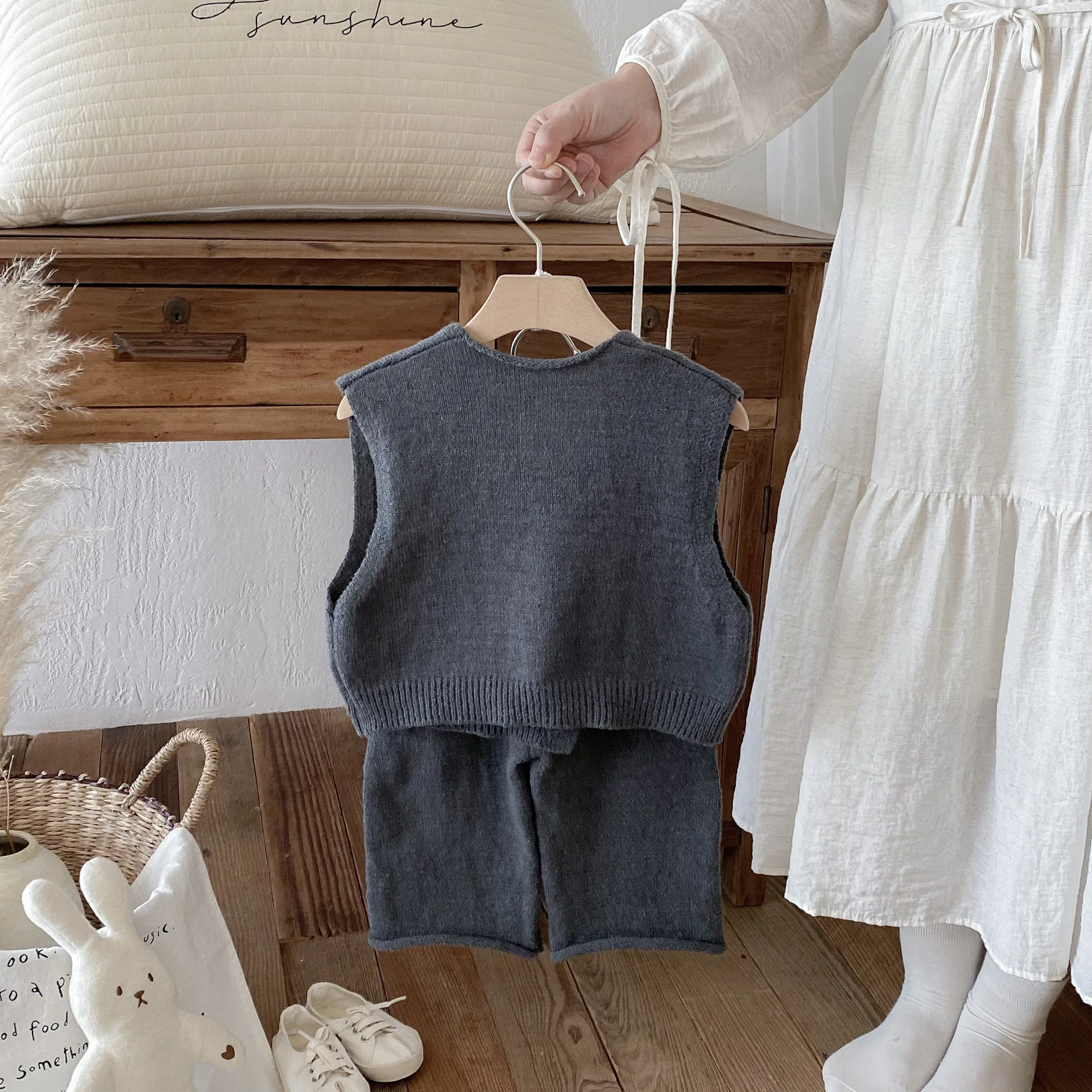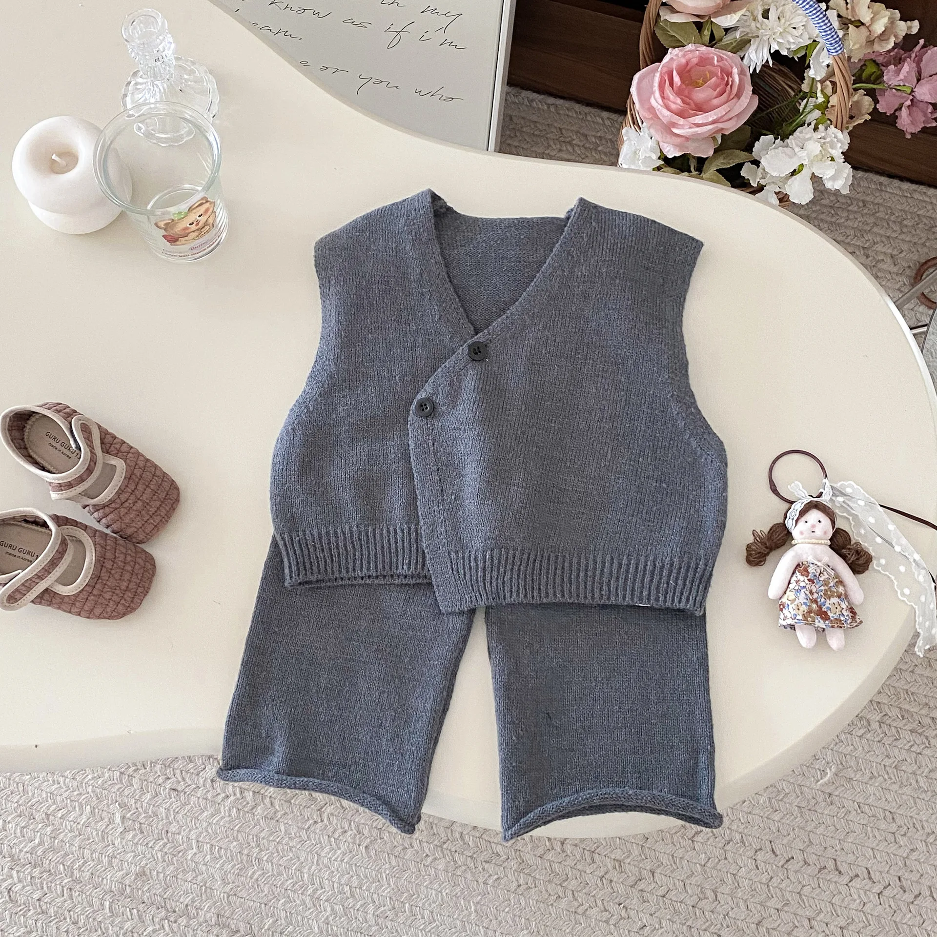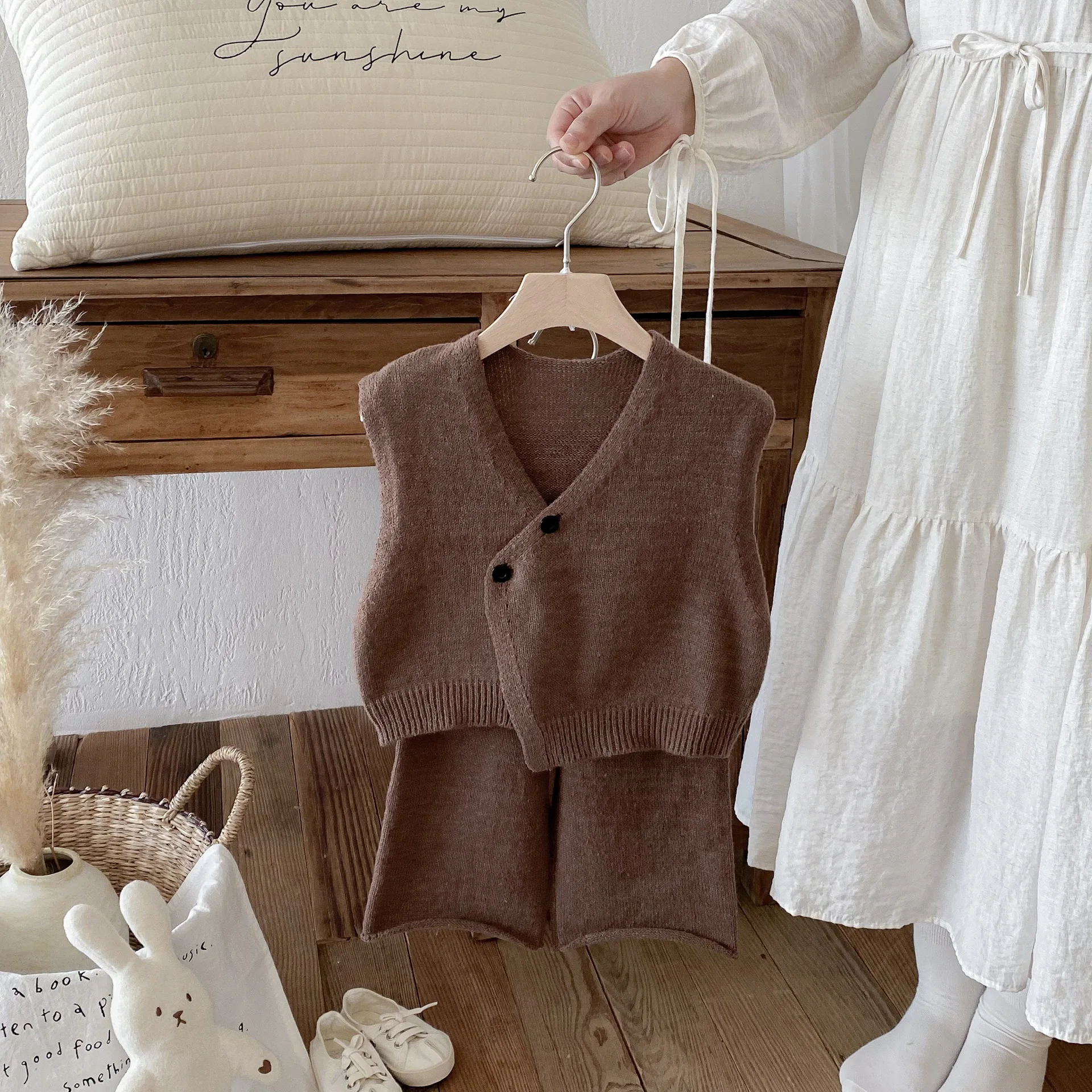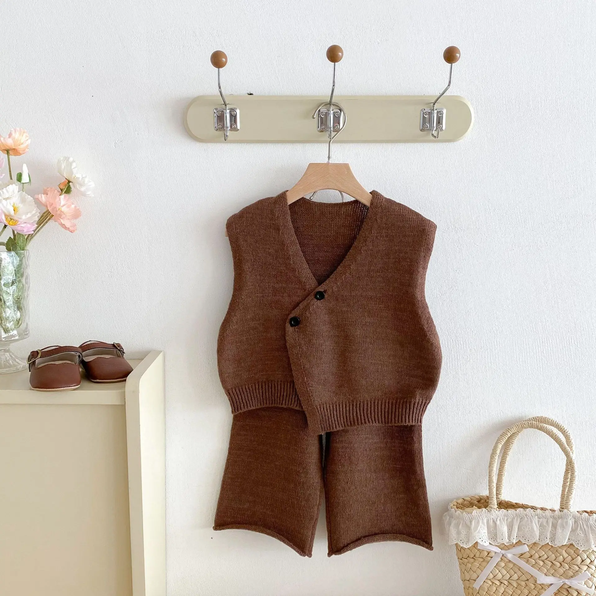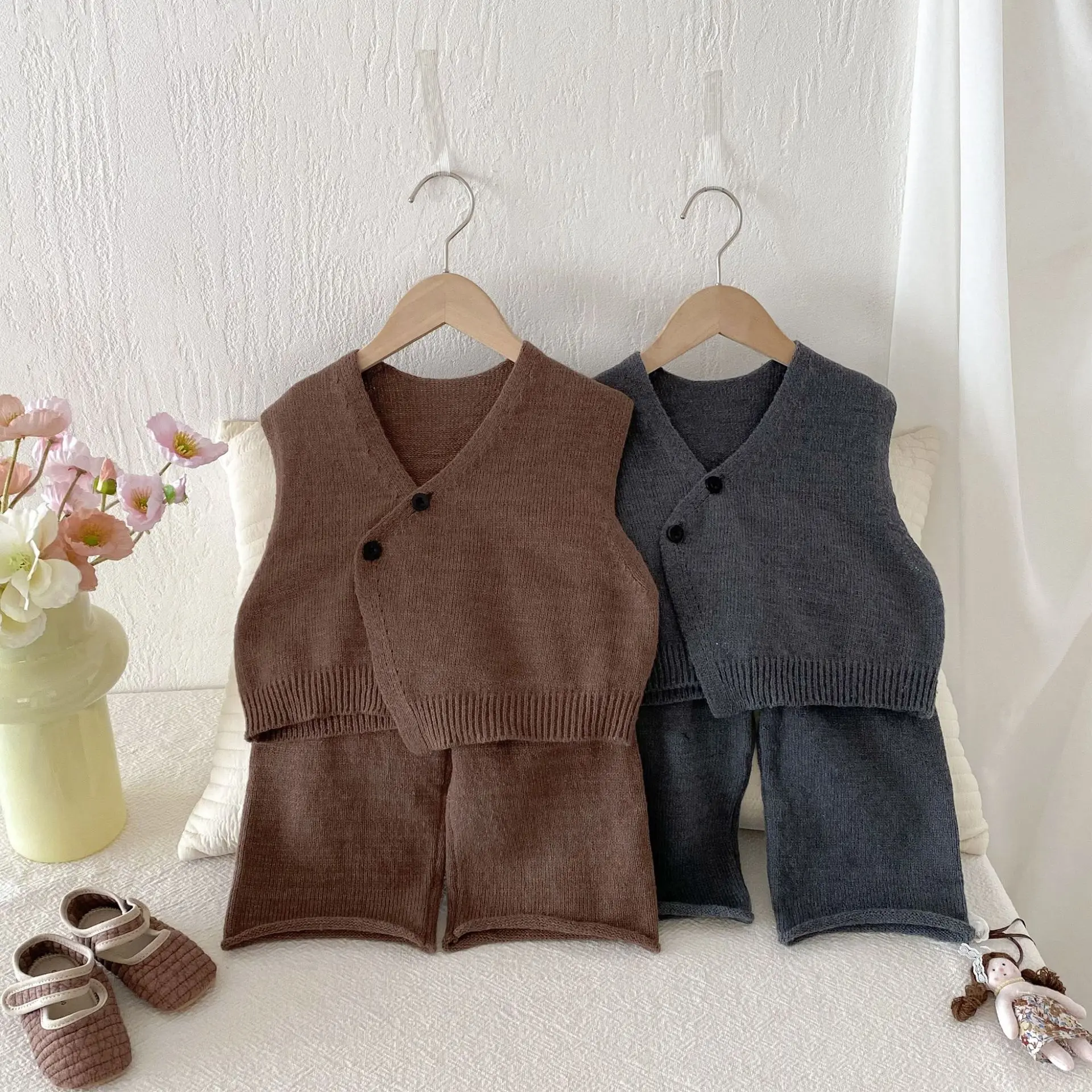 Este conjunto de punto para niños presenta un diseño holgado de estilo japonés y coreano.El chaleco tiene un botón asimétrico en la parte delantera, añadiendo un toque de moda.Disponible en colores clásicos como el gris y el marrón, aporta una sensación de sencillez y elegancia.Perfecto para crear un look lindo y moderno para niños y niñas en otoño.