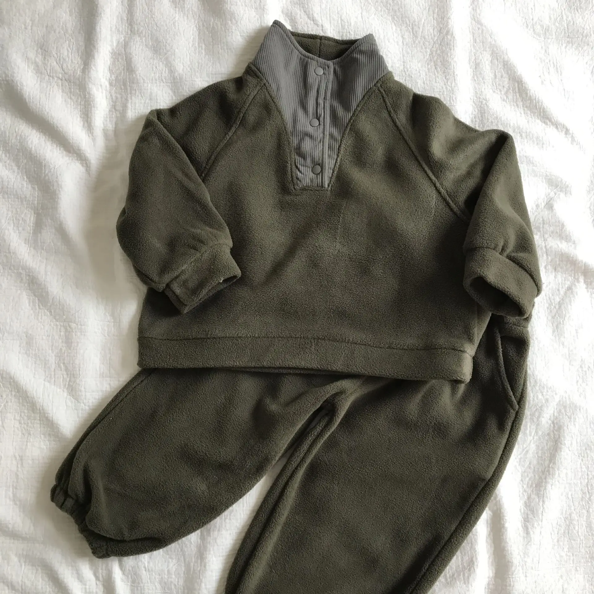 2. Diseño elegante y versátil: con un conjunto informal simple de dos piezas (sudadera + pantalones con puños) con cuello alto y detalle de media tapeta, es moderno y adaptable, perfecto tanto para niños como para niñas.