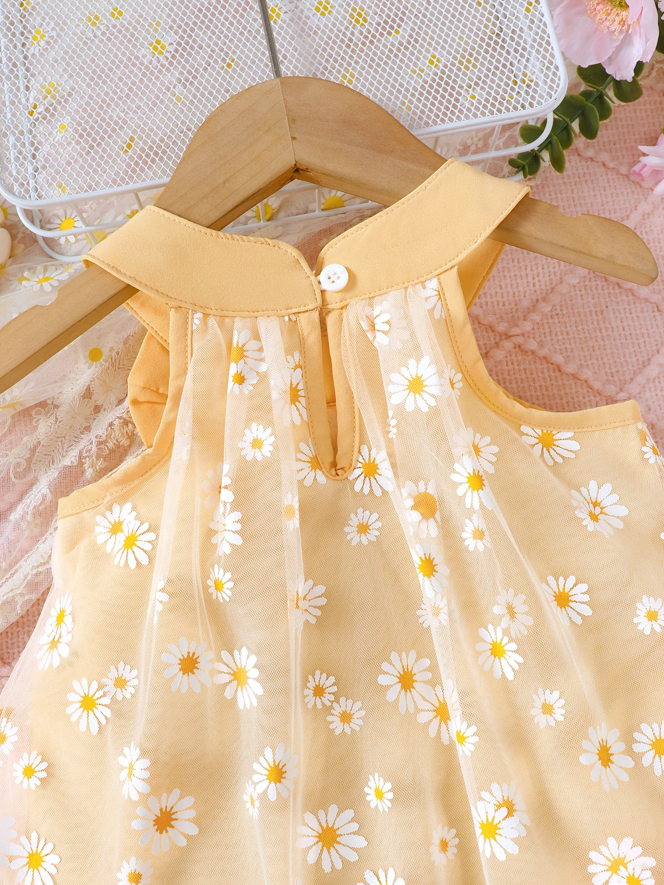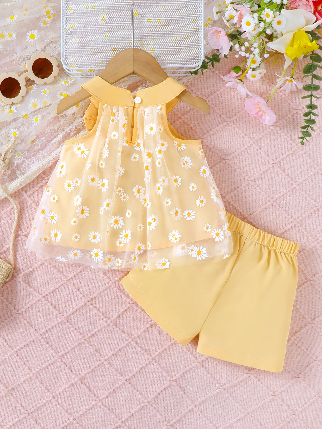 Conjunto de ropa para niños pequeños de 0 a 3 años, Top de malla con margaritas sin mangas y hombros descubiertos + Pantalones cortos, traje fresco de verano, conjunto de vacaciones de moda, 2 uds.