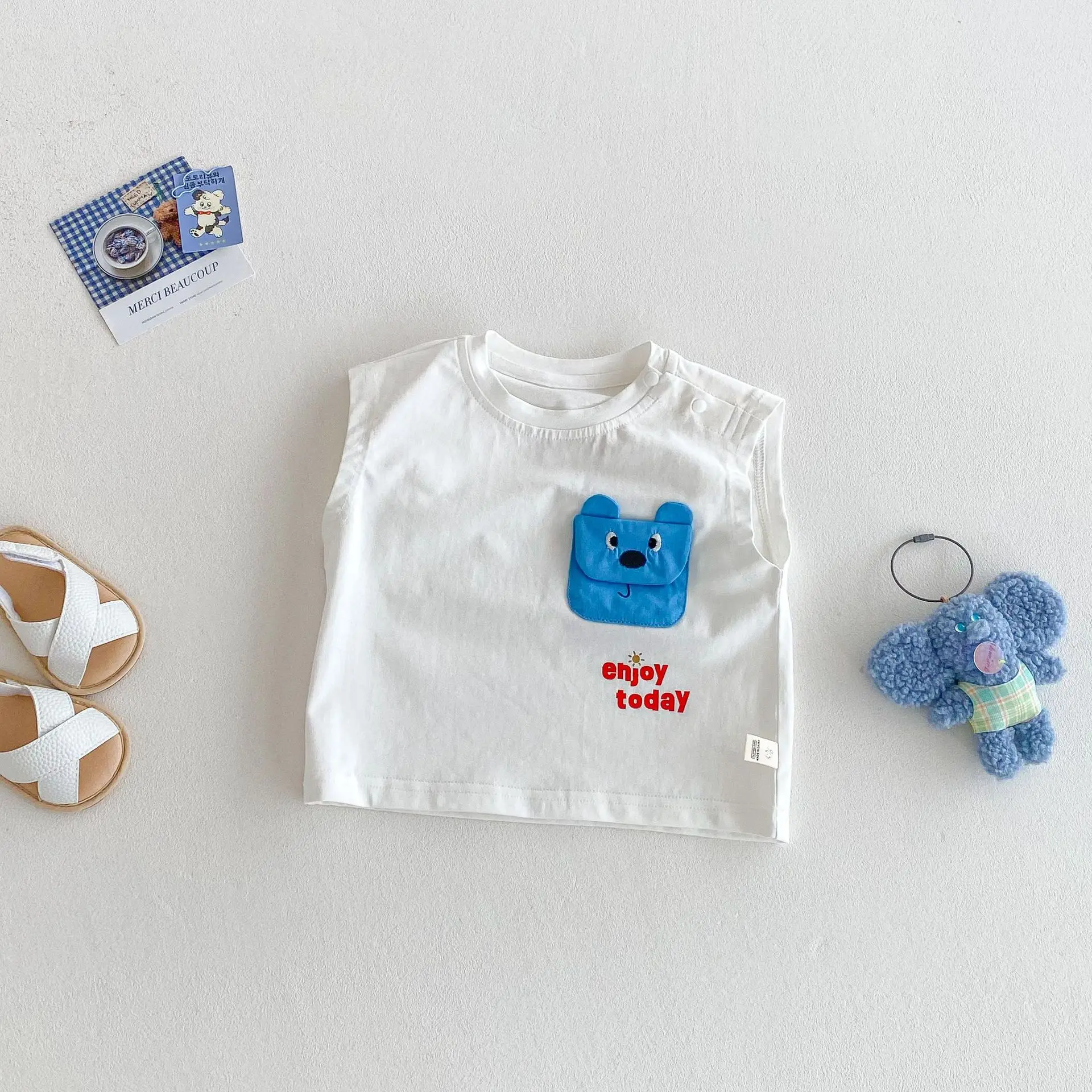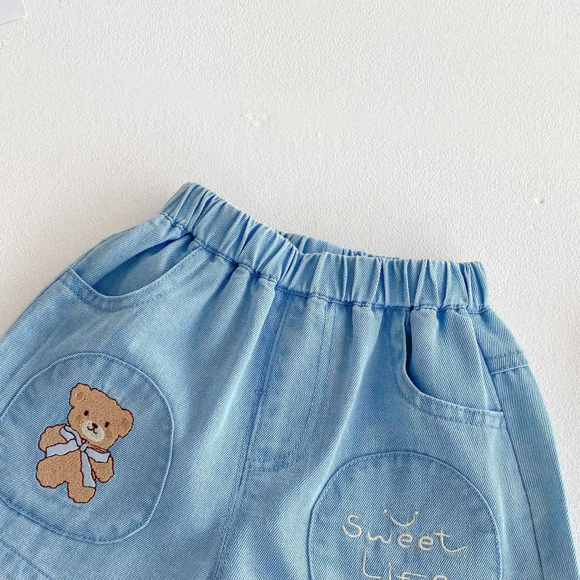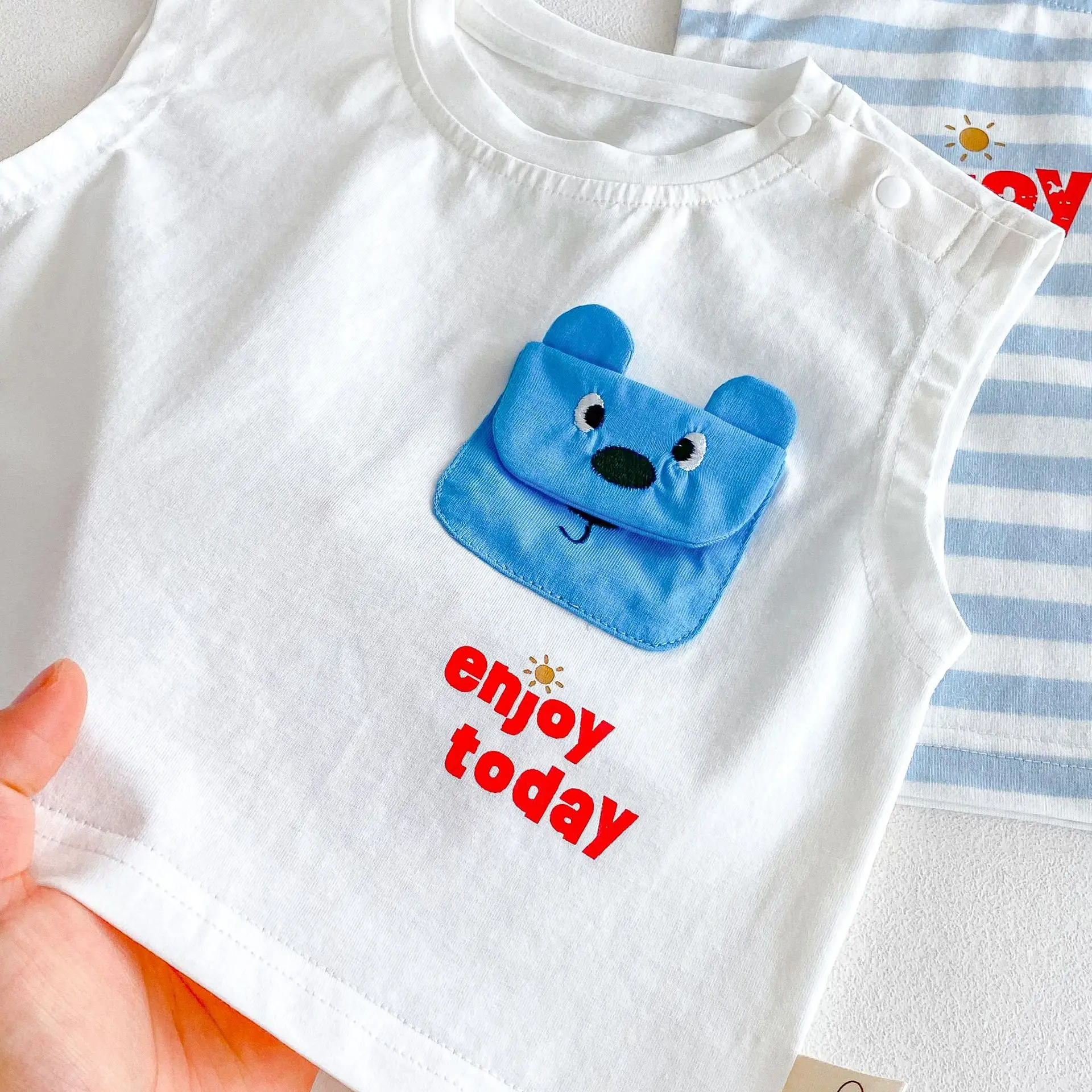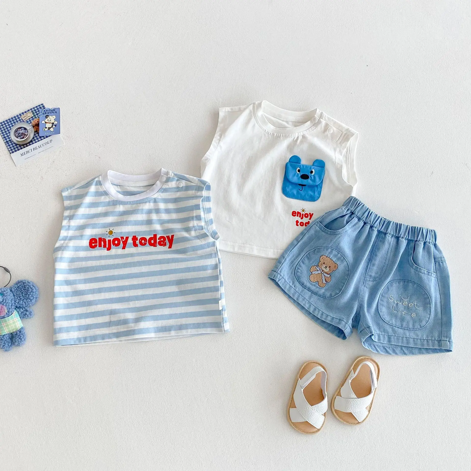Chalecos a rayas para niños con estampados modernos, pantalones cortos de mezclilla para niñas con lindos bordados de osos, moda para todos los niños.