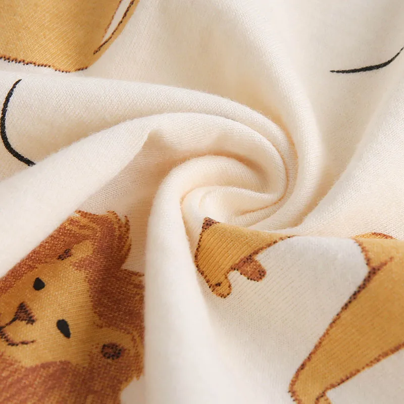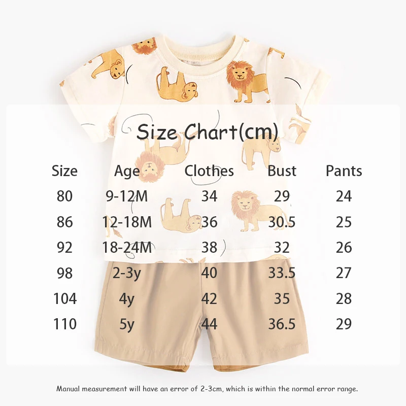 1.**Lindo camiseta con estampado de leones**:Este conjunto de verano para niños de 1 a 5 años incluye una camiseta con un estampado completo de lindos leones en varias posturas.Los divertidos patrones de león en tonos marrones cálidos sobre un fondo claro añaden un encanto divertido y salvaje, haciendo que su hijo luzca adorable.