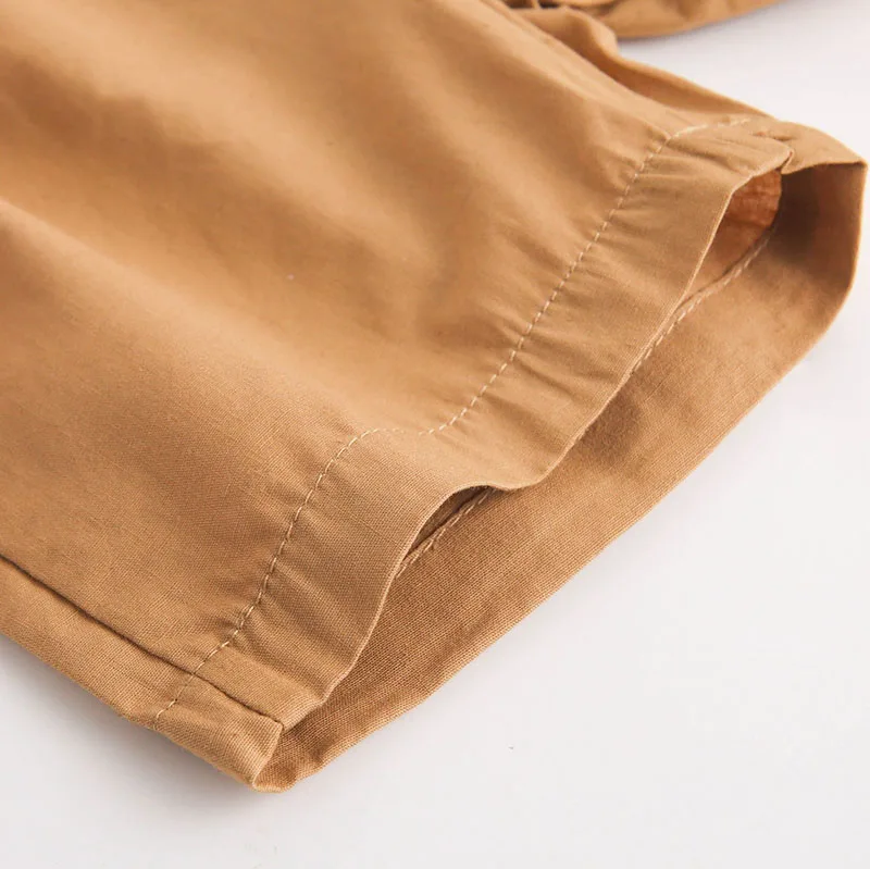2.**Pantalones cortos cómodos y elegantes**: Los pantalones cortos caqui a juego cuentan con una cintura elástica con cordón negro para un fácil ajuste, lo que garantiza un ajuste cómodo.El diseño simple pero elegante también hace que sean fáciles de combinar con otras blusas.