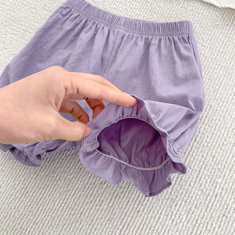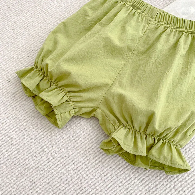 1.**Diseño elegante y adorable**: este conjunto para bebé presenta un top blanco con encantadoras mangas con volantes y delicados bordados en morado o verde.Combinado con pantalones cortos morados o verdes a juego que tienen lindos dobladillos con volantes, crea una apariencia atractiva y elegante perfecta para bebés de 0 a 2 años.