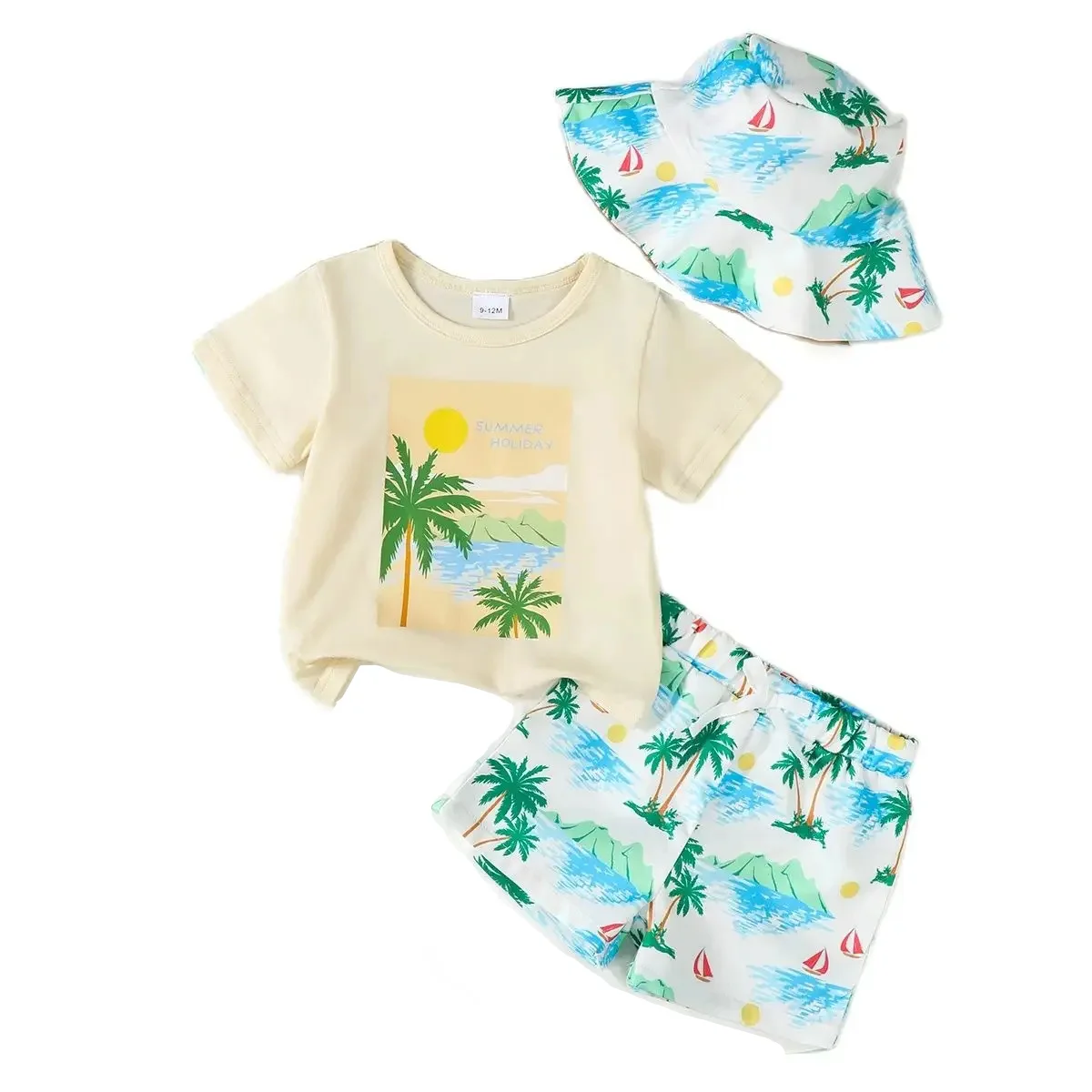 Conjunto de vacaciones hawaianas para niños, camiseta de manga corta, pantalones cortos florales y sombrero estampado a juego, conjunto de ropa de bebé estilo isla de verano