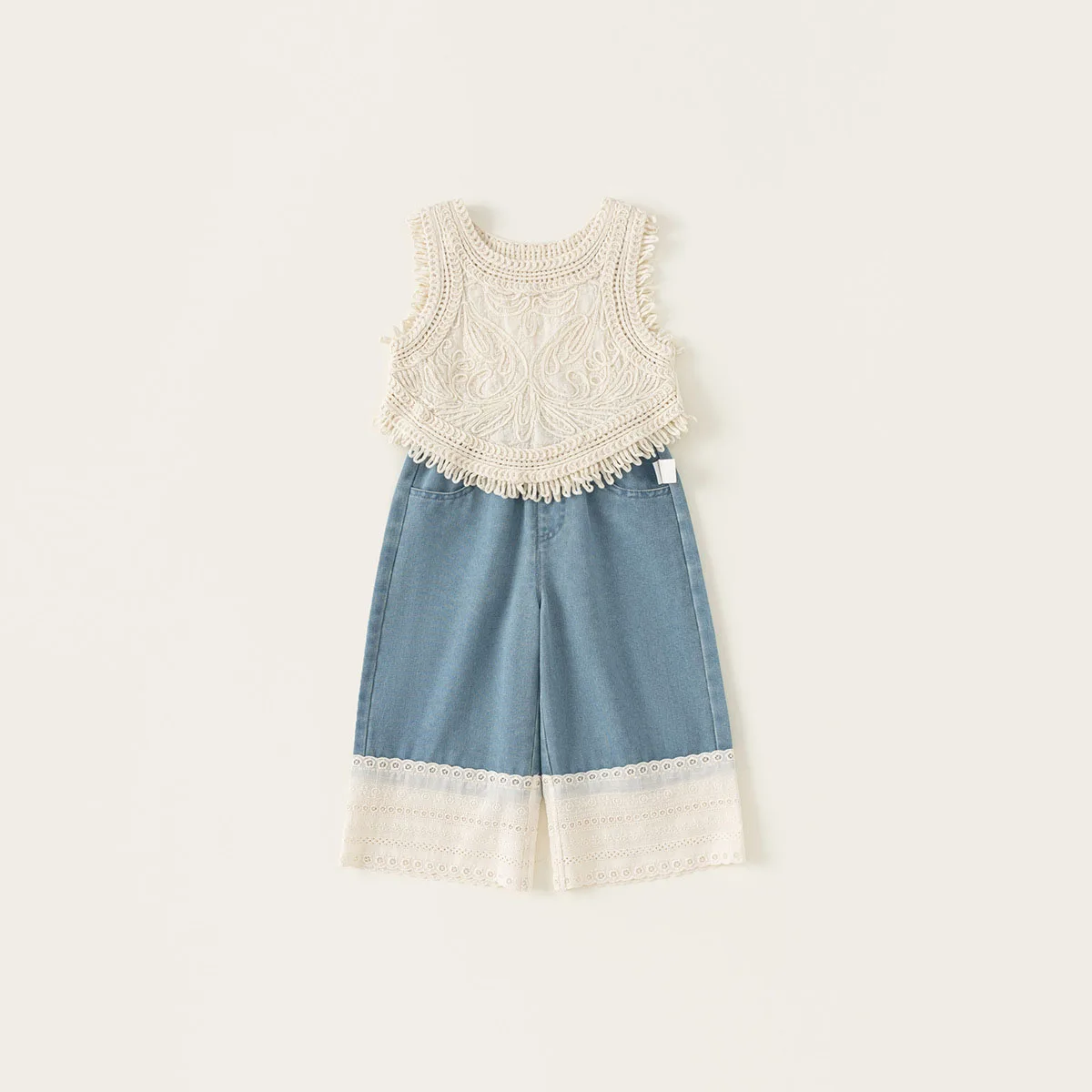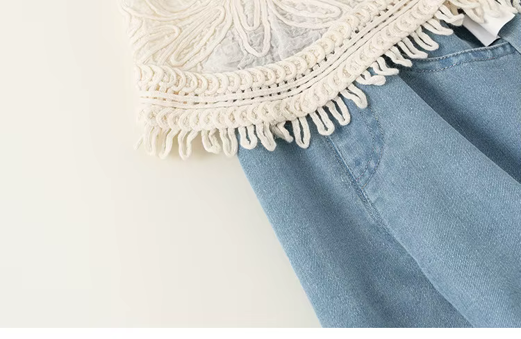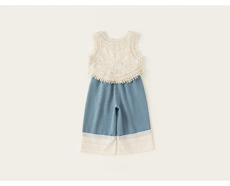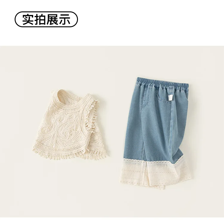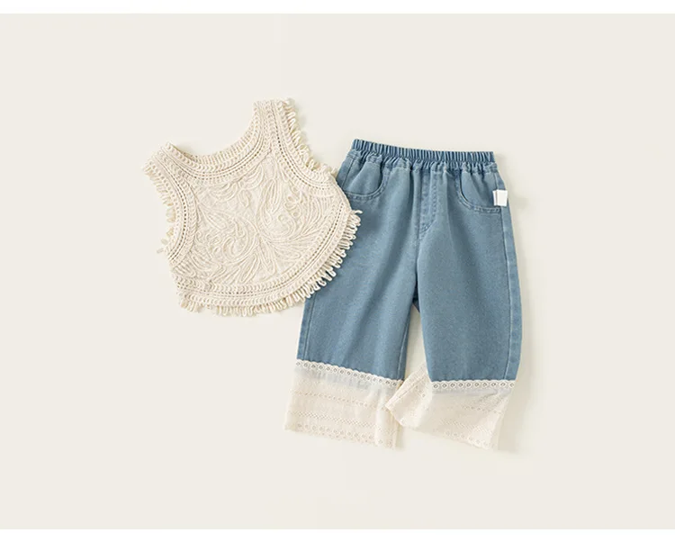 Comprar Conjuntos de 2 piezas de ropa de verano para niña, Tops sin mangas de algodón con encaje a la moda coreana + pantalones vaqueros holgados con empalme, ropa de Boutique para niños B098