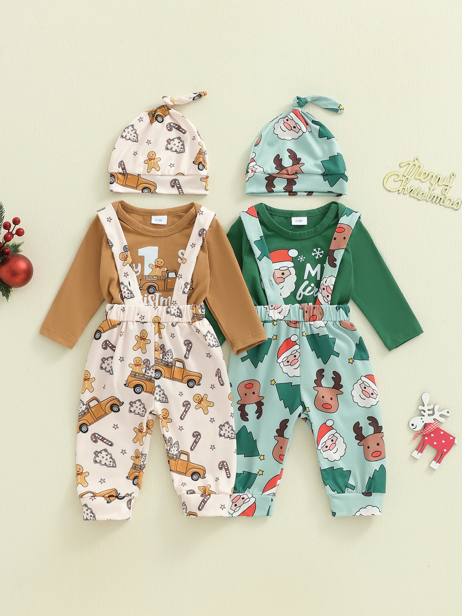 Conjuntos de 3 piezas para bebés de 0 a 18 meses, mameluco de manga larga con cuello redondo, pantalones con estampado de Papá Noel/pan de jengibre, sombrero