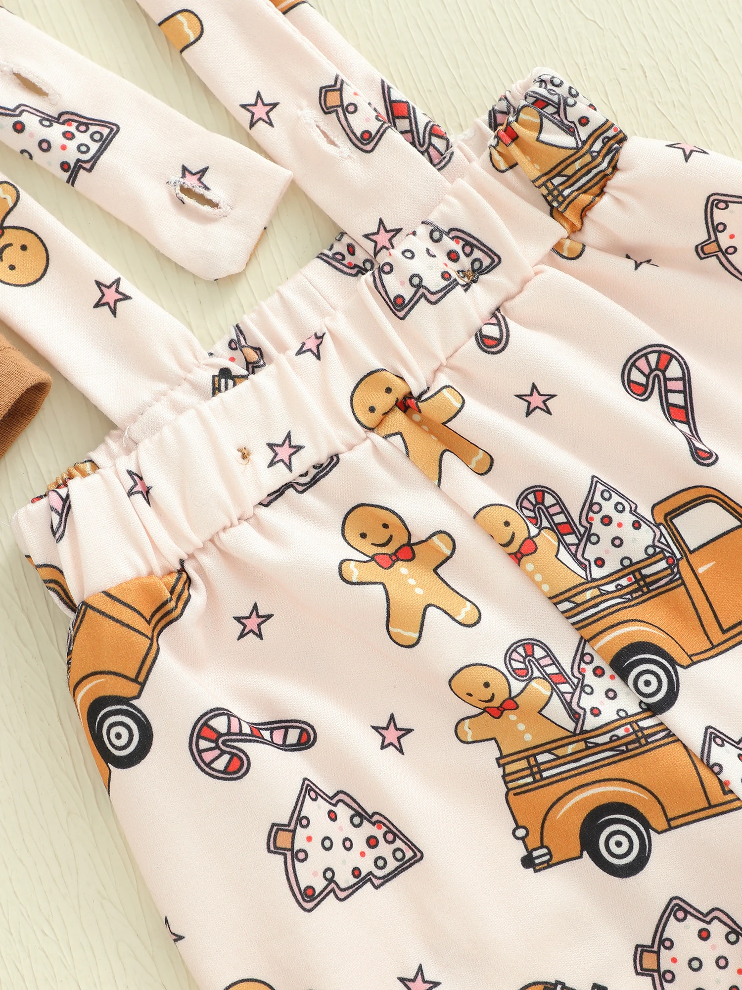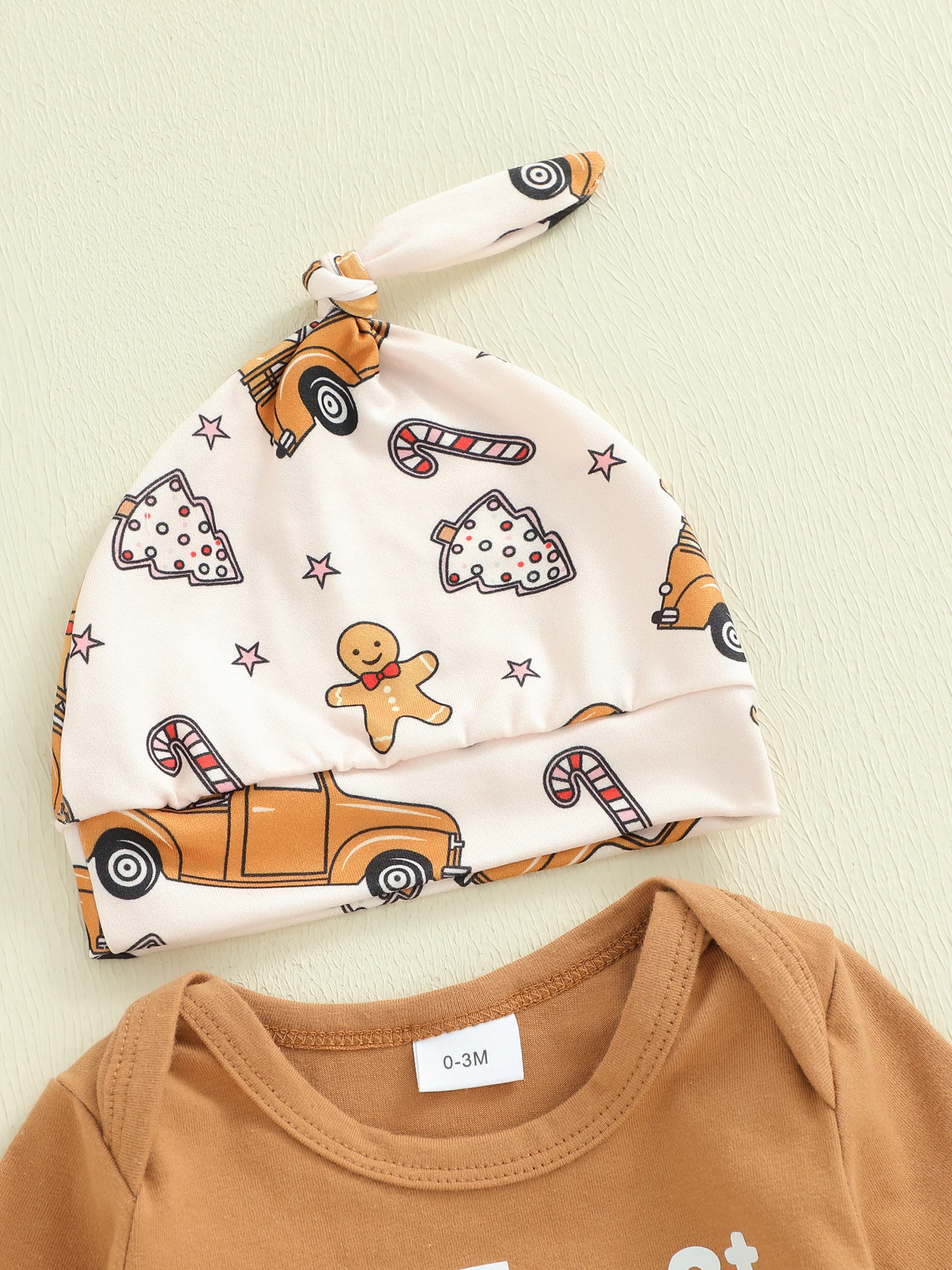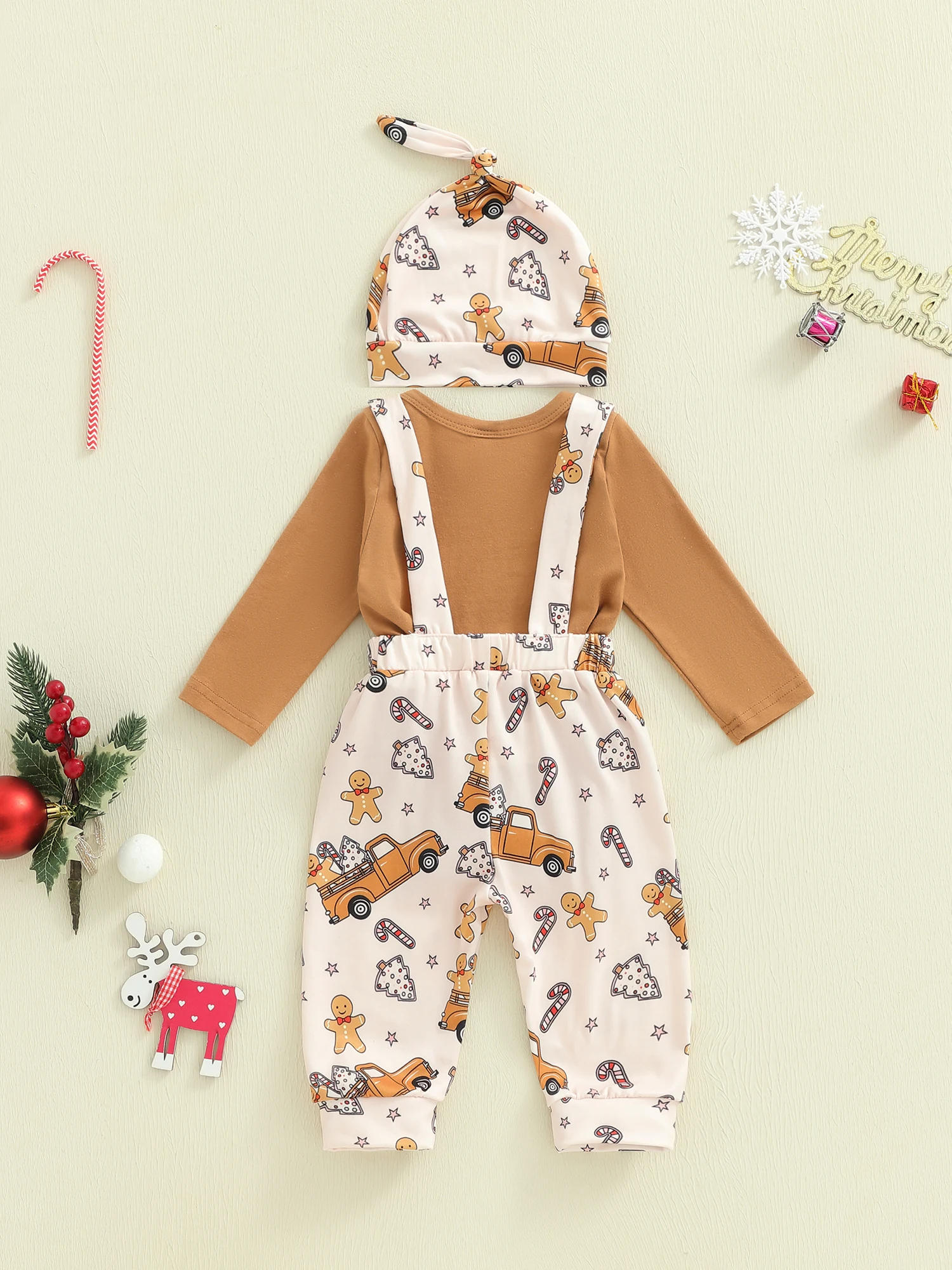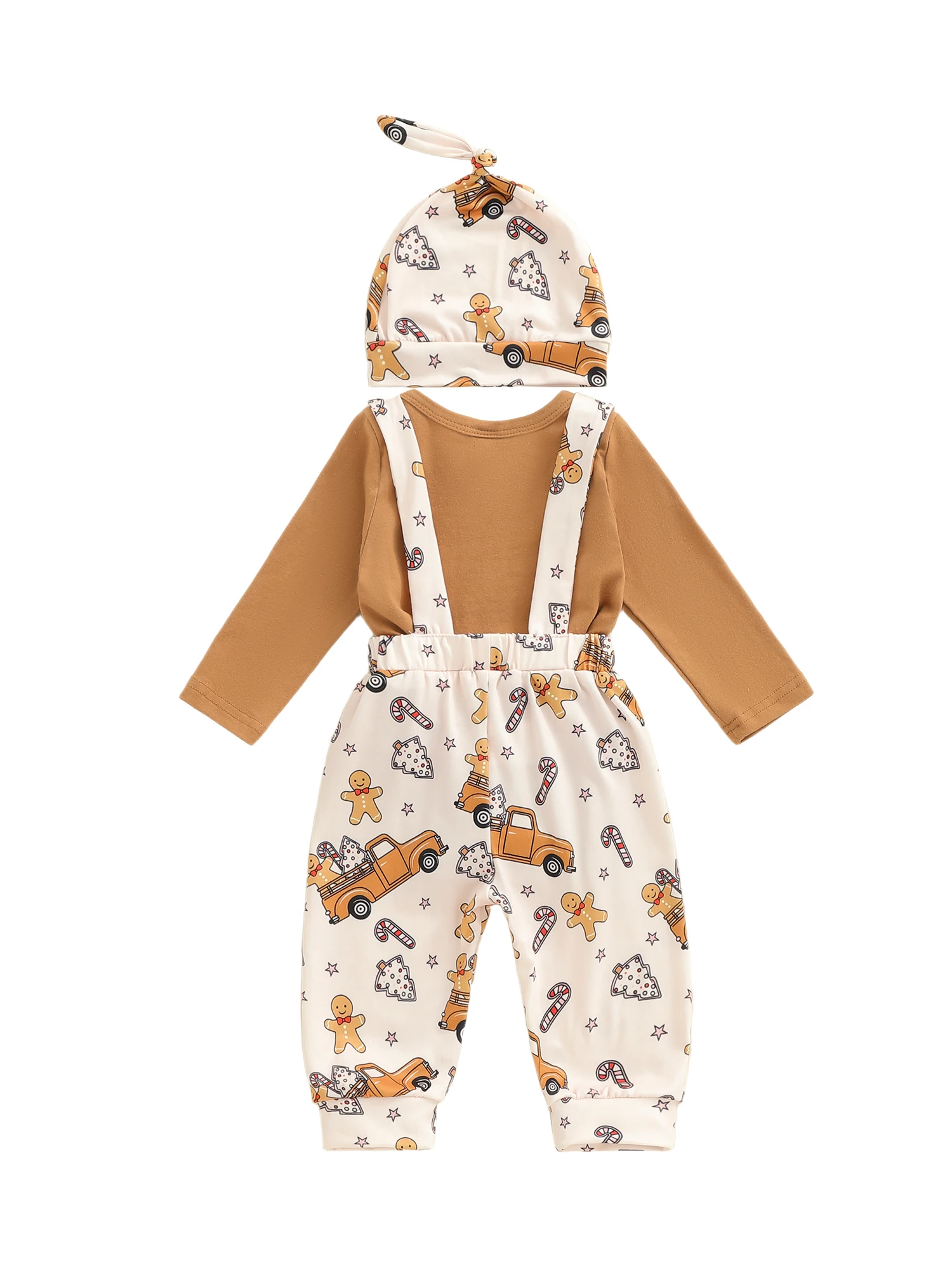 Conjunto de 3 piezas de ropa para bebés, mameluco de manga larga con cuello redondo, pantalones con estampado de Papá Noel/pan de jengibre, sombrero
