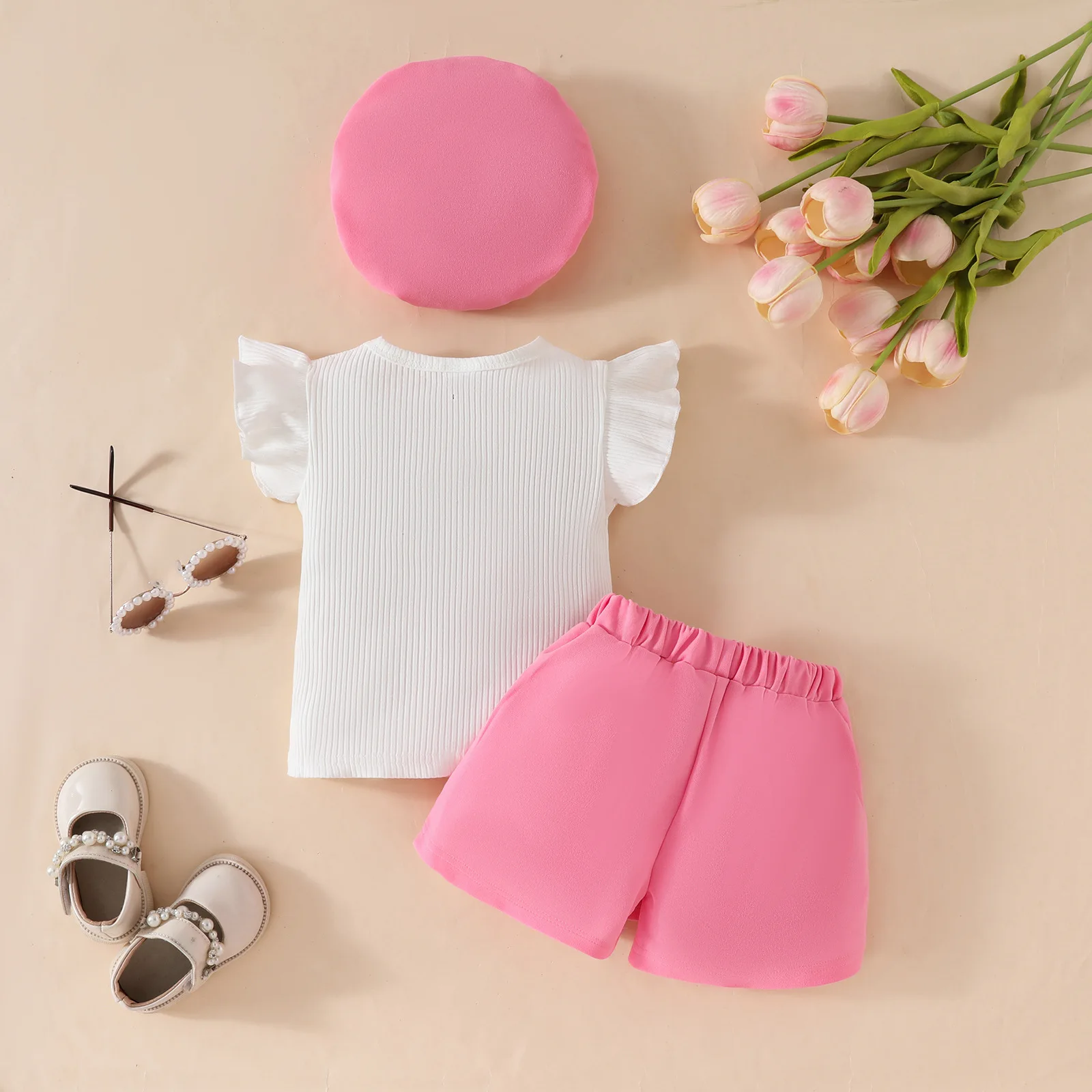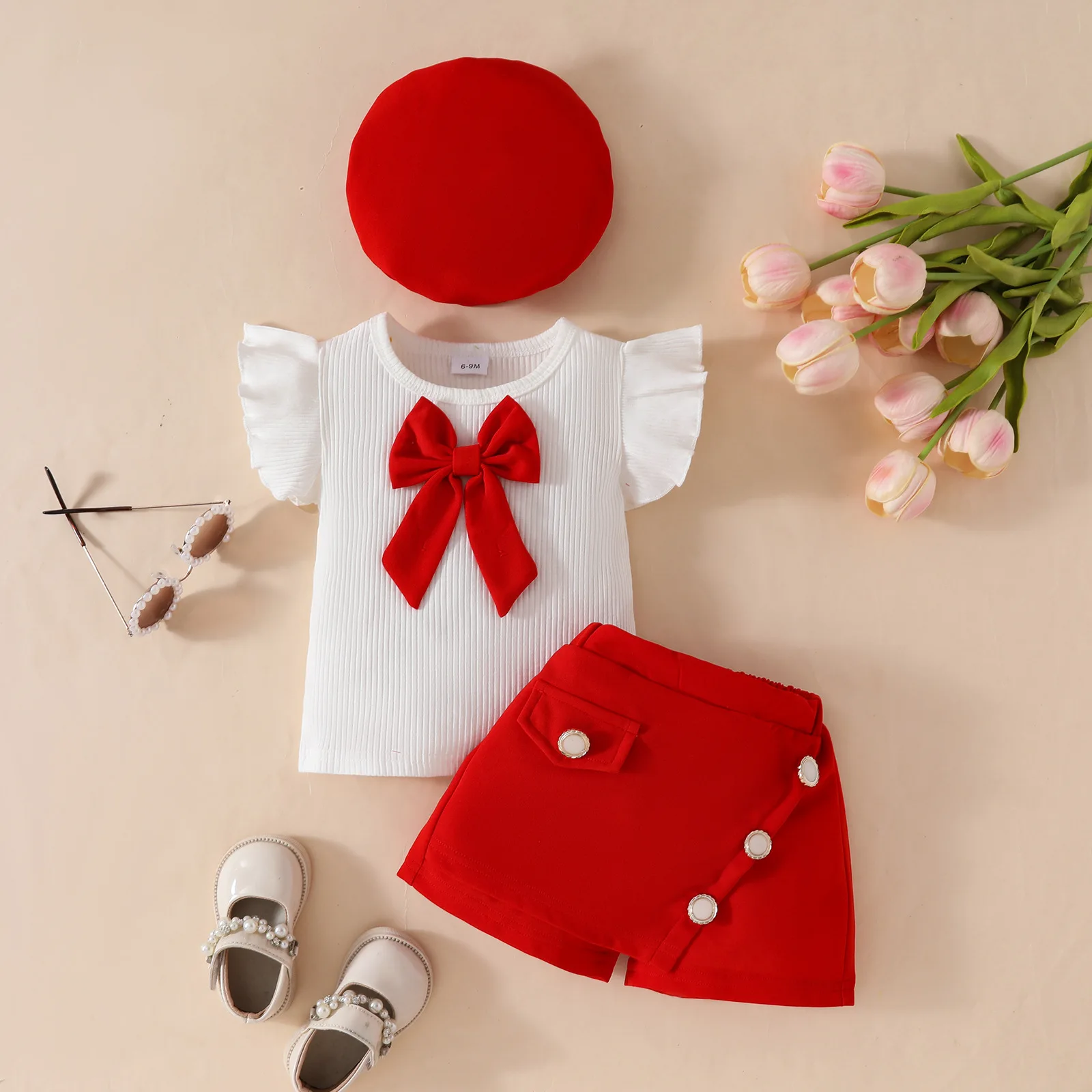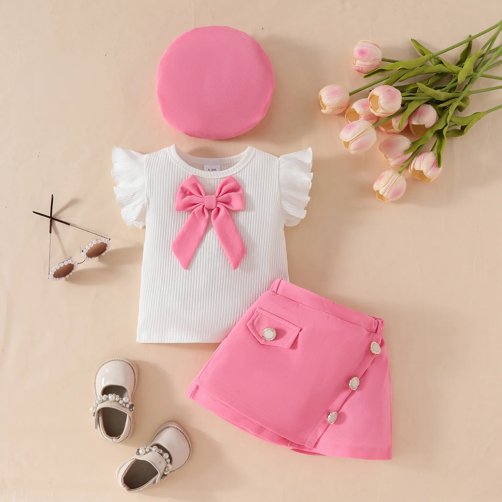 Conjuntos de 3 piezas para niños, ropa de verano para bebés, moda coreana, bonito lazo sin mangas, Tops blancos de algodón, pantalones cortos y sombrero, artículos para recién nacidos BC884